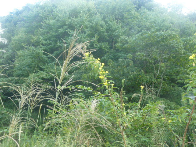 花盛りのソバ畑を抜けると、今度はヒガンバナが真っ盛りだ。 今回、皆さんが期待しているナンバンギセルの花情報が無い。それでも全員がススキをかき分け捜すと「見つけた」の歓声が、株は小さいが、それも数か所に。 そしてススキの中にはタムラソウの花も。 近くにはツリガネニンジンやイボクサの群生、ススキと背丈を競うメマツヨイグサ、ヨウシュヤマゴボウの実、ウメモドキの赤い実、ノコンギク、アキノタムラソウの花も。 キンエノコロやチカラシバの同種だけが群生している草地では、「地味なイネ科の雑草も良いですね」の声が・・・