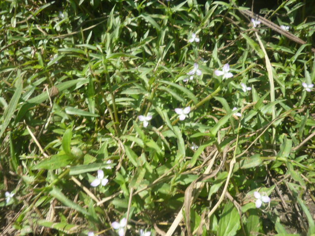 先ず森の館前の広場では、キンミズヒキやアレチヌスビトハギ、キツネノマゴの花が真っ盛り、広場一面に広がるカゼクサ、メヒシバ、シマスズメノヒエ、キシュウスズメノヒエ、タチスズメノヒエ、キンエノコロ、アキノエノコログサなどのよく似たイネ科の植物をその違いを確認しながらの観察。  法道寺川では、その川底、岸部にアブラススキやオオクサキビ、ジュズダマの背が高いイネ科植物とマメアサガオ、ホシアサガオのボントクタデの花が混然となって覆いつくしている。
