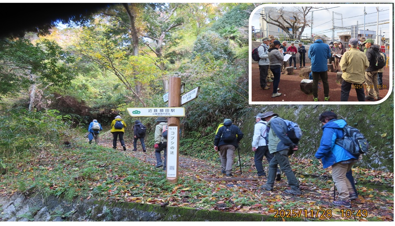 恰好の紅葉狩り日和。近鉄奈良線額田駅裏の広場に部会員19名と地質学の佐藤氏が集合。生駒山を形づくる斑レイ岩(生駒石とも呼ばれる)の観察である。広場に置かれた4つの丸椅子は都合のよいことに斑レイ岩そのもの。先ずは、表面の斑晶の色や形を観察し、風化の進んだ側面を手で触り、この岩石の特徴を頭に刻む。準備体操の後、急坂を歩いて枚岡公園に入り、更に進んで額田山展望台(標高249m)に到着。途中2ヶ所で道路壁の土の表面に垣間見る斑レイ岩をしっかり観察。昼食後、眼下に拡がる大阪平野と淡路、六甲、北摂の山並みを見渡し、それぞれの地形の成り立ちに思いを巡らせる。帰路は枚岡神社まで別ルートで進む。途中、深紅の豊浦橋のたもとで立ち止まり、渓谷の佇まいと今が盛りの紅葉に息を飲む。若干疲れはしたが、枚岡神社で身も心も洗われ、心地よく生駒山を後にした。