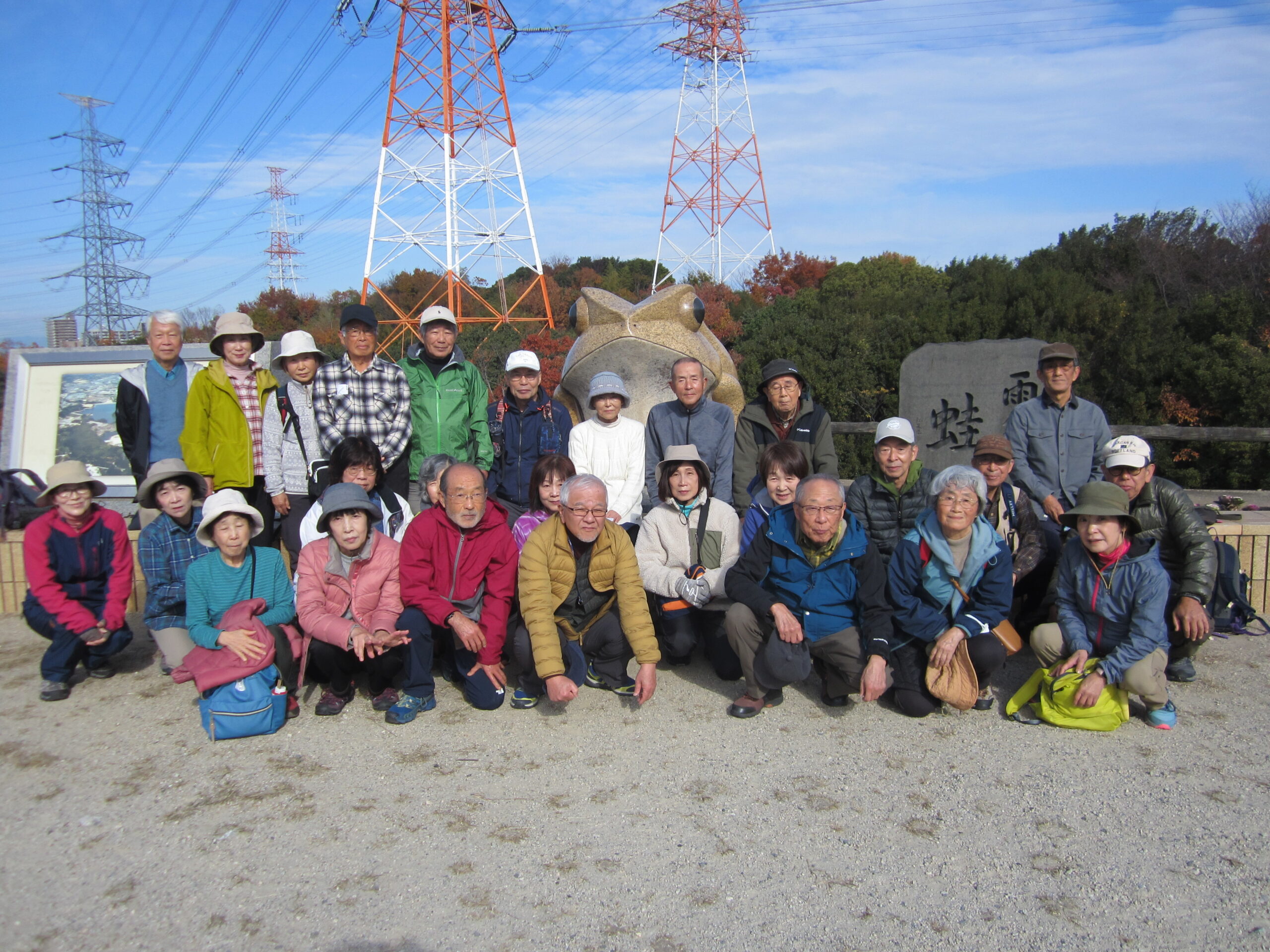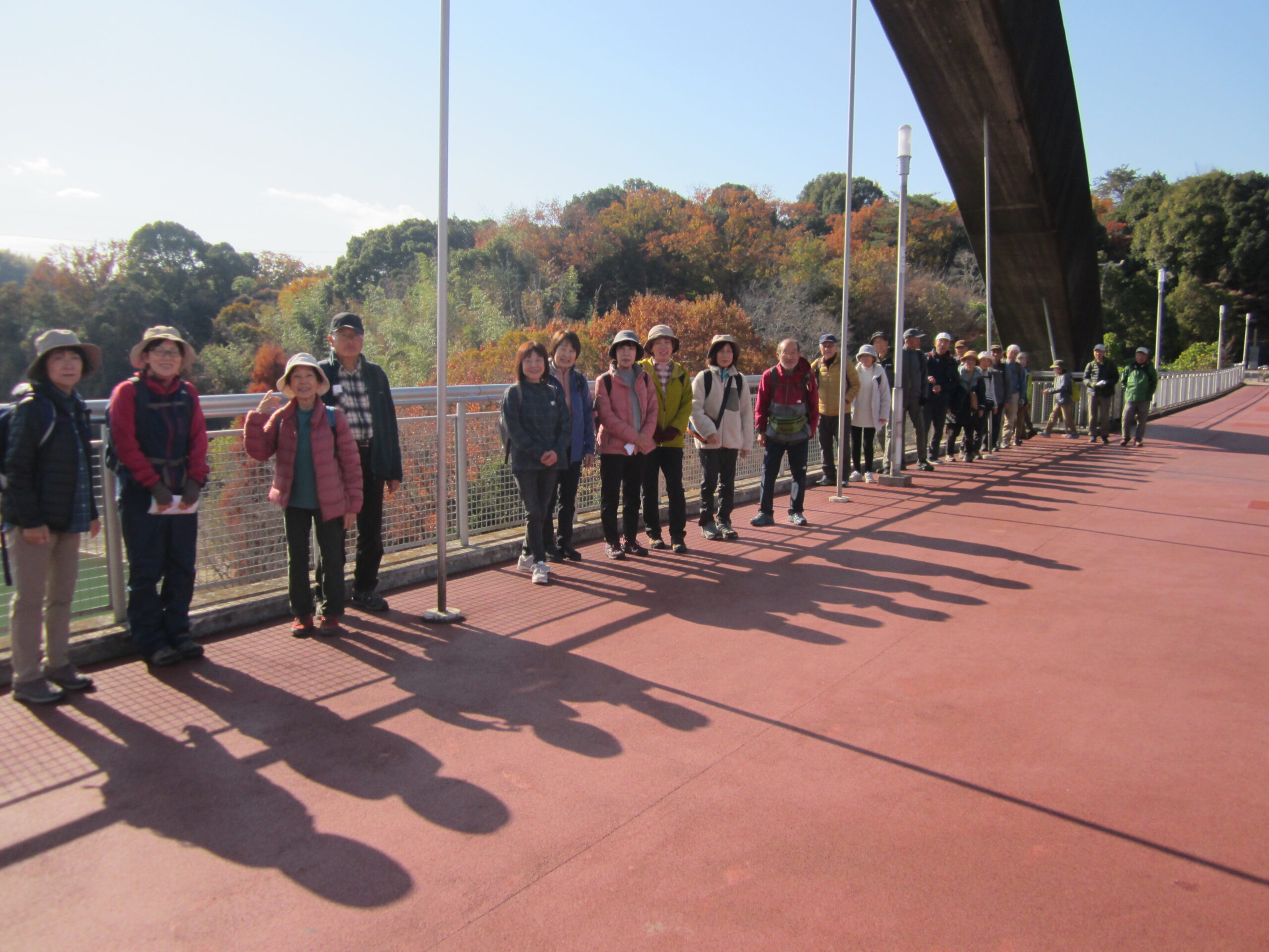 その後、マガモ等が泳ぐ明るい水面の光明池を見ながら、池の周りを通る水辺遊歩道を歩く。周りの木々は緑の木と紅葉した木が美しく混在していた。そして、長い遊歩道を歩いて緑地公園の広場に到着。風もなく暖かい中で美味しく昼食を取る。昼食後、光明池大橋を通って帰路に着いたが、当大橋の上から池を見ると水面を泳ぐ大きな鯉を発見。鯉は10匹程いて黒いもので、中に1匹白いものがいてゆうゆうと泳いでいた。そして、栂・美木多駅を目指して遊歩道等を歩く。駅前に到着後、怪我等がないことを確認して解散した。