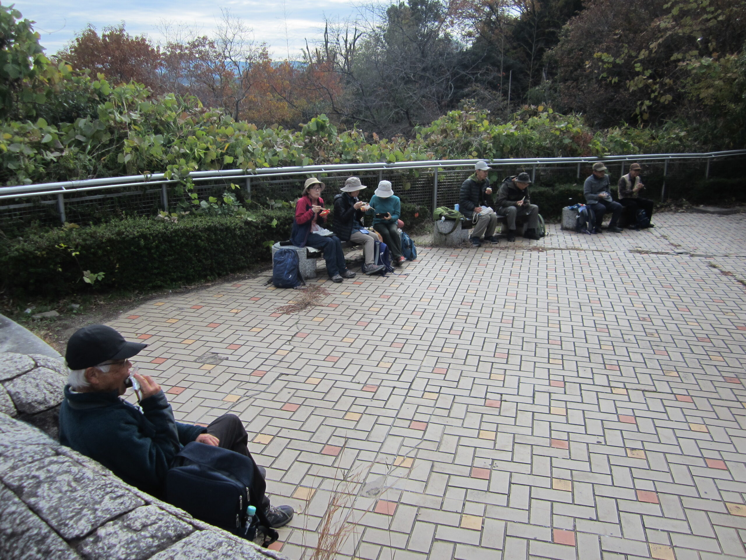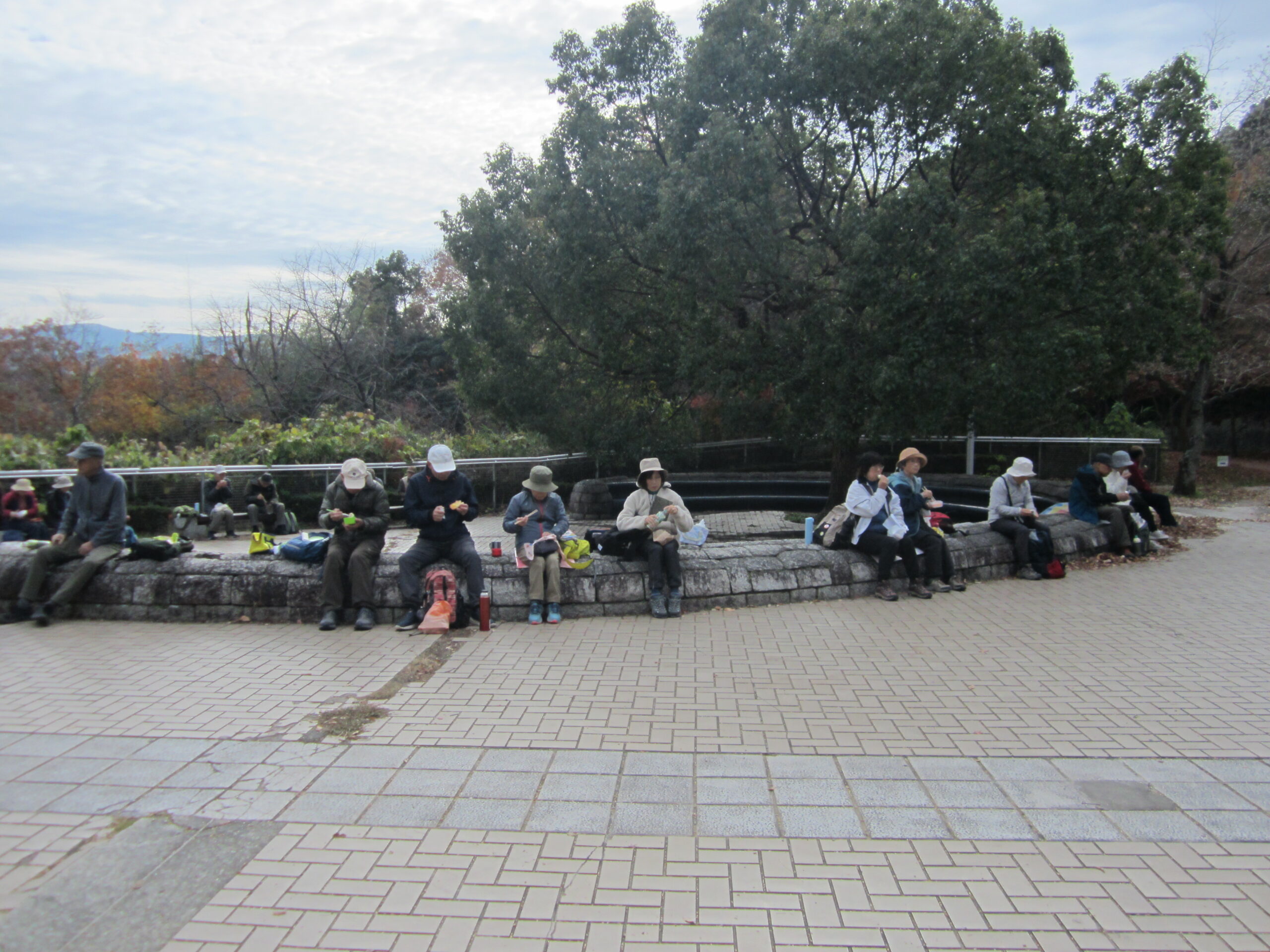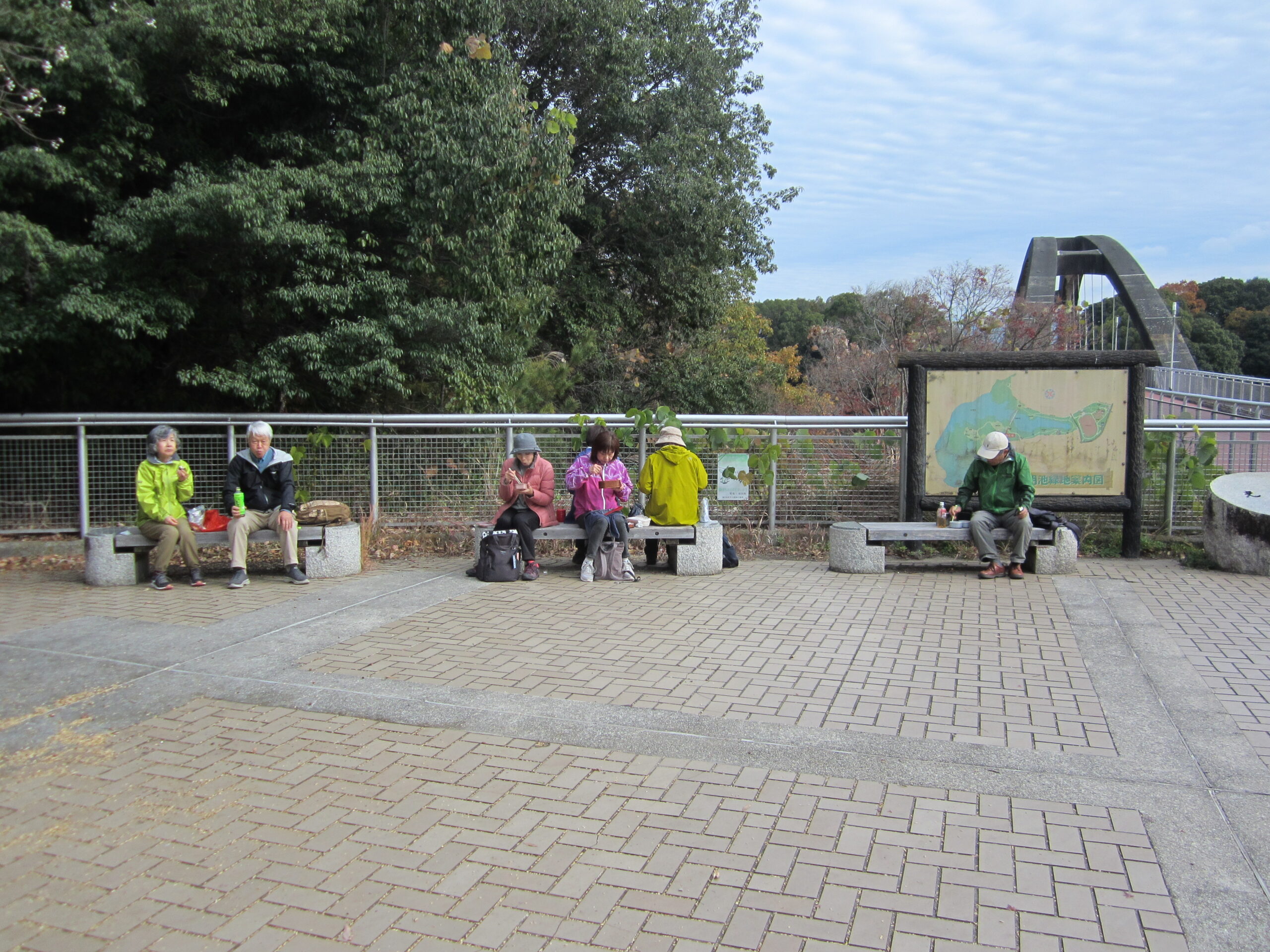 その後、マガモ等が泳ぐ明るい水面の光明池を見ながら、池の周りを通る水辺遊歩道を歩く。周りの木々は緑の木と紅葉した木が美しく混在していた。そして、長い遊歩道を歩いて緑地公園の広場に到着。風もなく暖かい中で美味しく昼食を取る。昼食後、光明池大橋を通って帰路に着いたが、当大橋の上から池を見ると水面を泳ぐ大きな鯉を発見。鯉は10匹程いて黒いもので、中に1匹白いものがいてゆうゆうと泳いでいた。そして、栂・美木多駅を目指して遊歩道等を歩く。駅前に到着後、怪我等がないことを確認して解散した。