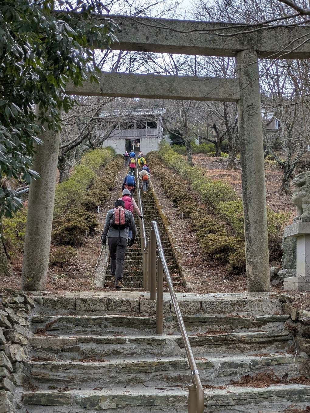 高野線橋本駅を出発後、定福寺から黒河道(高野七口の一つ)を辿り、紀ノ川・金剛山系のビューポイント経て、2時間10分で国城山に到着。国城神社境内で昼食。