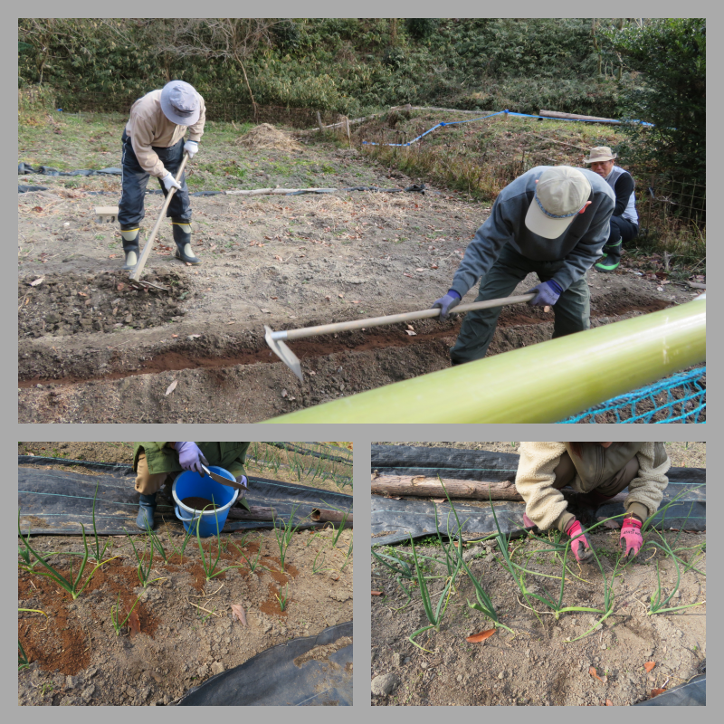 里芋収穫後の畝に肥料を入れながら しっかり耕しました。硬くなっていた畝が柔らくなり、ジャガイモの植え付けをしました。捲れかかっている防草シートを直し、畝の周りの雑草も除去し、柵造りも進み、次の野菜つくりの準備ができました。エンドウ豆が霜よけの藁に守られながら、空に向かって伸びてきています。暖かくなれば、ぐんぐん伸び、たくさん実をつけてくれると思います。玉ねぎの苗も寒さに耐え、春を待ち望んでいるようです。