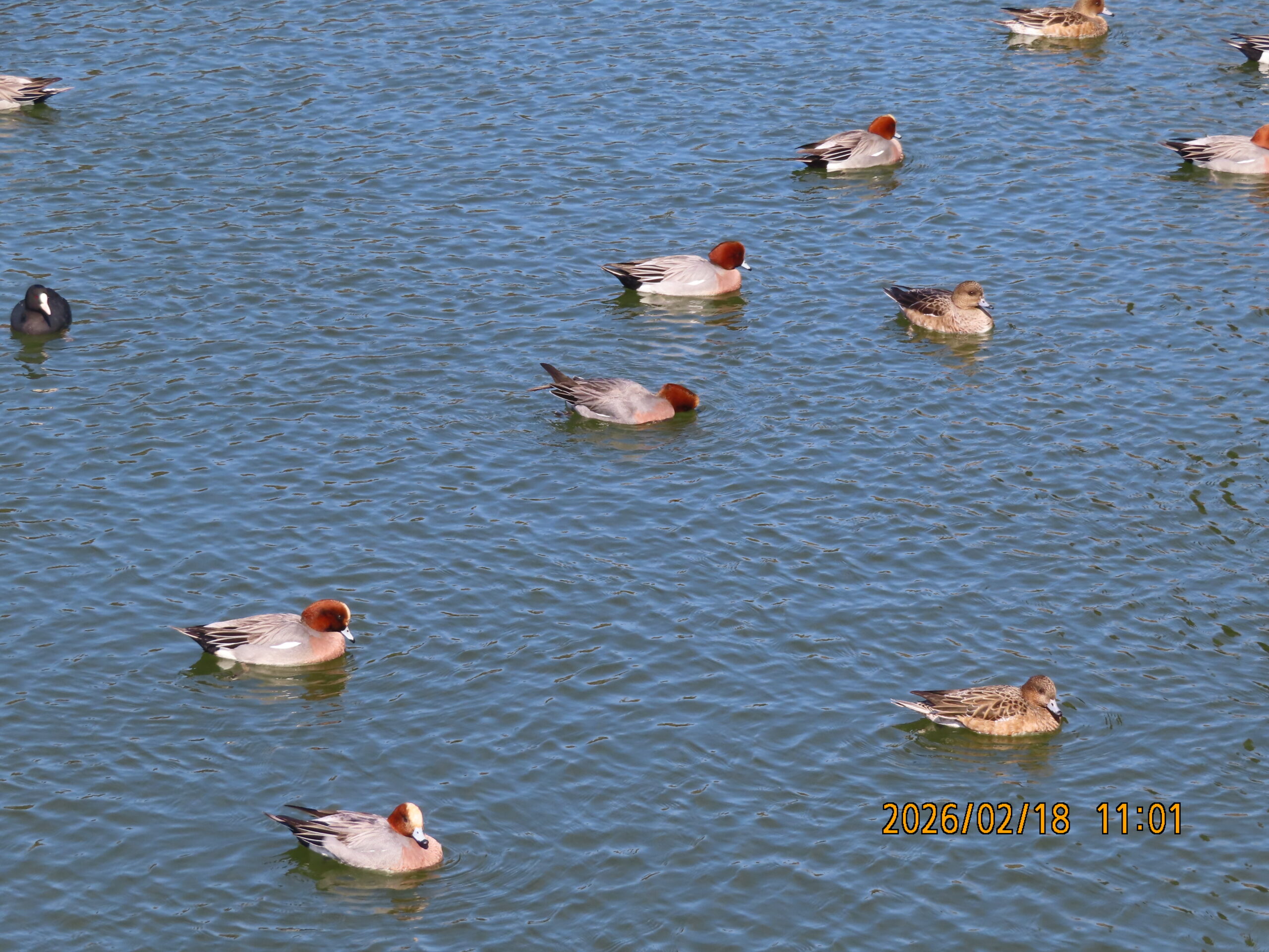 奥の池でようやくカモの姿を見る。しかしヒドリガモの群れも例年より数が相当少ないようだ。その他にはキンクロハジロの小集団とオオバン、遠くにマガモ、ヨシガモとオシドリが数羽、樹陰から出入を繰り返すのを確認。 池の近くにシジュウカラの囀りと姿を見て、「池畔の広場」ではメジロとコゲラの混群に出会う。