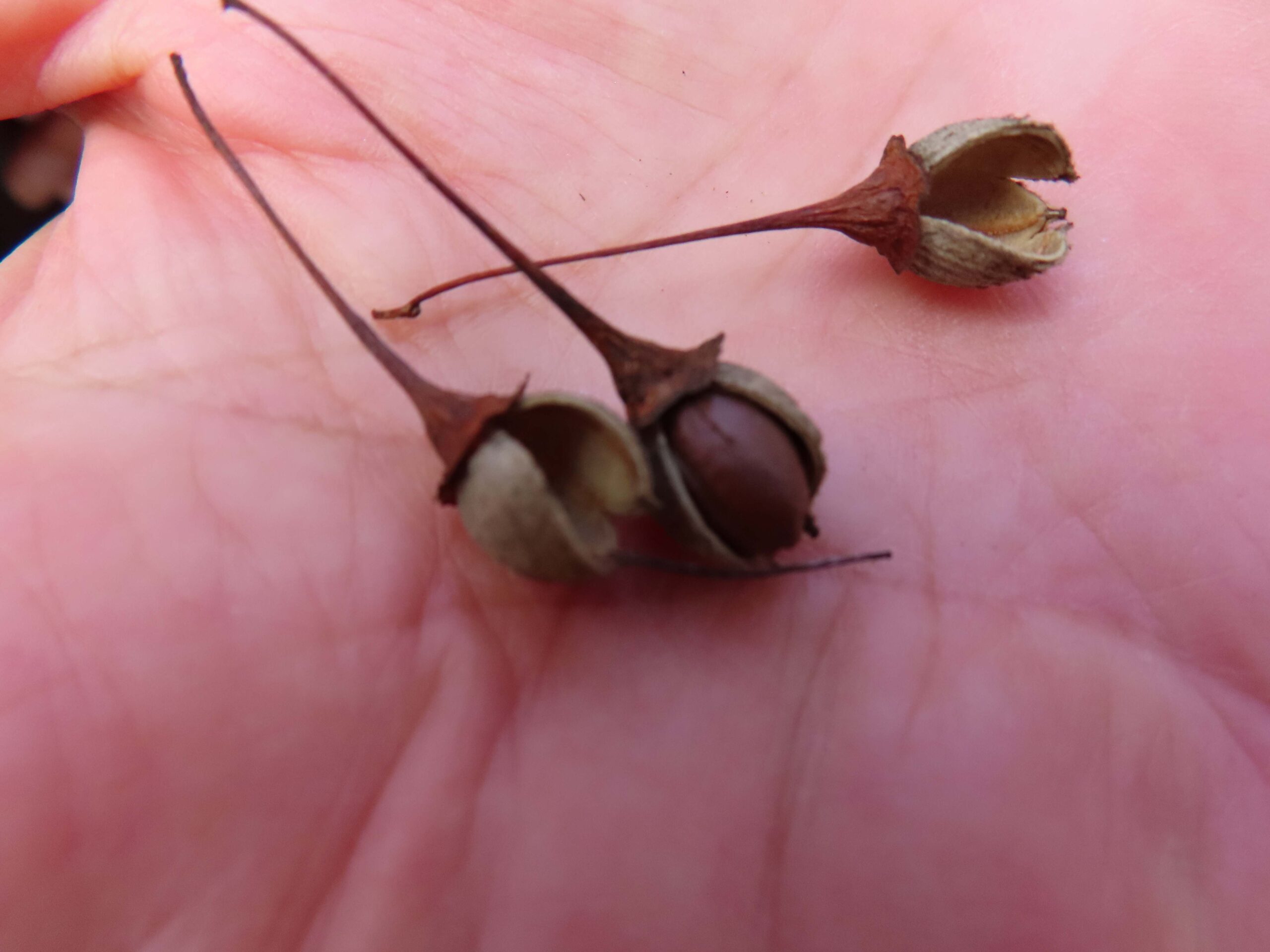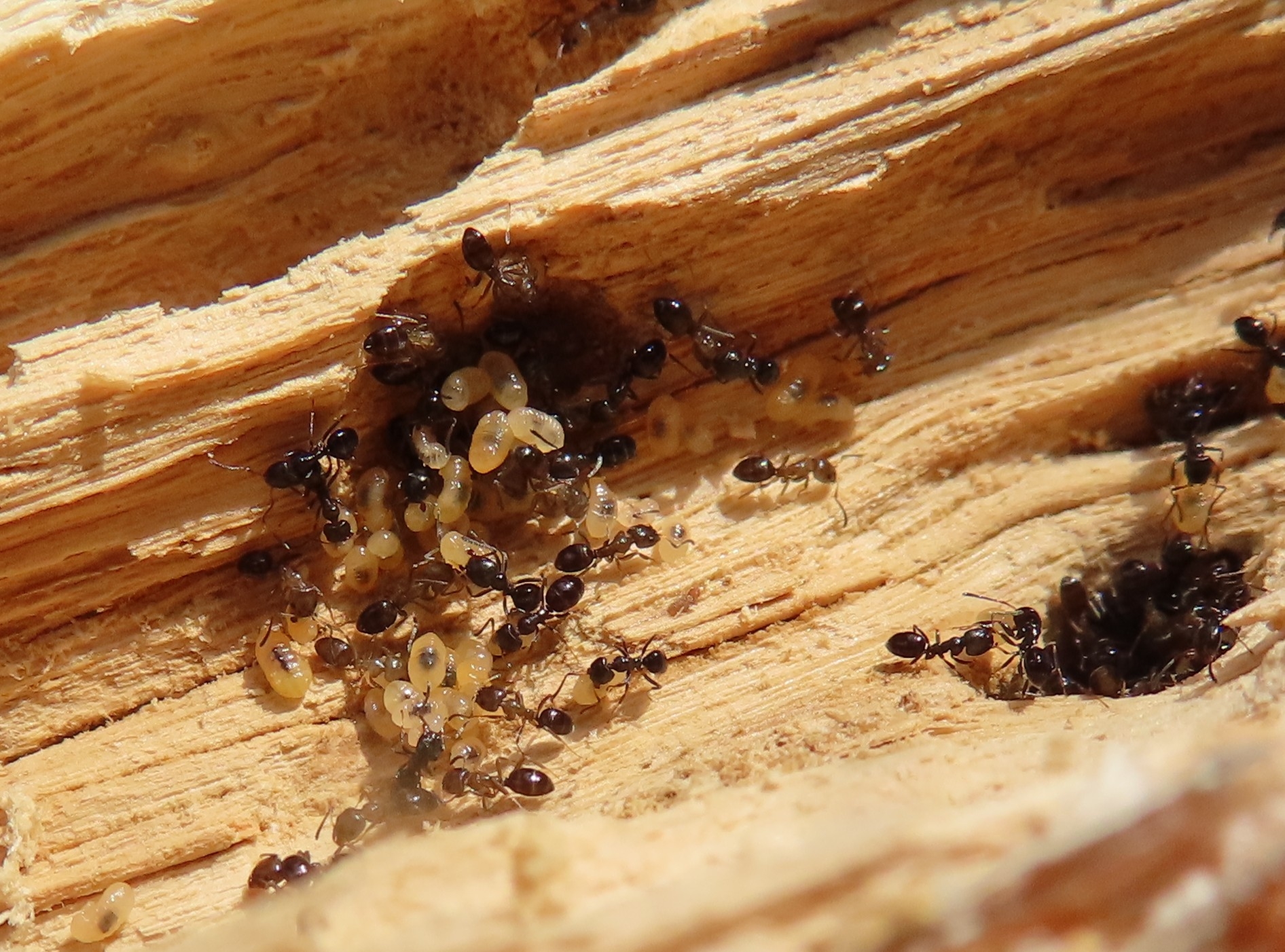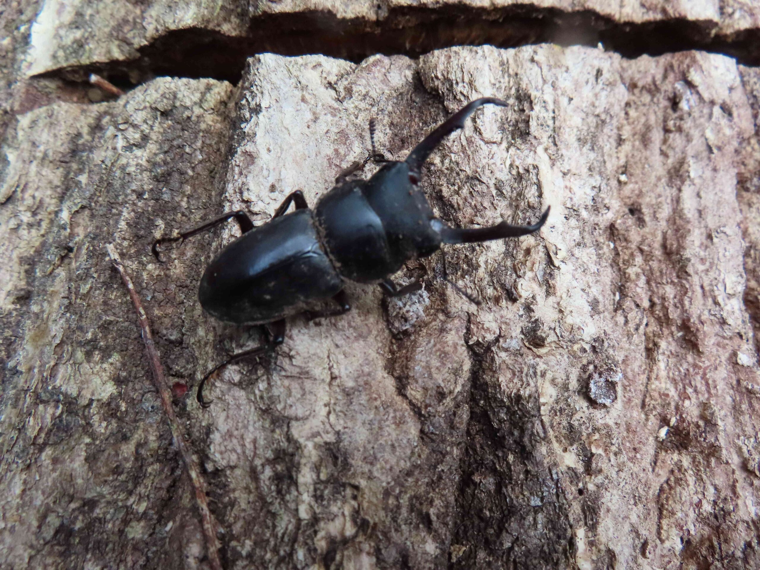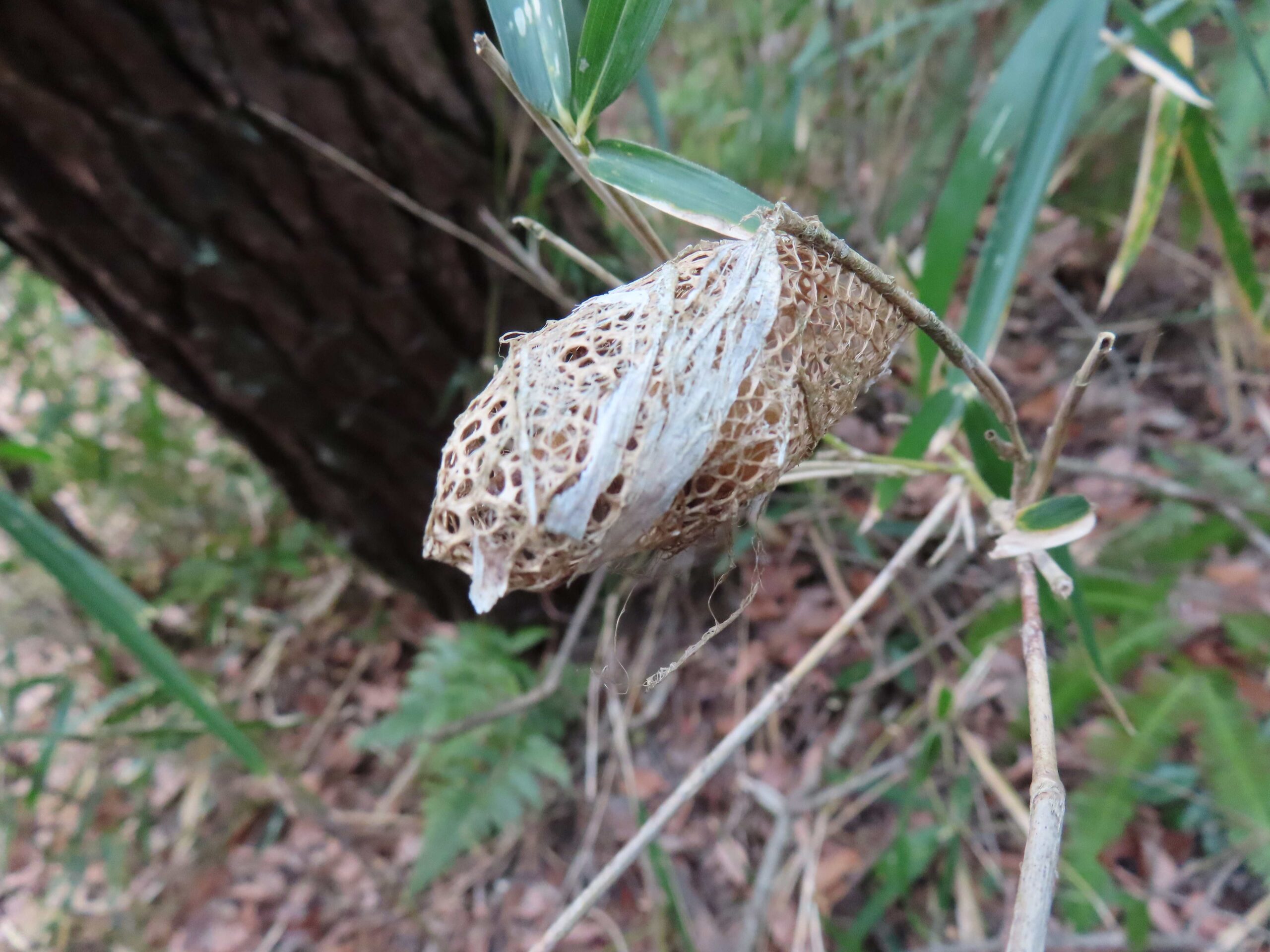 この時期生き物たちはどのような状態で生きているのでしょうか? 特に、冬の時期にはほとんど見かけない昆虫たちはこの時期は卵?幼虫?蛹?それとも成虫?冬越しの形を二十八の瞳で確かめようと探検開始、最初に集合場所の東屋近くの桜の木の幹にハラビロカマキリの卵嚢を発見。次にエゴノキの実を観察した後遊具のある広場で、クヌギの剝がれそうな皮をめくるとカメムシやゲジゲジのような虫、小さいゴキブリなどが潜んでいた。また、クワガタムシを見つけようと情熱を燃やす部会員(Nさん)が近くに落ちていた枯れ枝を割ると、そこはアリの巣だったようで無数のアリとその幼虫がいた。その後の森の中で、積み上げられた木の間にナメクジ、ダンゴムシやキノコムシの仲間などが観察された。そしてNさんが遂に見つけたとコクワガタ、を皆に見せてくれて午前の観察を終えた。