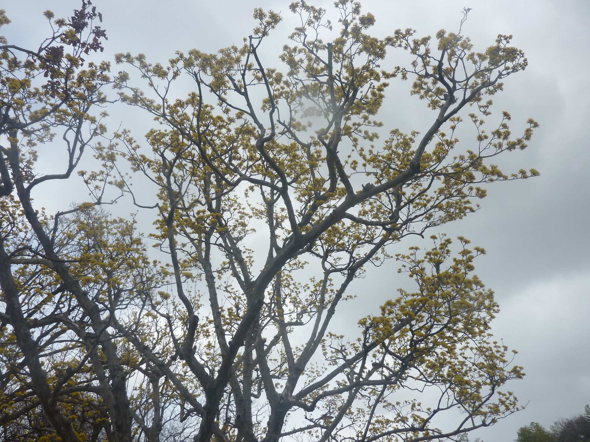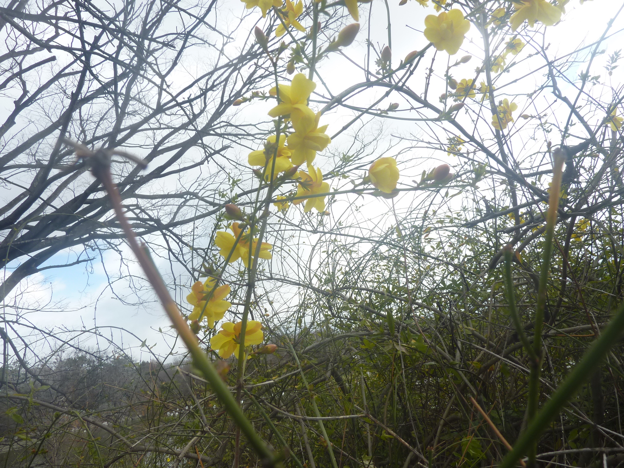 花数は少ないがジュウガツザクラは開花中で、その近くのアンズの木は枝いっぱい蕾を付け開花を待つ。 ギンヨウアカシアは遠くからでも花がよく目立ち黄金色の花を樹全面につけている。 後で知ったがミモザと呼ばれるのはフサアカシアのこと、複葉小葉の付き方と色がギンヨウとは違っているとのこと。