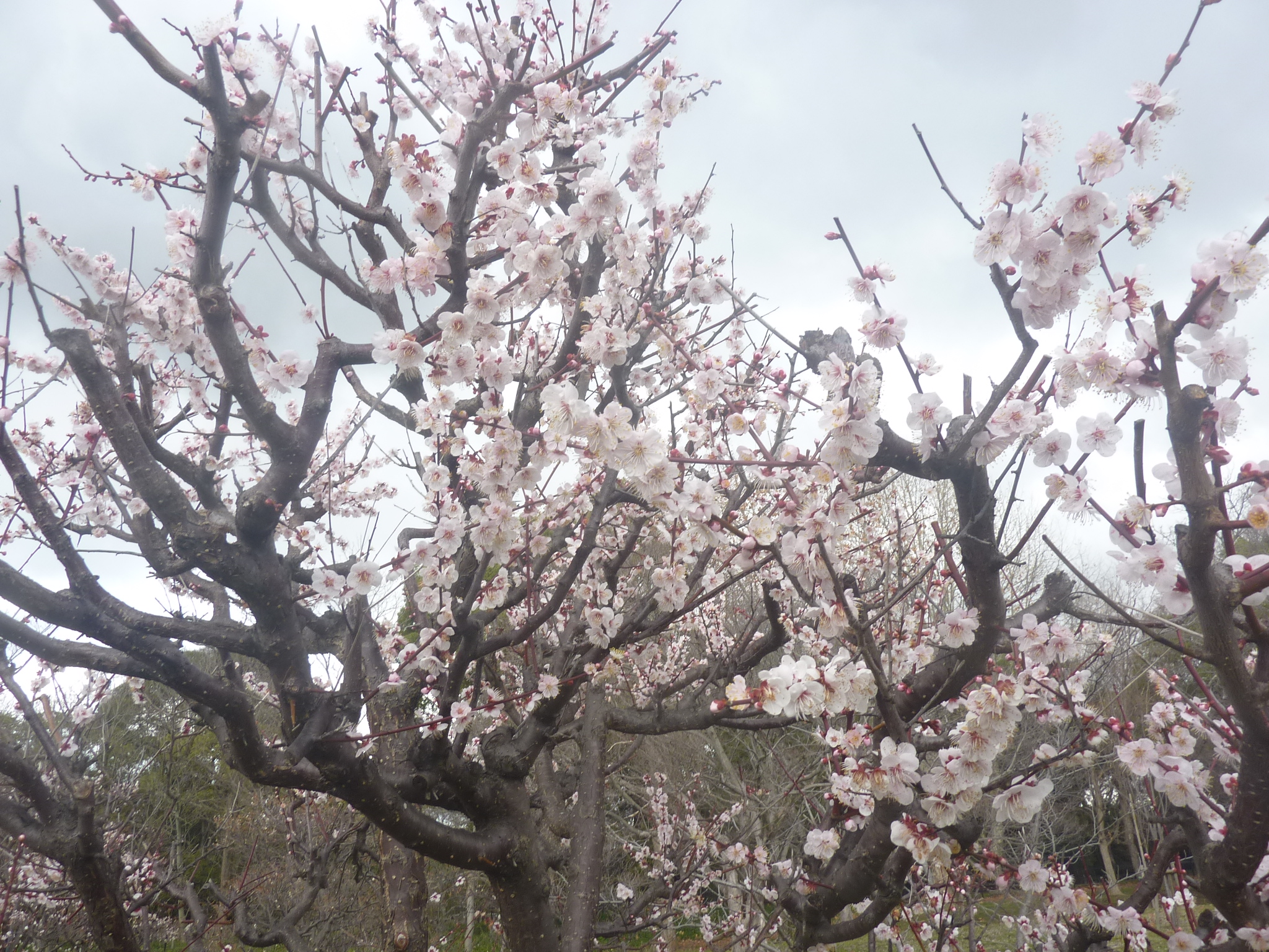 裸のラクウショウ並木を通り過ぎ、最初のポイントはウンナンオウバイ(雲南黄梅)、まだ黄花は咲き初めたばかりだ。このウンナンオウバイはオウバイモドキとの別名があり、花はウンナンの付かないオウバイより1か月ほど遅く、オウバイは落葉樹だが、このウンナンオウバイは常緑樹。 次の梅園では、多くの品種が盛りを過ぎていたが一部の花は見事に待っていてくれた。その隅にオオカンザクラの花が満開で、一際目立っている。ここで、梅と桜の花の付き方の違いを確認。