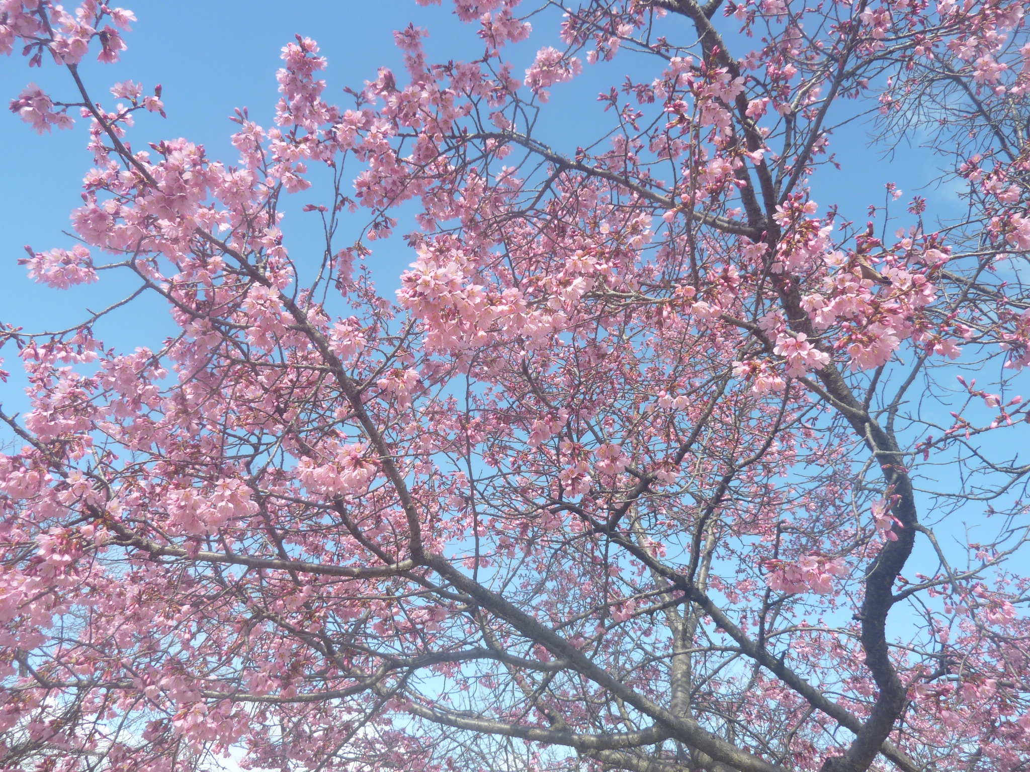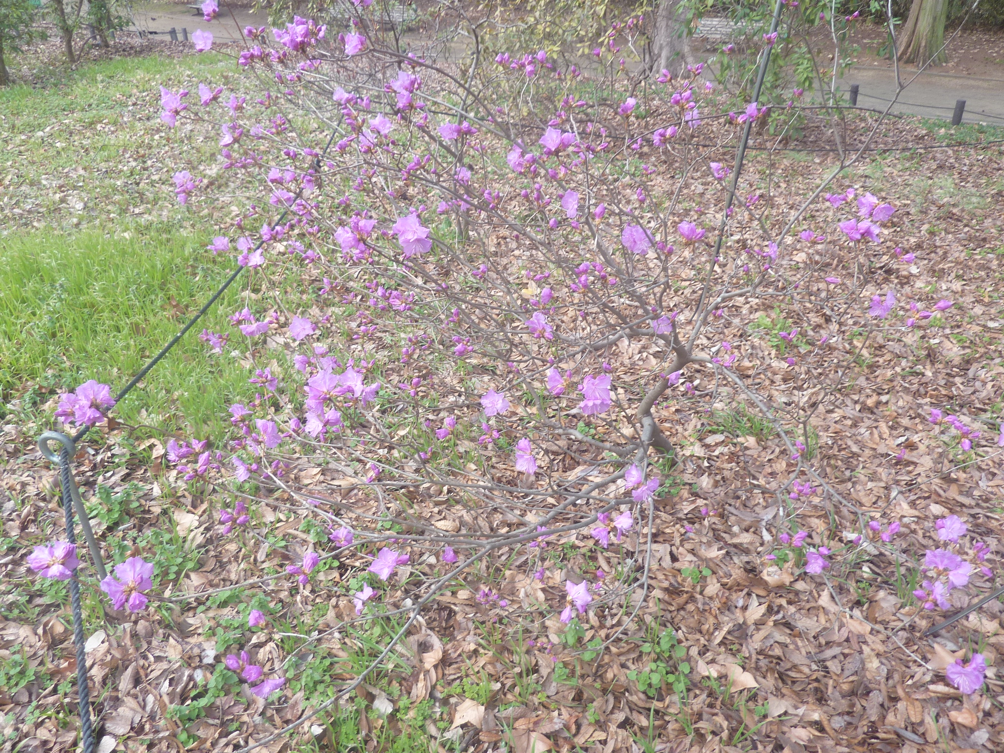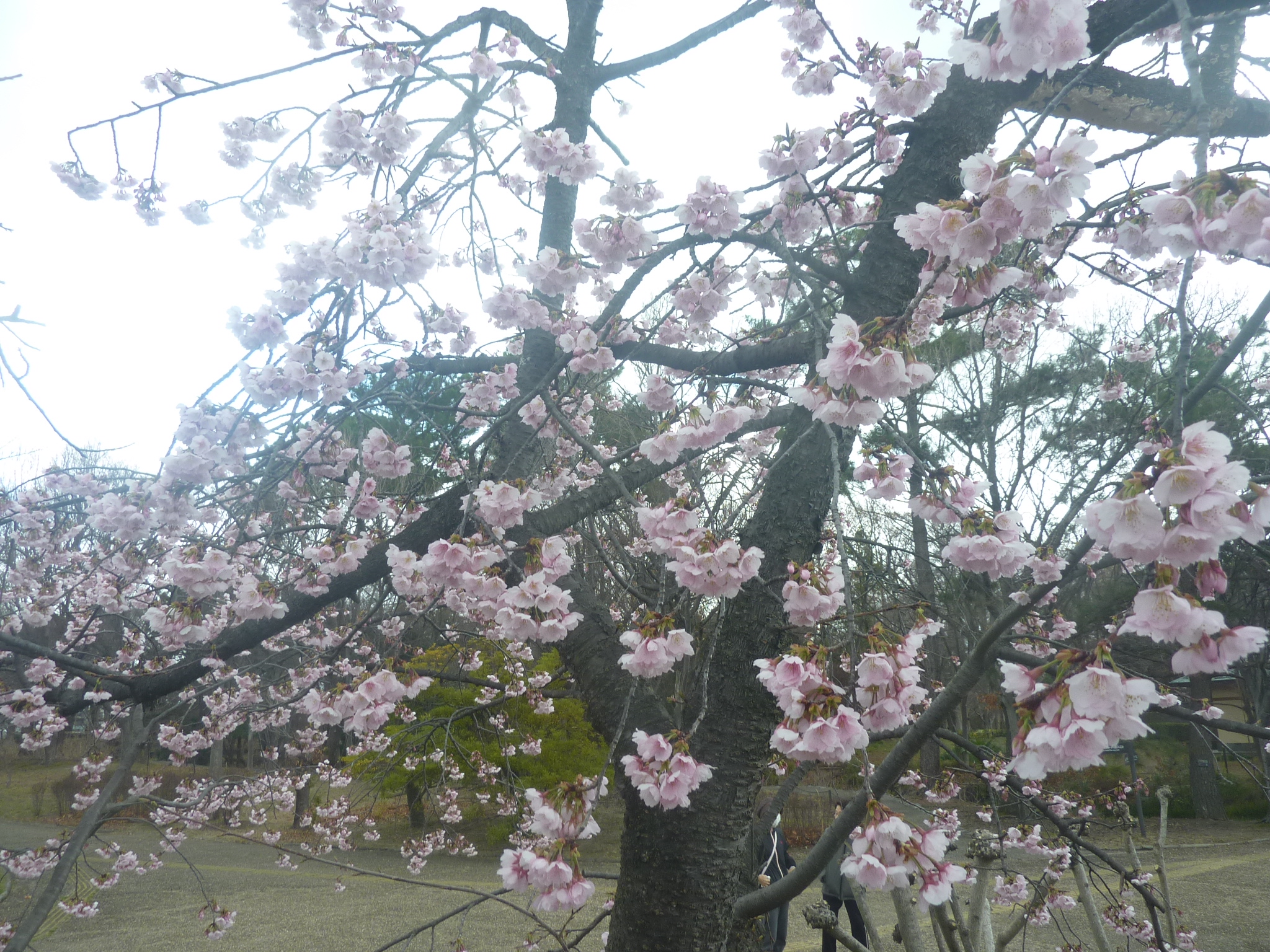 園内のカワズザクラも外のものより小ぶりだが満開状態。その近くの早咲きのゲンカイツツジも咲き始めている。 最近に万博会場から移植されたというコブクザクラは小さな花を付け始めていた。この桜は10月頃から開花すると説明されていたが、移植したばかりで花付きが悪いようだ。
