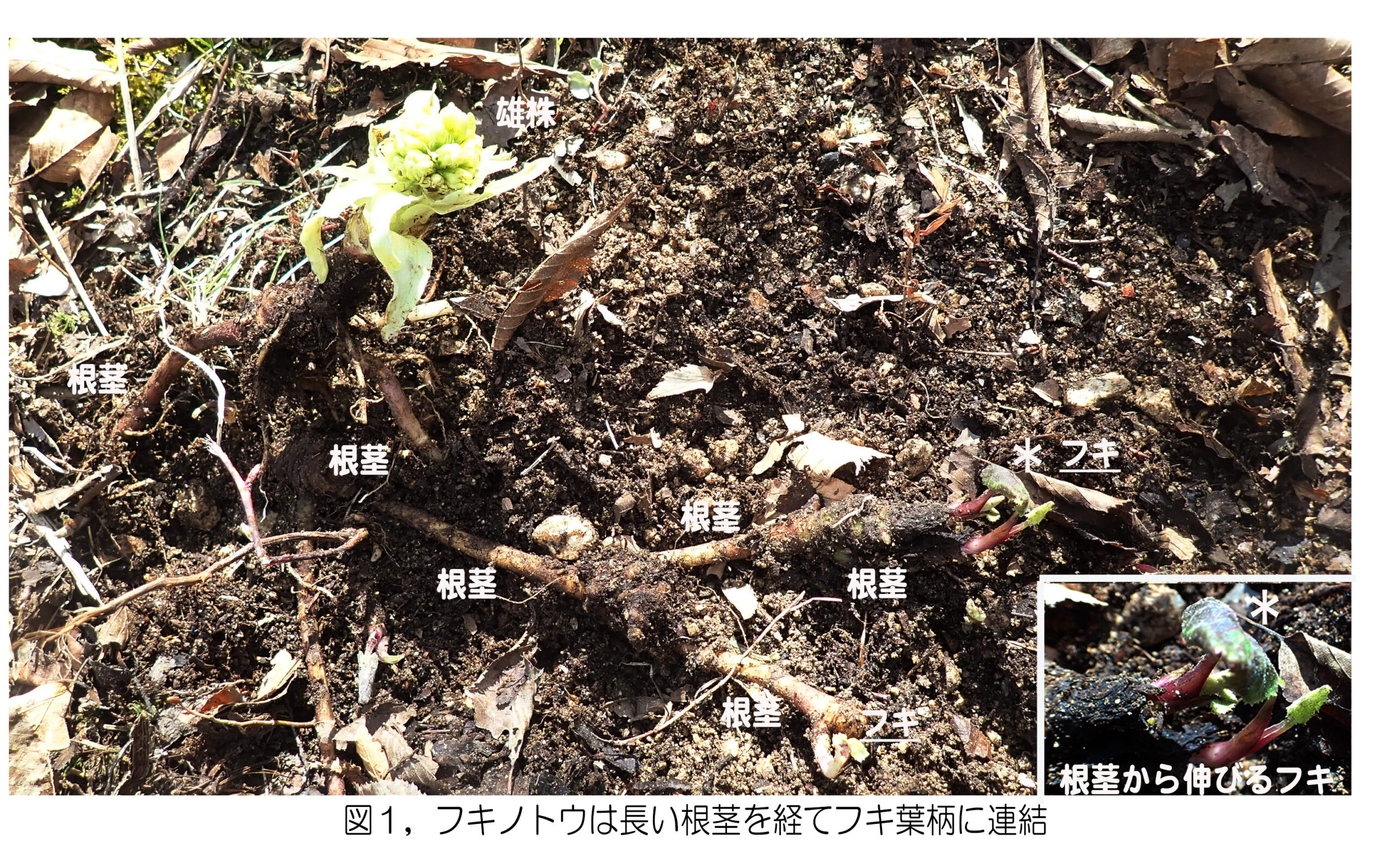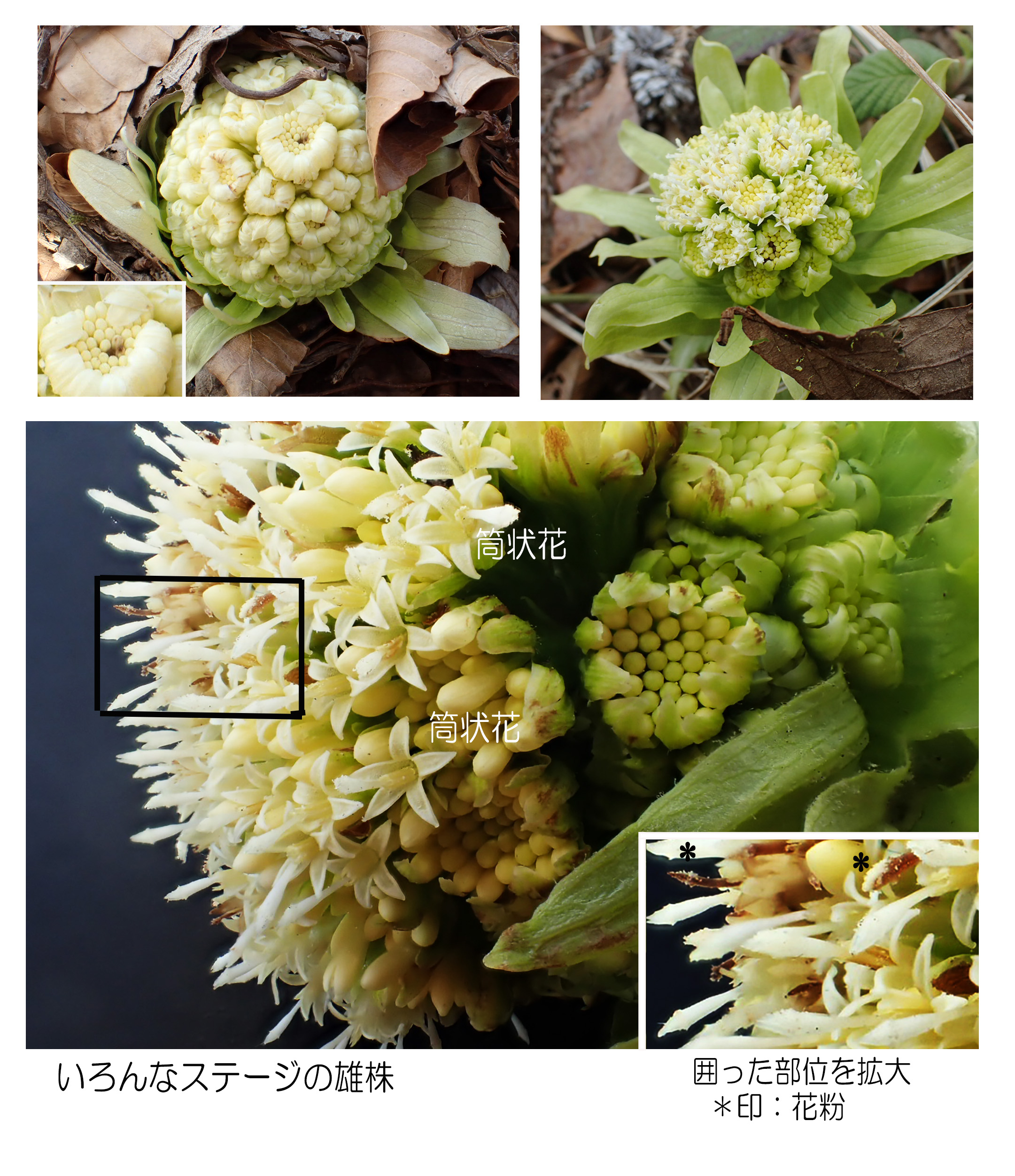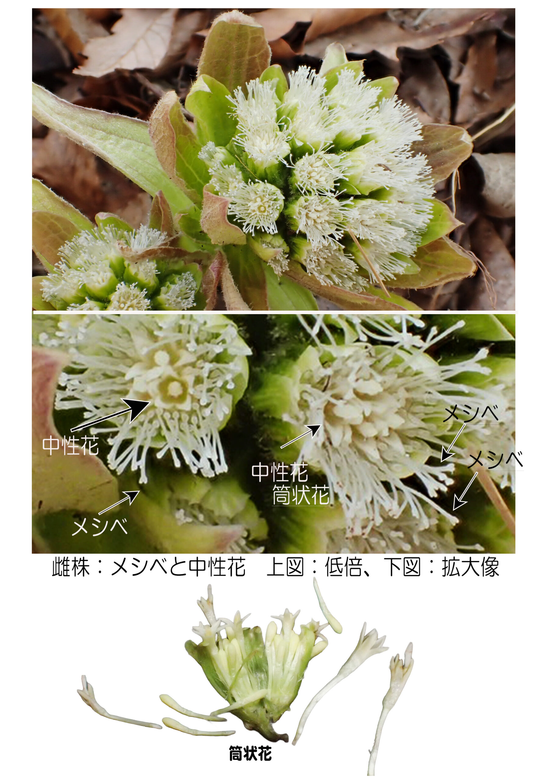 今回目指すはフキノトウ。フキは野山に自生する、キク科、多年草、雌雄異株。フキとして食するのはフキの葉柄。そしてそのフキ根茎に、葉に先だって早春に咲く花がフキノトウである(図−1)。フキノトウは雌雄異株で茎先に多数の頭花をつける(図−2)。オバナは星様の花びらを持つ筒状花で、花粉を持つ。その筒の中には虫が好む蜜を多量にため込み、虫を呼び込む(図−2)。蜜を求めてやってきた虫たちは、体に花粉をつけて飛び立つ。他方メバナは糸状で白く繊細な形状(図−3)。雄花と異なり、虫を呼び込むための花粉も蜜もない。虫を引きつける魅力に欠ける。どのようにして虫を呼び込むのだろうか。雌株のフキノトウはメバナの間に少数のダミー雄花(中性花)を混在させている。このダミー雄花は真の雄花と同様の星形形状を持ち、虫が好む蜜を分泌する。オシベ、メシベはあるが、これらは単なる見せかけ。性的機能はない。中性花のもつ蜜と、オバナに似せた形状に引き寄せられ、花粉をつけた虫たちはメバナを訪れ、花粉をメバナに運ぶ。自由に動くことのできない植物が、近親交配を避けるための工夫を、今までいろいろと見てきた。フキノトウは雌雄異株という形をとることで、近親交配を避け、多様な発現系をえた。種として安定して生存・進化できる利点を獲得した。