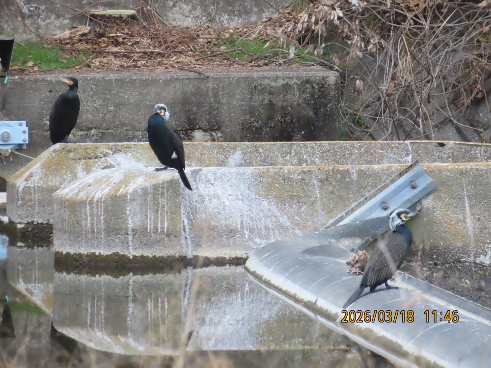 川沿いを歩くとキジの声も聞こえて土筆も出ていて春になりつつあると実感出来ました。川原で昼食です。カワウが数羽日差しを浴びて翅を乾かしていました。昼食後汐の宮にむかって歩くと対岸の屋根にイカルチドリが二羽くつろいでいる様子でした。水辺でばかり見ていたので屋根の上で見るのは初めてでした。その後公園で鳥合わせして解散でした。雨に会わなくてよかったです。