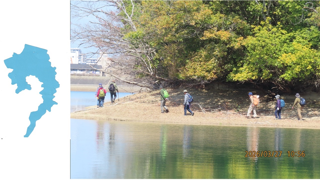穏やかな春の陽気に誘われて、光明池傍の空き地(墓地横駐車場)に29人が集合。大阪層群のレキ層や粘土層、火山灰層の観察である。先ずは地質学の佐藤氏の案内で展望台下、次いで対岸の大阪層群の露頭を観察する。そこから体育館前の広場に上がって昼食をとった後、アズキ火山灰に含まれる火山ガラスの標本(事前に準備したもの)をルーペで観察する。その後、光明池大橋の下まで歩き、はしごを頼りに水辺まで降りて実際のアズキ火山灰層を確認する。最後は光明池緑地運動場横まで行き、崖下のピンク火山灰層の露頭の観察であるが、今日はよく歩き、大阪層群の多くの地層をみた。話は粘土地盤の軟弱性や富士山噴火の際の災害の規模などにも及び、多くを学び有意義な一日となった。池の水が減り水辺を歩くことが出来たのは雨の少ない異常気象のせいであろう。また連日、水位を確認し、脚立はしごの準備をしてくれた平谷さんのお陰でもある。有難い事である。