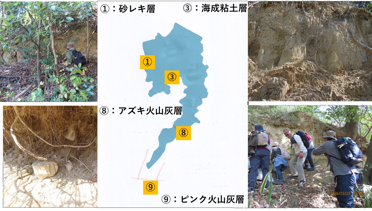 - ピンク火山灰層: 約105万年前に猪牟田カルデラ噴出したもので、白色・淡ピンク色、厚さ40~70㎝の層で、第1海成粘土層(Ma1)の上部にある。地殻変動により南から北に傾斜している。年代の古いピンク火山灰層が年代の新しいアズキ火山灰層よりも標高の高い場所にあるのはこの傾斜によるものである。