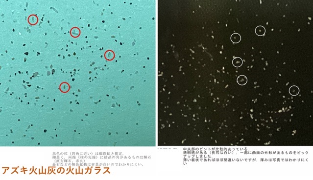 - 火山ガラス: 火山噴火時、マグマの液体部分が急冷して出来た天然のガラスである。今回は火山灰の水洗いを繰り返し、粘土粒子を除去した後の砂粒を試料とした。ルーペの観察で無色透明のゆるく湾曲した平板状のガラスが確認された。 (I . S)
