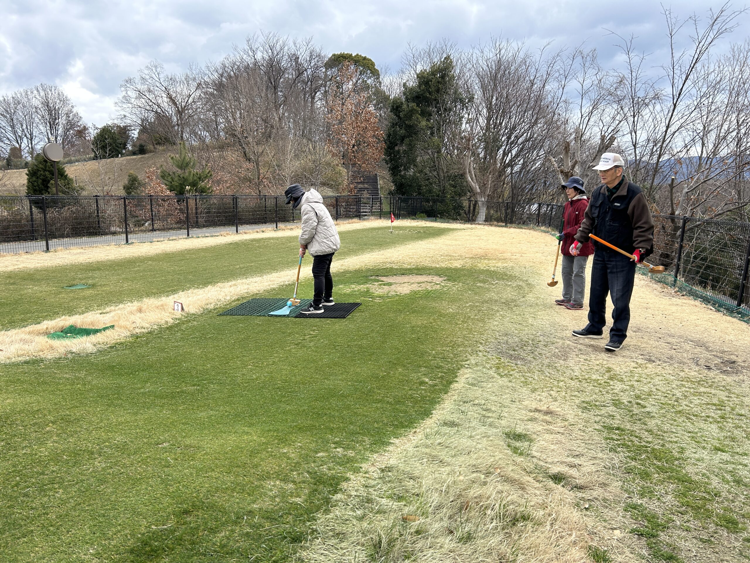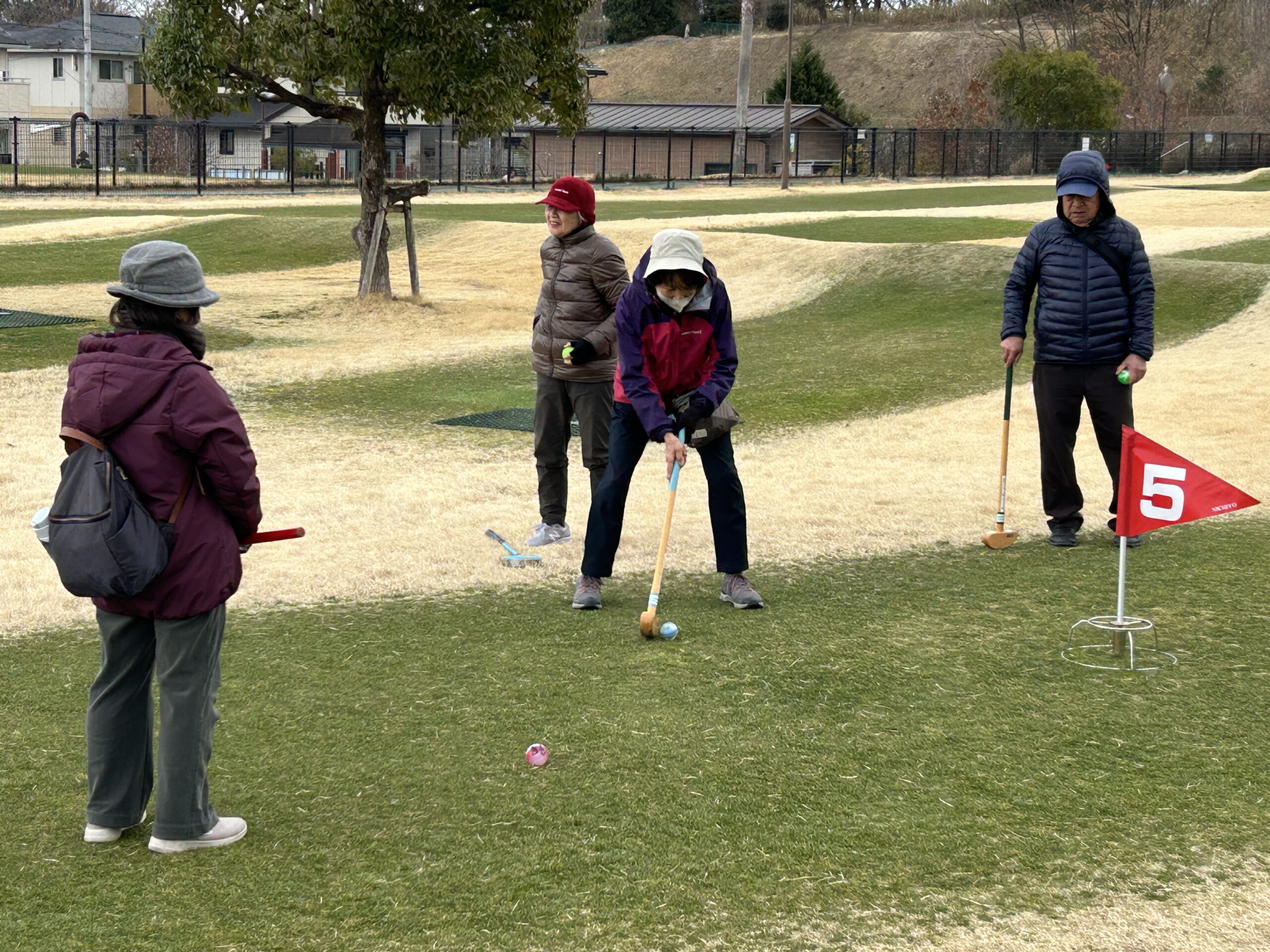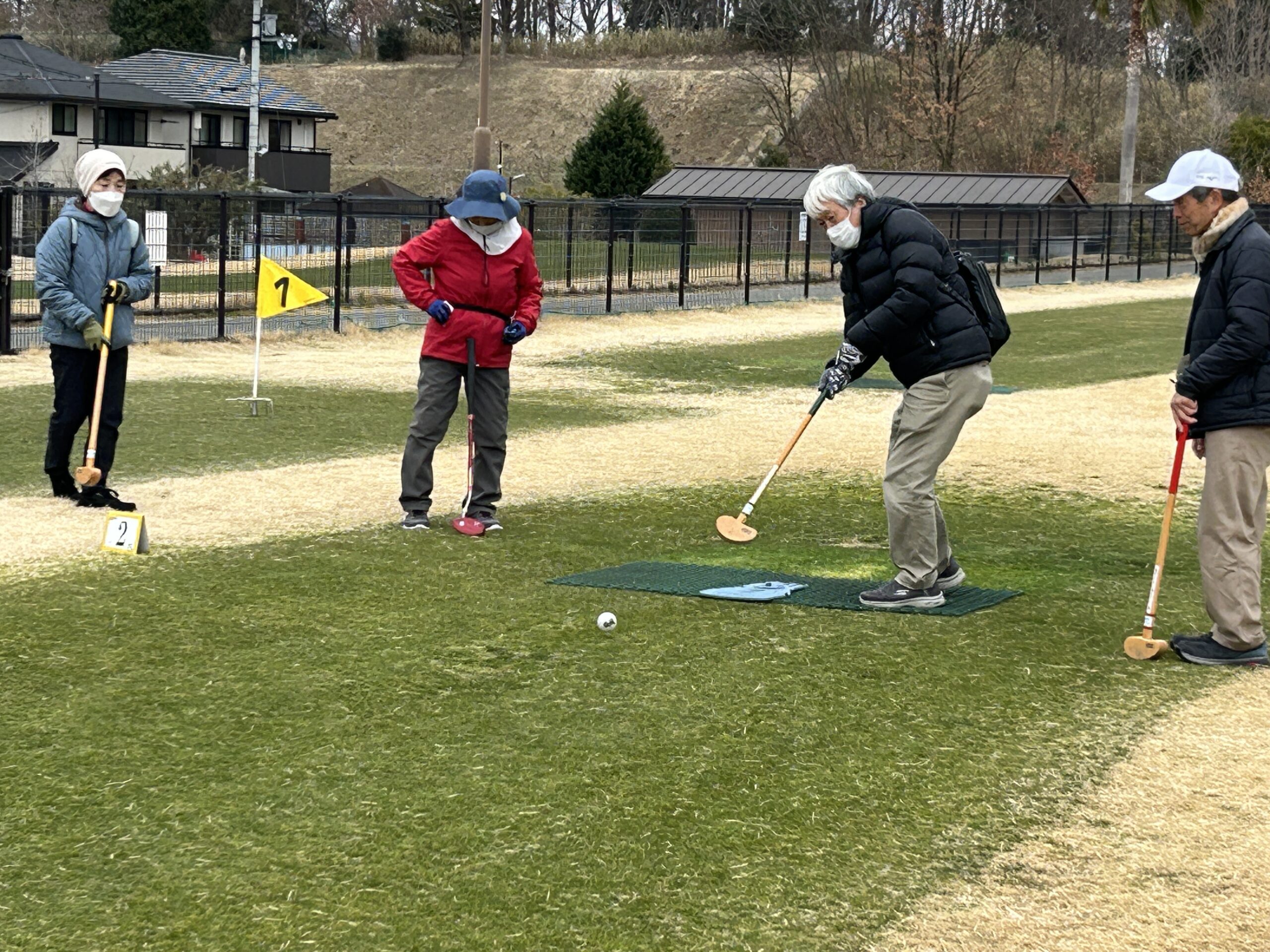 まず、ルール説明を受けますが初心者がほとんどなのであまりよくわかりません、此処のコースは競技会も行える本格的な芝生コースですので整備もよく行われており綺麗です。使用するボールはプラスチック製で固く、クラブも同じくでホッケー競技のスティックに似ています。何しろ初体験者ですので空振り、ダフリなどなかなか難しい。OBなどの連発ですが2~3ホールでそろそろ慣れてきましたが最後のホールに近づいてから入れるのが強くなったり弱くなったりでなかなか大変。でも猛者もおりなんとホールインワン達成者もでましたね、みな和気あいあいで楽しめた一日でした、競技後は近くのスーパーや道の駅で昼食後解散となりましたが、まだ残って再挑戦者もいましたよ。この競技にはまった人もいたんでは? (S.H)
