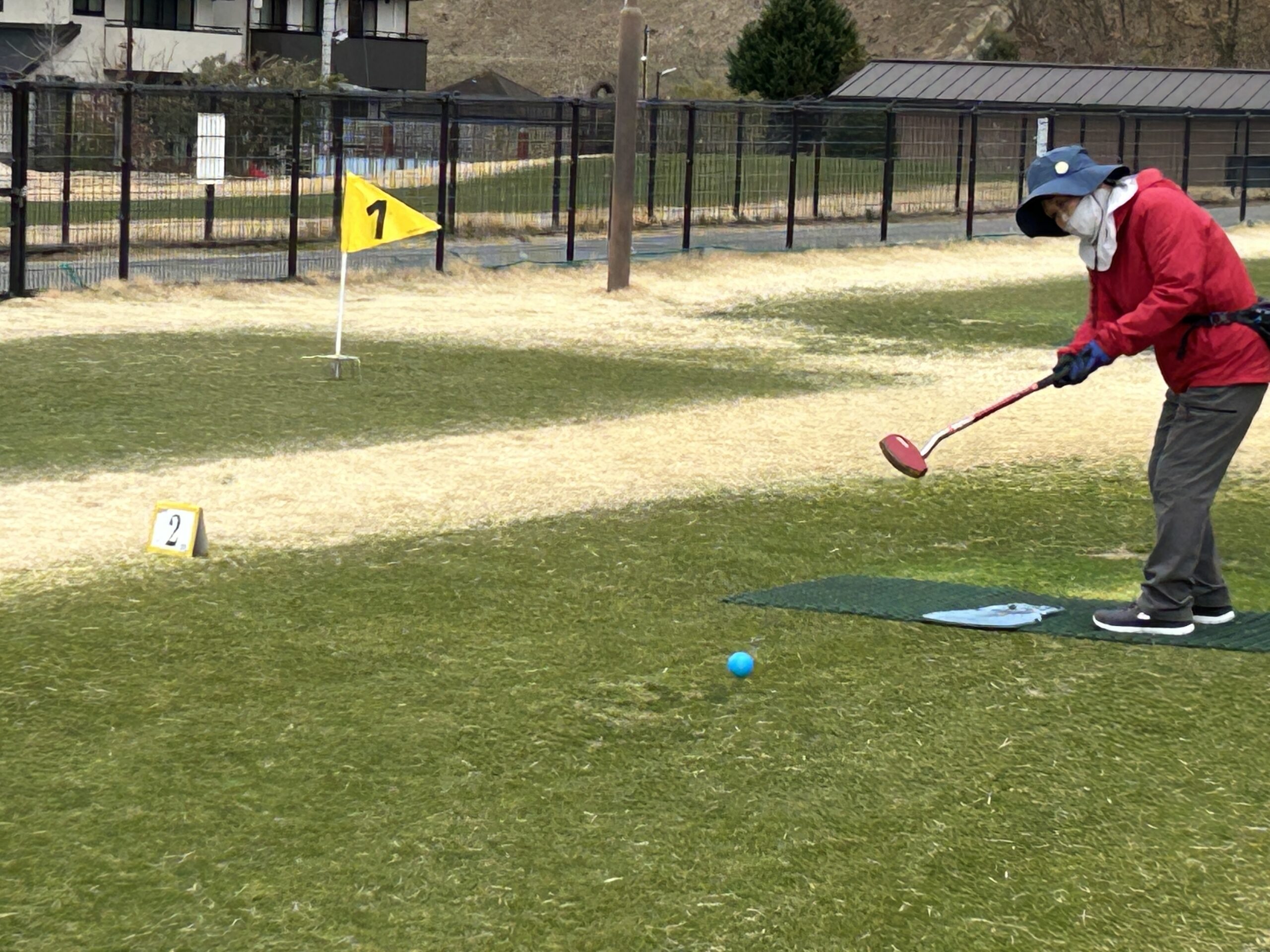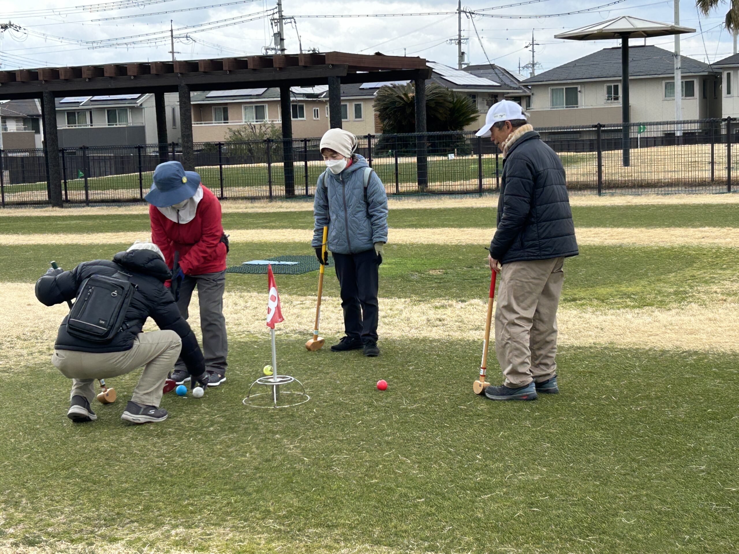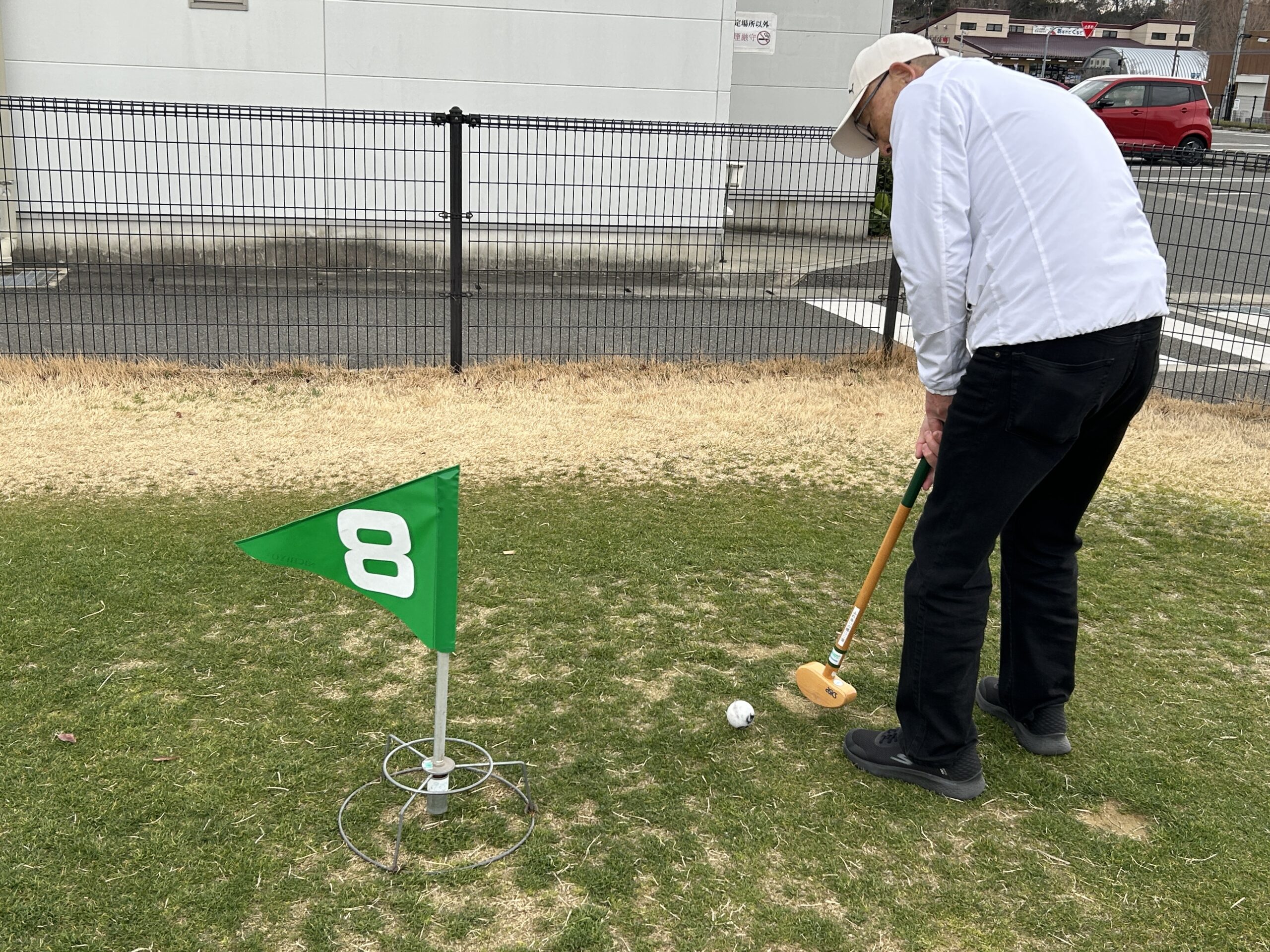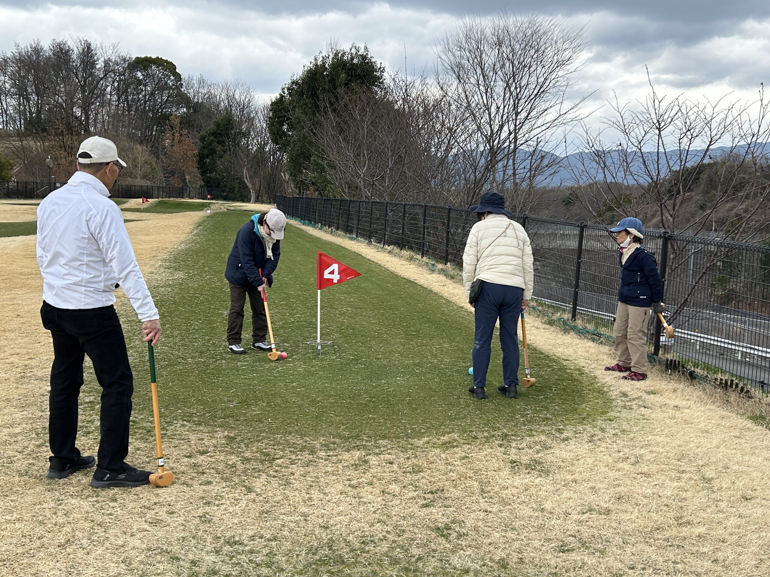 まず、ルール説明を受けますが初心者がほとんどなのであまりよくわかりません、此処のコースは競技会も行える本格的な芝生コースですので整備もよく行われており綺麗です。使用するボールはプラスチック製で固く、クラブも同じくでホッケー競技のスティックに似ています。何しろ初体験者ですので空振り、ダフリなどなかなか難しい。OBなどの連発ですが2~3ホールでそろそろ慣れてきましたが最後のホールに近づいてから入れるのが強くなったり弱くなったりでなかなか大変。でも猛者もおりなんとホールインワン達成者もでましたね、みな和気あいあいで楽しめた一日でした、競技後は近くのスーパーや道の駅で昼食後解散となりましたが、まだ残って再挑戦者もいましたよ。この競技にはまった人もいたんでは? (S.H)