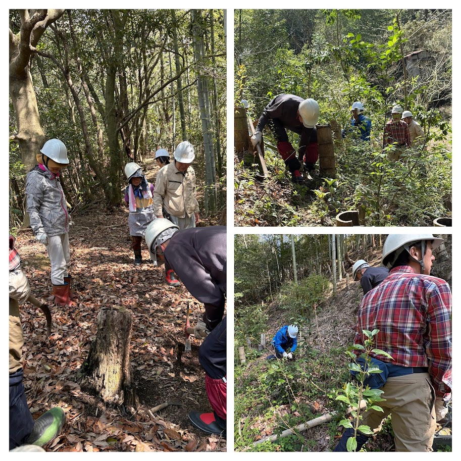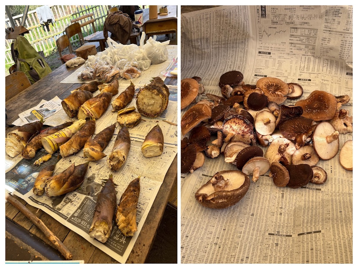 竹林の中を歩き、「あっ!出ているやんか?」「こっちにもあるよ。」と声が聞こえると鶴嘴やスコップを持って駆けつけ、筍を掘り起こしました。その後、明るくなった林床斜面、まだ薄暗い斜面を見ながら尾根道を歩きました。シイタケの林で取り残されたシイタケの収穫も出来、地道だけど、里山の復活に向けて意欲が湧きました。