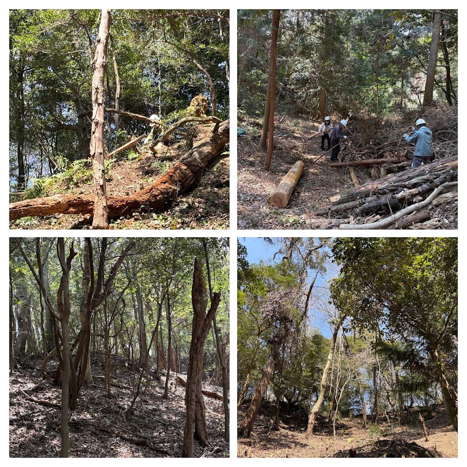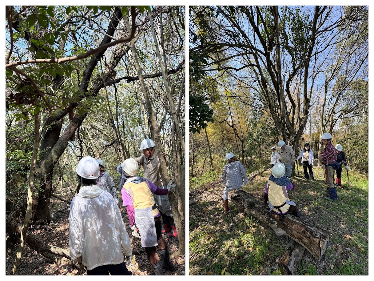 午前中は前日の雨で斜面が柔らかくなっていますが、尾根道に近い斜面の上辺りを中心に雑木や笹、シダ類の除去を始めていきました。太い蔓にぶら下がったり蔓に腰掛けたりして童心に戻り楽しむこともできました。午後からは散策チームの人たちと合流して、活動範囲を広げました。切り倒した雑木を斜面から谷間に下ろし、山積みとなった倒木を粉砕機でどんどん、チップ材にしていきます。本当に少しずつ少しずつ、林床が見え始め、見上げると空が笑っていました。