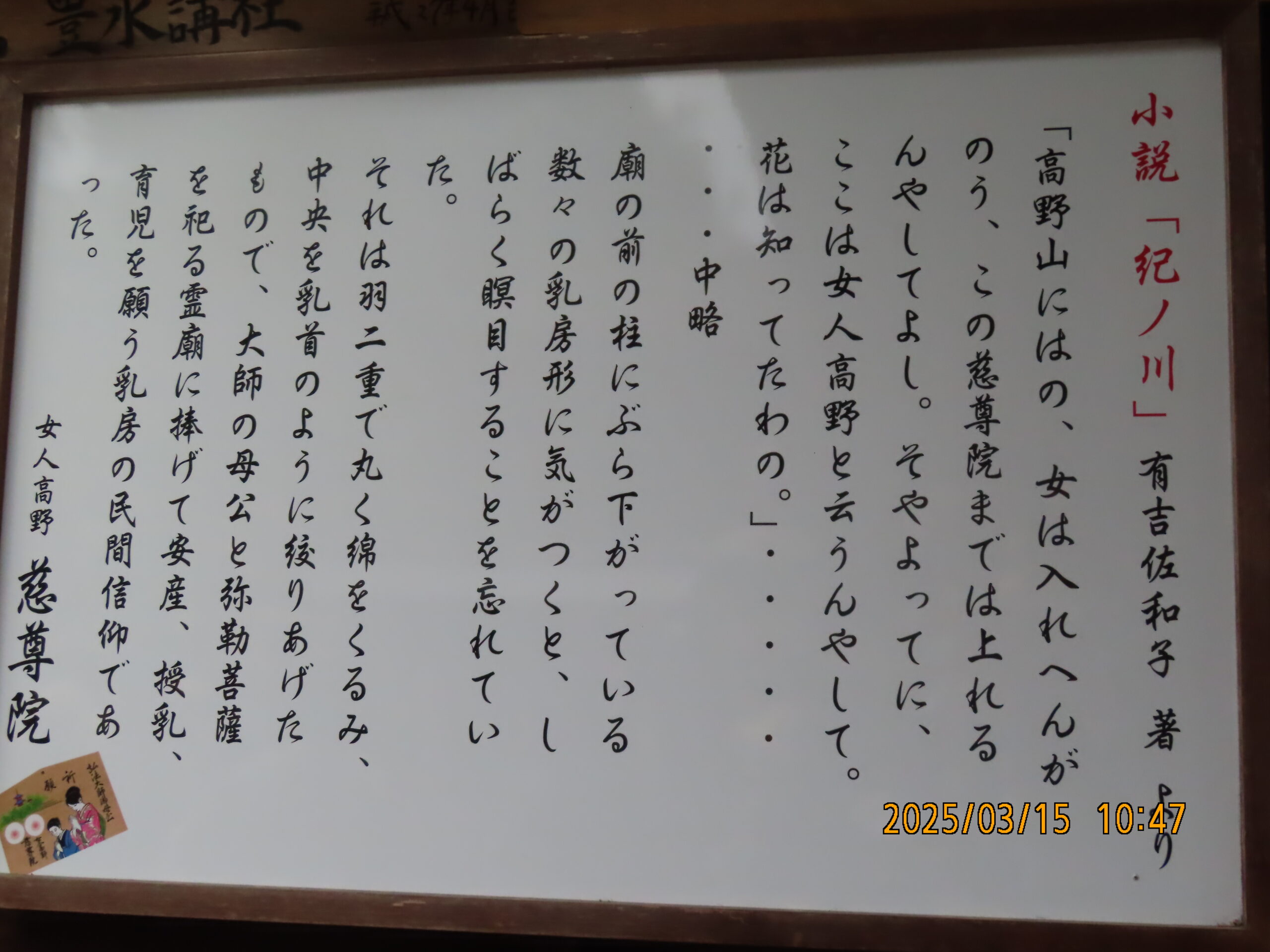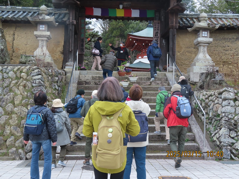 今回は九度山の語り部の一人「大川 久仁子」さんに九度山駅から真田のみちを通って道の駅~慈尊院~丹生官省符神社等歴史を語っていただきながらの吟行でした。当日は「春に三日の晴れなし」と言われる通り、前日のぽかぽか陽気とはうって変わり曇天の寒い一日でした。慈尊院では表門から入り手水場で清め、願いながらみろく石を撫で弥勒堂をお参りし多宝塔などひと通り説明を受けた後、119段の階段を説明を聞きながらゆっくり登り丹生官省符神社へと。空海はここで出会った猟師(神様が姿を変えていた)に高野山に導かれたとか。歴史探訪の充実した吟行でした。午後からは九度山町役場に隣接する「ふるさとセンター」の会議室をお借りし句会を和やかな雰囲気のもと進行出来ました。(K.T)