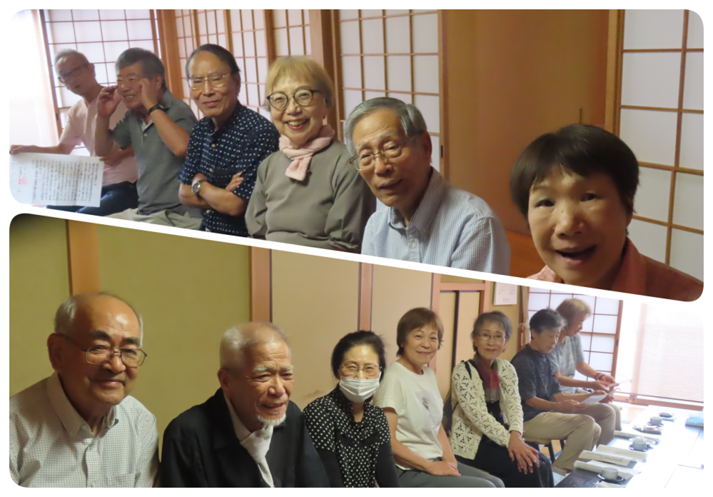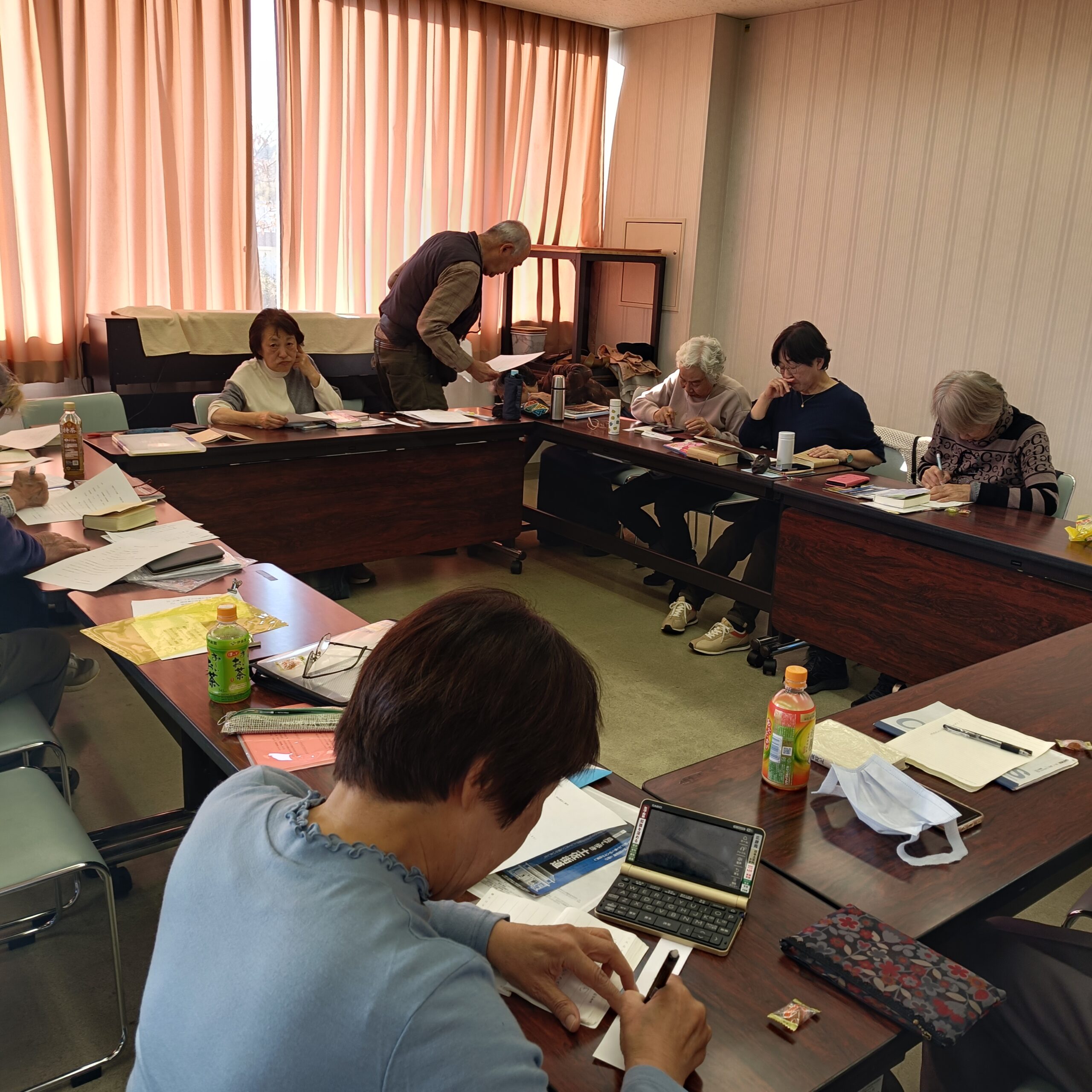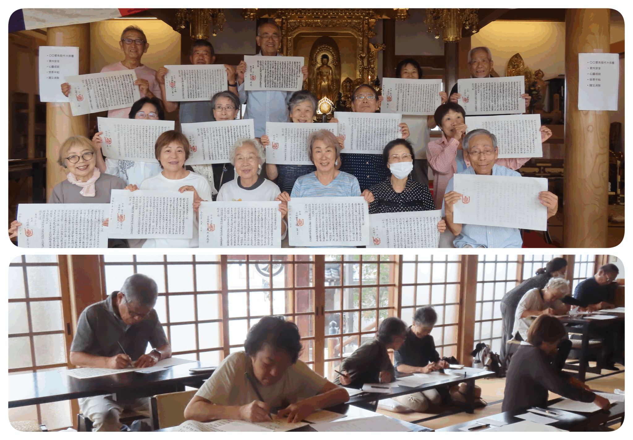 残暑を危惧し吟行を少なくして、秋の彼岸入りの日に写経体験会の企画をしました。髙野住職のお話、声を合わせての般若心経の読誦、写経の順で始まりました。さすが吟行部会の皆様、写経が始まるや静寂につつまれ、一心に取り組まれました。出来上がった順に住職にお渡しし、印を頂きお焼香をしました。持ち帰る方、お寺でのお焚き上げを望まれる方も般若心経を手に記念写真を撮りました。(M.N)