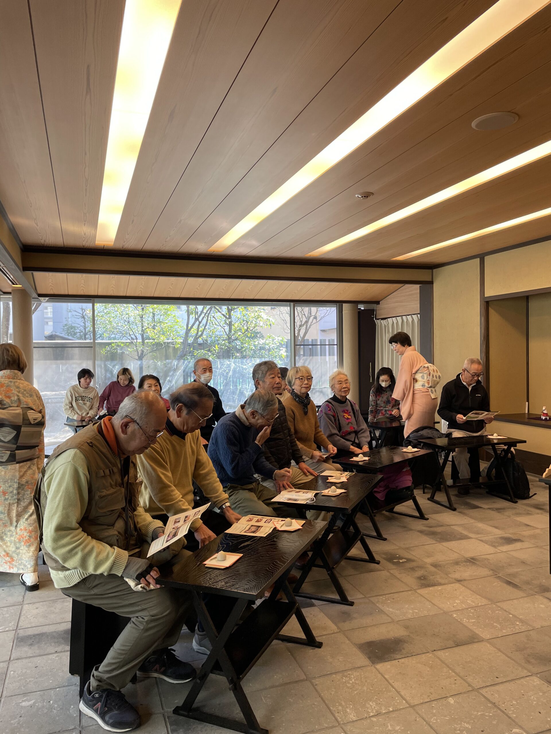 1月とは思えないまさに「冬晴」の暖かい一日でした。堺が誇る三国丘高校、泉陽高校の発祥の地でもあり、大寺さんの通称で親しまれている開口神社を参拝し、山之口商店街を通り抜け、さかい利晶の杜へと向かいました。館内の「南海庵」で、簡単な茶の湯体験(椅子に座っての立礼茶席)で美味しいお菓子とお抹茶をいただきました。その後、バスで中百舌鳥へ移動し、産業振興センターで句会をしました。(S.A)