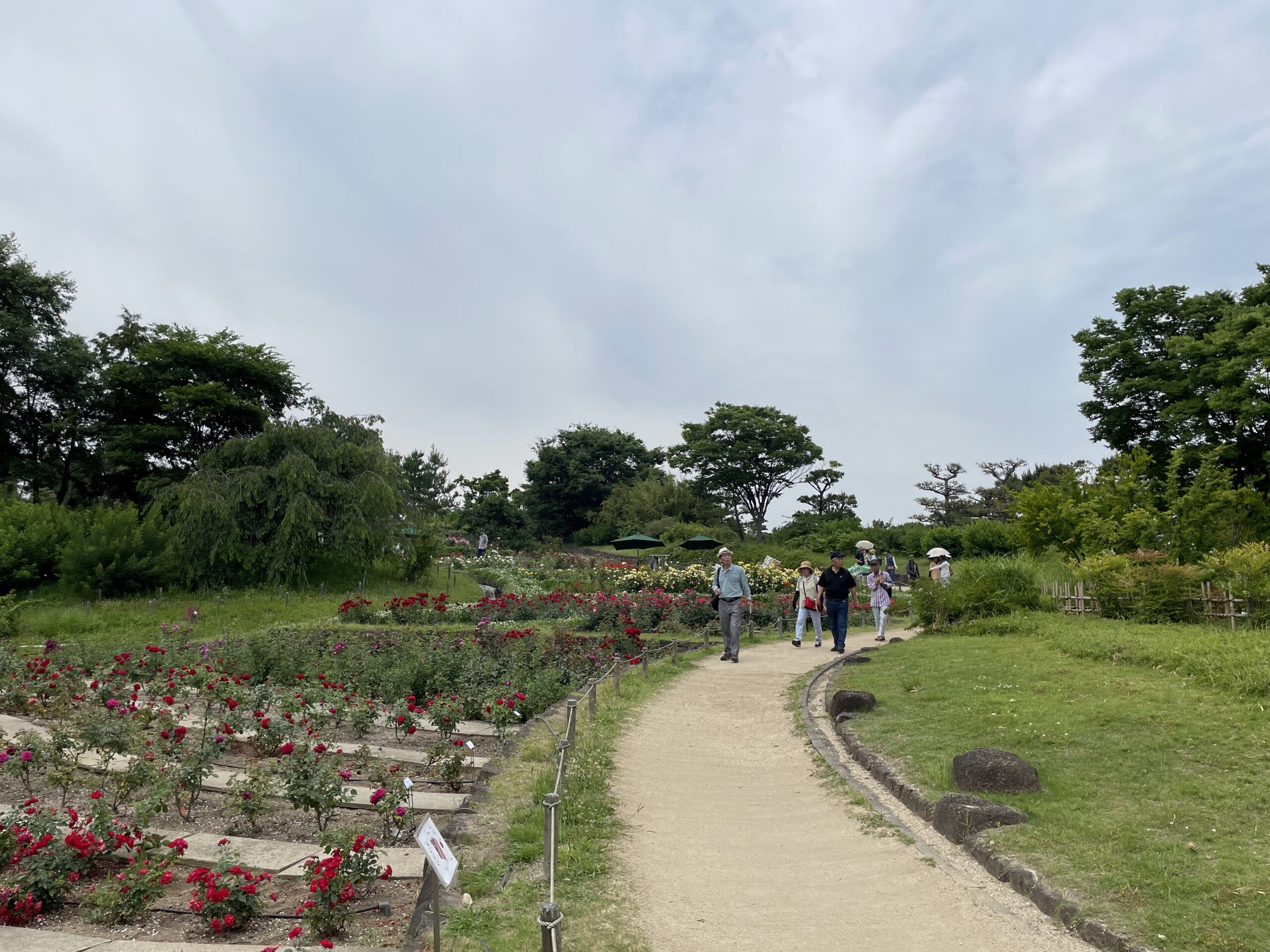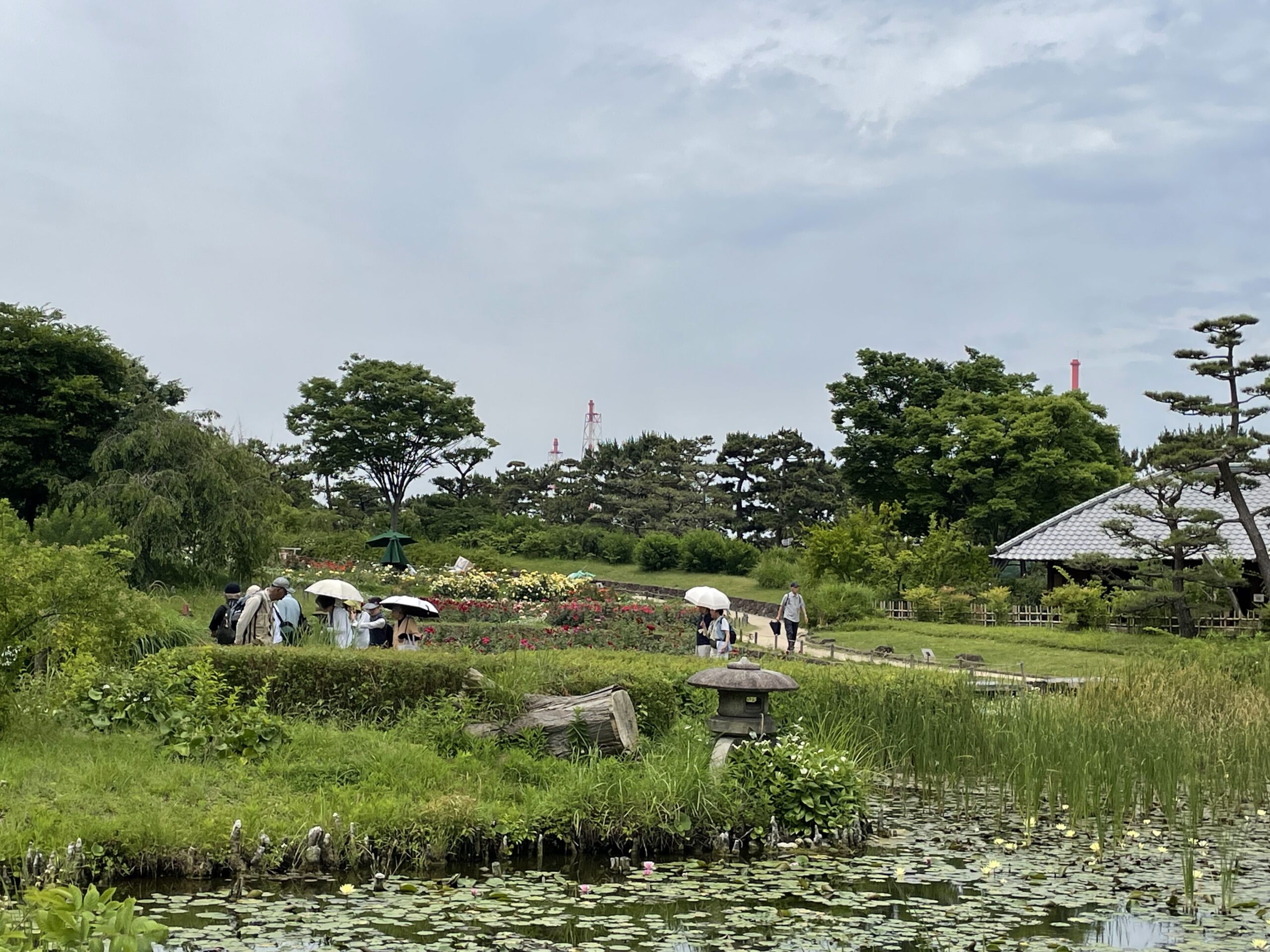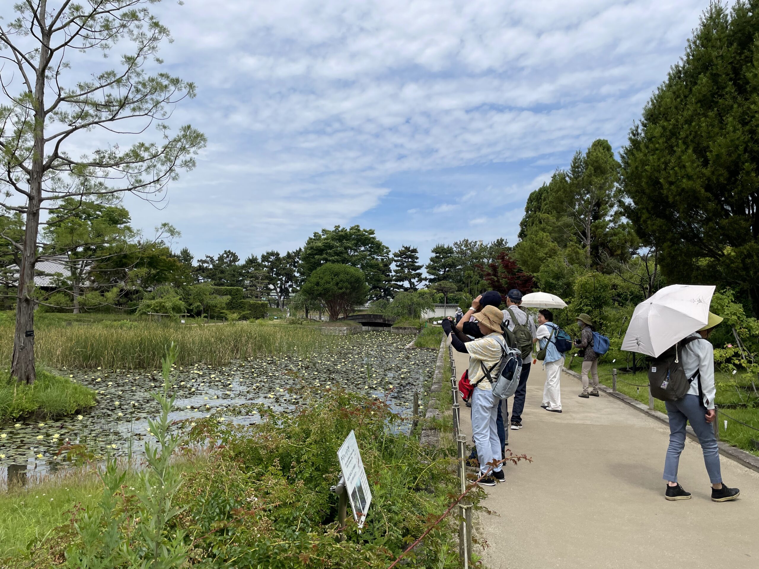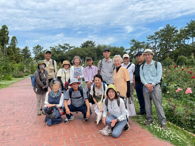 浜寺公園のバラ園では、池の睡蓮や、時折吹く風、小川を流れる水の音に、ほんの少し暑さを忘れつつ散策することができました。また、噴水プールではしゃぐ子どもたちの声を聞きながら、惜松碑に刻まれた万葉仮名を鑑賞し、公園の松林の歴史を学びました。その後バスで大鳥大社へと移動し、参拝の後、旧熊野街道である鳳商店街を通り抜け、句会会場へと向かいました。(S.A)