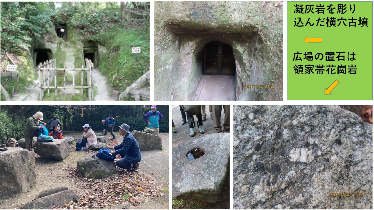 寒波襲来と思いきや、ぽかぽかの小春日和。今年最後の部会活動に21名がJR高井田駅に集合。午前は歴史資料館と高井田横穴公園の横穴古墳の見学、午後は大和川河原(国豊橋近傍)の石ころ観察である。歴史資料館で縄文・弥生の土器や石器、古墳時代の埴輪や装飾品、江戸時代の大和川の付け替え工事関連資料などの展示を見た後、学芸員の越智さんと横穴古墳の見学に公園内を歩く。古墳造営の文化的・時代的背景や大正期の横穴墓発見の経緯などの説明を耳に、200基以上ある日本最大級の横穴墓群の中の数か所に実際に入って見学し、遠い昔の古墳時代に思いを馳せた。