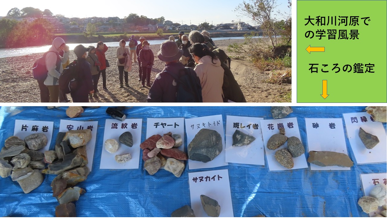 - 河原で集めた石ころは花崗岩、閃緑岩、斑レイ岩、流紋岩、安山岩(サヌカイト・サヌキトイドを含む)、砂岩、チャート、片麻岩、石英と鑑定され、5月に行った少し上流の亀の瀬での鑑定結果とほぼ同じであった。同じ大和川でも石ころの大きさや形は少し小さく、丸みを帯びているように思われた。今回は安山岩の他に片麻岩が多く採取されたが、縞状の模様やキラキラ輝いて見える粒子(黒雲母)が目を惹いたためか。
