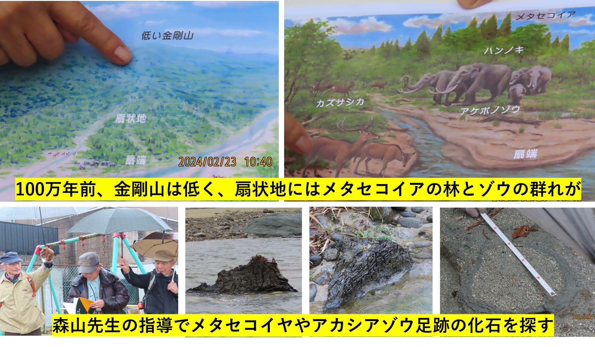 - 当時は今ほど高くはない金剛山からの流水によりできた扇状地にメタセコイアなどの林が形成され、ゾウやシカが水を求めて歩き回る様がイメージされる。
