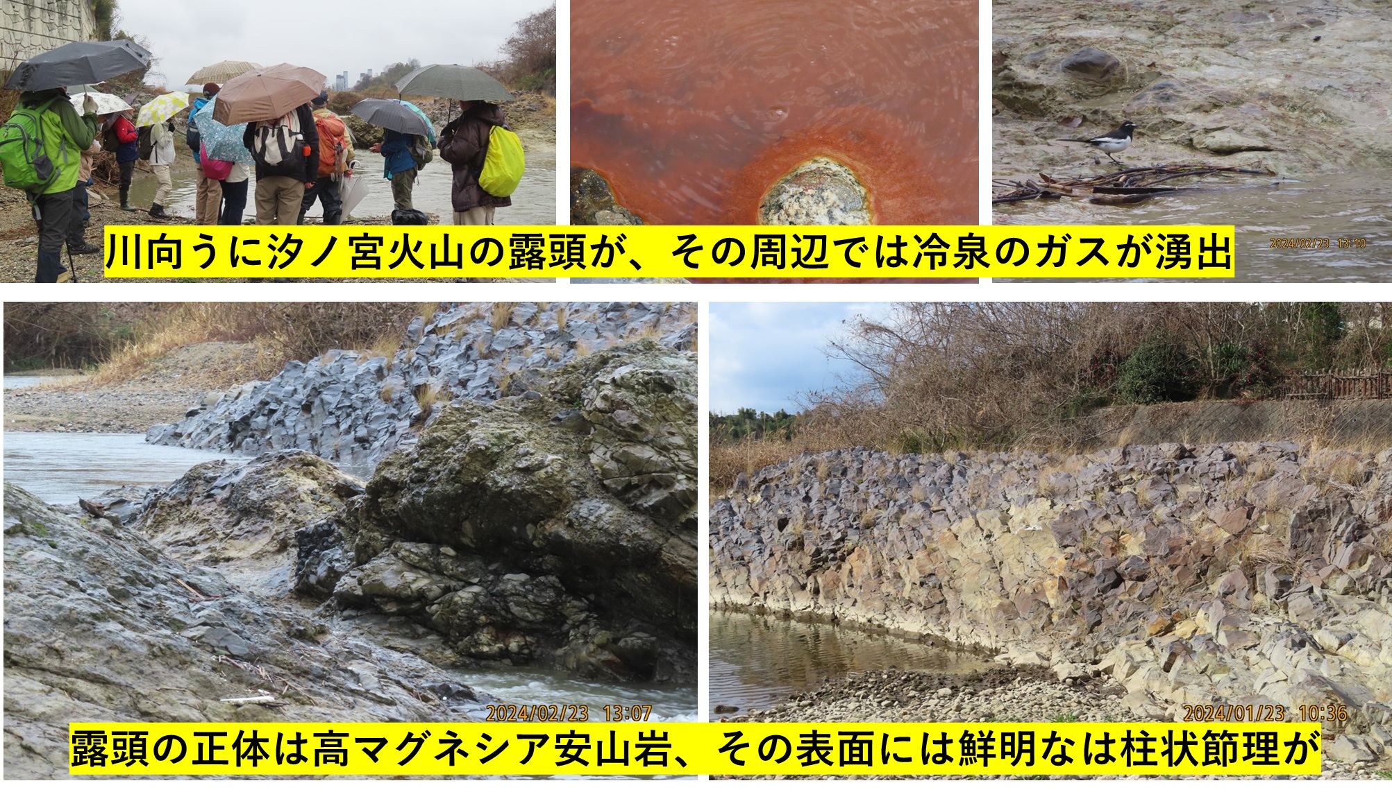 - 汐ノ宮の火山岩(安山岩)はそれより遥か昔、1300~1400万年前に噴出した溶岩である。柱状節理が観察されるが、これは溶岩が固まる時に体積が収縮し、その時にできた五角形や六角形の柱状の割れ目である。