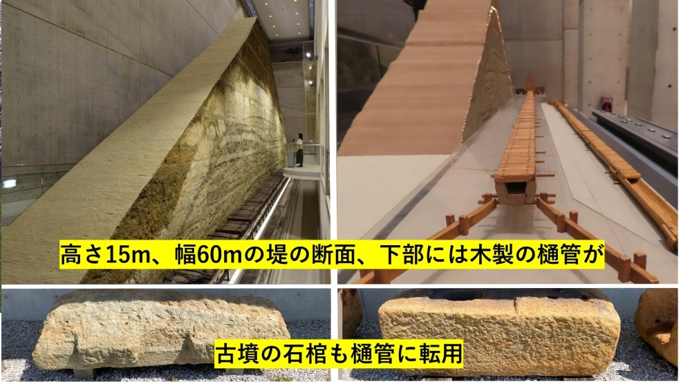 博物館内では3班に分かれ、ガイドさんの案内で狭山池の1400年の歴史をたどったが、驚きの連続である。狭山池は飛鳥時代につくられた人造のため池であると聞いて先ず驚く。そして目の前にそびえる高さ15m、幅60mの堤の断面に目を見張る。実際の池の堤から移築され、ポリエチレングリコール処理で固定されているのだとか。安藤忠雄の設計の博物館本体はそれを収容する形でその後に建築されたと聞いて更に驚く。堤の下の方には狭山池の水を下流に流す巨大な樋管がある。飛鳥時代の樋管はコウヤマキ製だそうであるが、腐食から免れ、造りたてのように輝いている。鎌倉時代には木製の他に石製の樋管も一部使われたそうだ。古墳時代の石棺を加工し、転用したものらしい。他にも様々な展示を見て回ったが、感嘆と驚きの連続であった。たっぷりと時間をかけてガイドさんに案内してもらったためか、見学の後に充足感がある。入場無料。何度来てもいい。