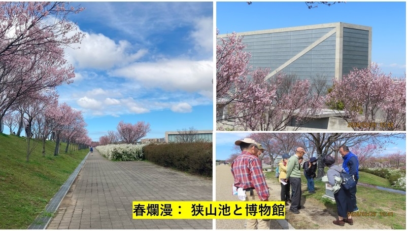 昨夜来の雨も朝にはピタリと上がり、今日は日本最古のダム式ため池「狭山池」の散策と「狭山池博物館」の見学である。先ずは大阪市狭山駅から歩いて狭山池に向かう。池の周りを取り囲む五分から七分咲きの桜が青空に映えている。早咲きの品種「越の彼岸」が多く植えられているため、大阪府内では一番早く楽しめる花見のスポットなのだとか。