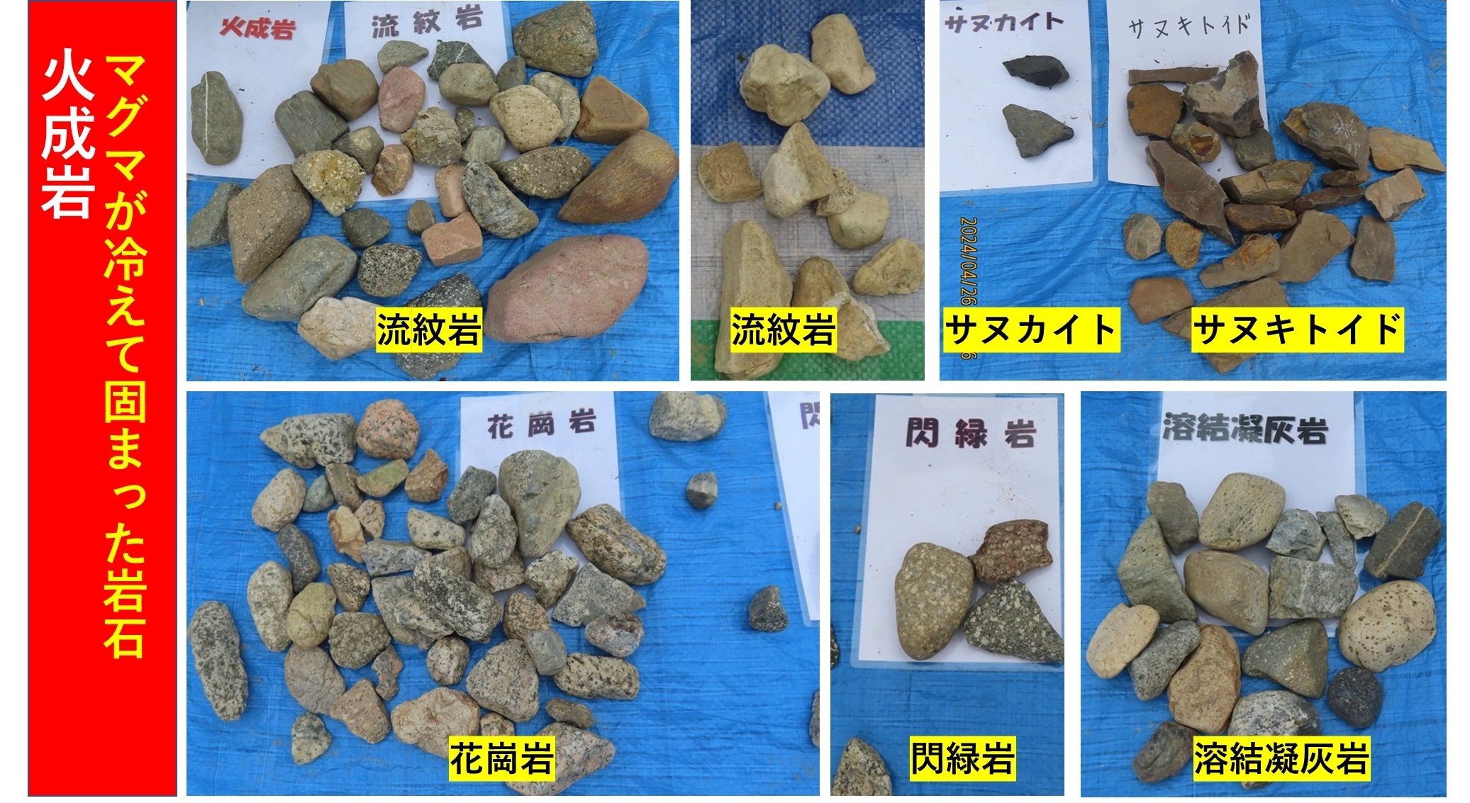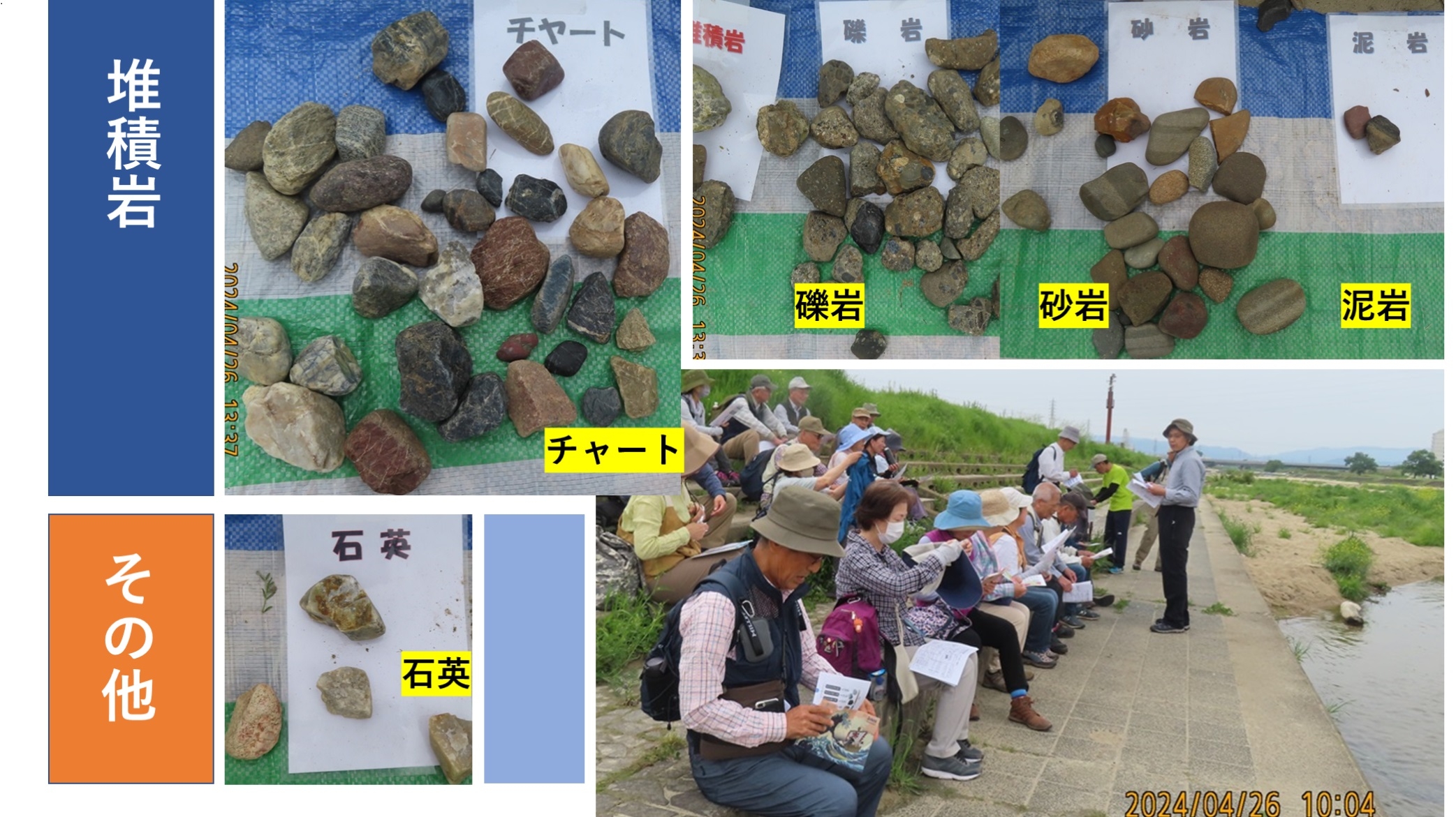 - 最終的に佐藤先生の鑑定で分類された石ころの数は以下の通り:火成岩として流紋岩37個、サヌカイト2個、サヌキトイド20個、花崗岩36個、閃緑岩7個、溶結凝灰岩16個;堆積岩として礫岩30個、砂岩24個、泥岩2個、チャート33個であった。変成岩はひとつもなかった。他には石英が4個あったが、今回、収集・鑑定された石ころの総数は191個であった(個数は写真からの読み取り)