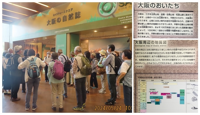 2018年の設立以来、石ころ部会は大阪周辺の山や河原での地質や石ころの観察を行ってきた。一転して、今回は大阪市立自然史博物館「花と緑と自然の情報センター」のネイチャースクエア「大阪の自然誌」のコーナーで、これまで野外で学んできたことを整理してみようという試みである。今回も佐藤隆春先生にガイドをお願いした。能登半島地震や南海トラフ地震などの話題の多いなか、大阪の地形の成り立ちについて、地震との関係から解説して頂いたのでいささか盛り上がった質疑応答となった。また、大阪の周囲から採取し、磨き上げられた大き目の岩石の標本は実際に手で触れられるように展示されており、我々が普段、拾う石ころとは大分様相が違って新鮮である。このコーナーは地質学関連以外にも樹木や野鳥、昆虫など大阪に生息する生き物の展示も充実しており、博物館や植物園を訪れた際には是非立ち寄りたい場所である。午後は各自が自由に特別展「自然史のイラストレーション」の観覧や植物園の散策を楽しんだ。