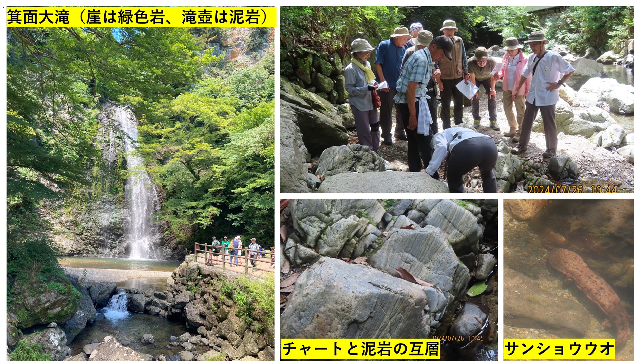 うだるような猛暑の中、13人が阪急箕面駅前に集合。本日は箕面川と箕面大滝周辺の石ころと地質の観察である。連日の猛暑で渓谷の涼を楽しむなど願うべくもないが、大滝までの2.7㎞の遊歩道は多くのハイカーで賑わっていた。我々は熱中症に気を付けながらも、佐藤先生の指導の下、河原の岩石や道沿いの露頭などをじっくりと観察することが出来た。特別天然記念物のオオサンショウウオを目にすることもできた。予定の観察を全て終えれば、心地よい疲労感が残る。この後は一杯のビールが待っている。そして、今晩から始まるパリオリンピックのテレビ観戦も楽しみである。それぞれの思いを胸に渓谷を後にした。