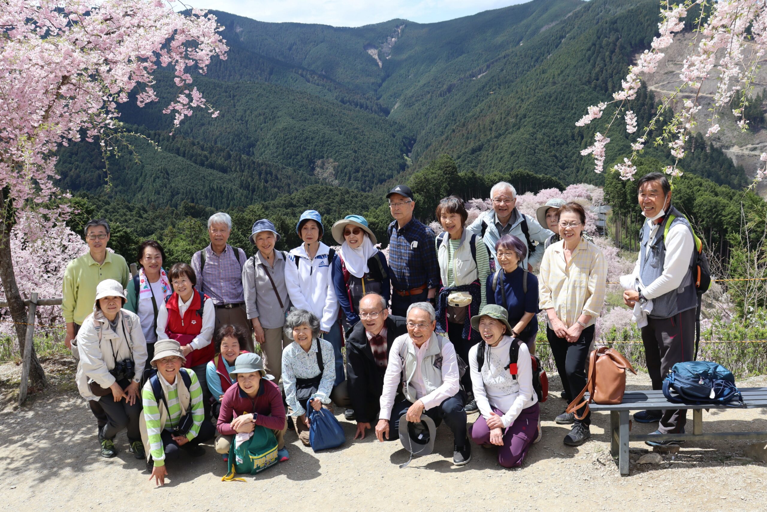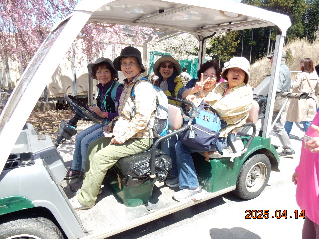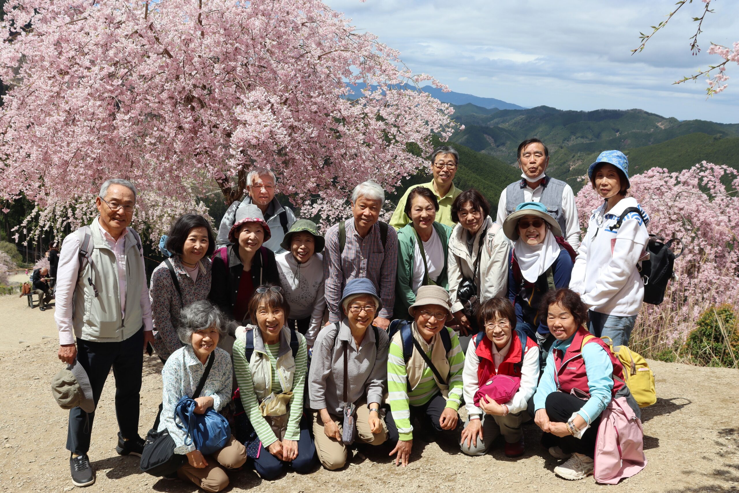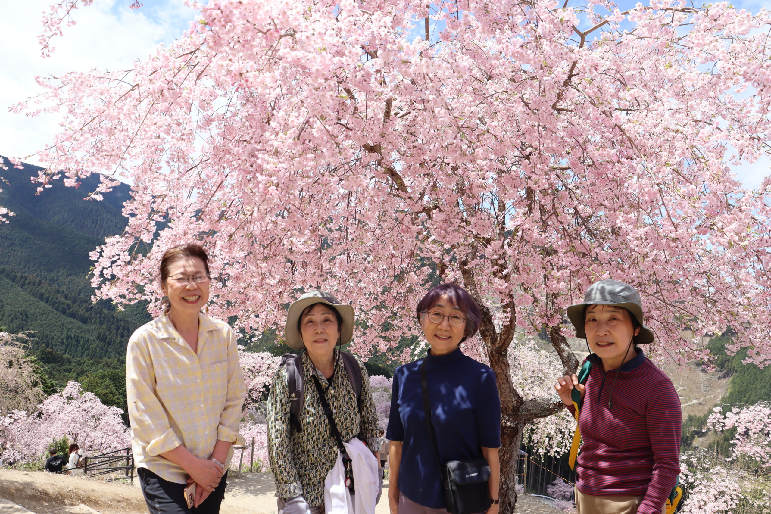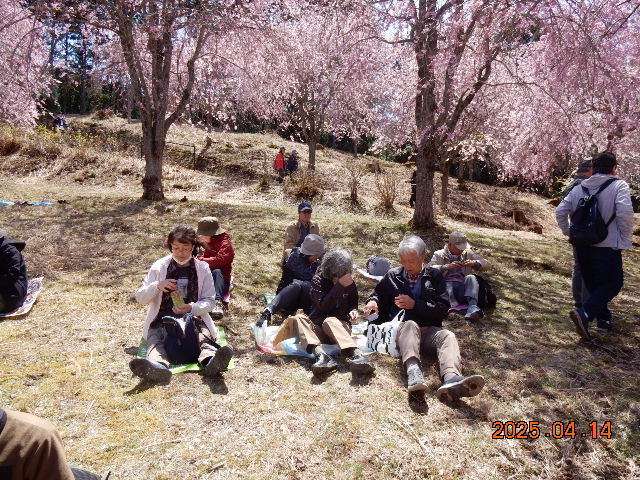 きょうは目指す行き先がチョット遠方のため、バスをチャーターし三国ヶ丘駅より出発した。幸い天候は昨日の雨模様からちょっと肌寒いけど良い天気になってくれました。春の景色にひたりながら、途中道の駅宇陀で休憩したがもうお土産を買ってる人もいました。約2時間の行程で【高見の郷】に到着した。よく見える展望台を目指してマイクロバス組とハイク組に分かれて登ります、急勾配を登るバスにヒヤヒヤでしたがハイク組と合流した場所はもう枝垂れサクラが綺麗に咲いて感激~。展望台への坂道にはサクラとレンギョウ、ユキヤナギが咲いてくれてました。上へあがると枝垂れ桜の花が見事でした。桜の樹の下で昼食をとり、今年度初めての活動のため自己紹介をしてのち皆さん思い思いにぶらぶらと桜鑑賞やお団子など食べながら浸ってました。ほんとにここの桜はまったく見飽きない素晴らしいと思いながら帰途につきました。(S.H)