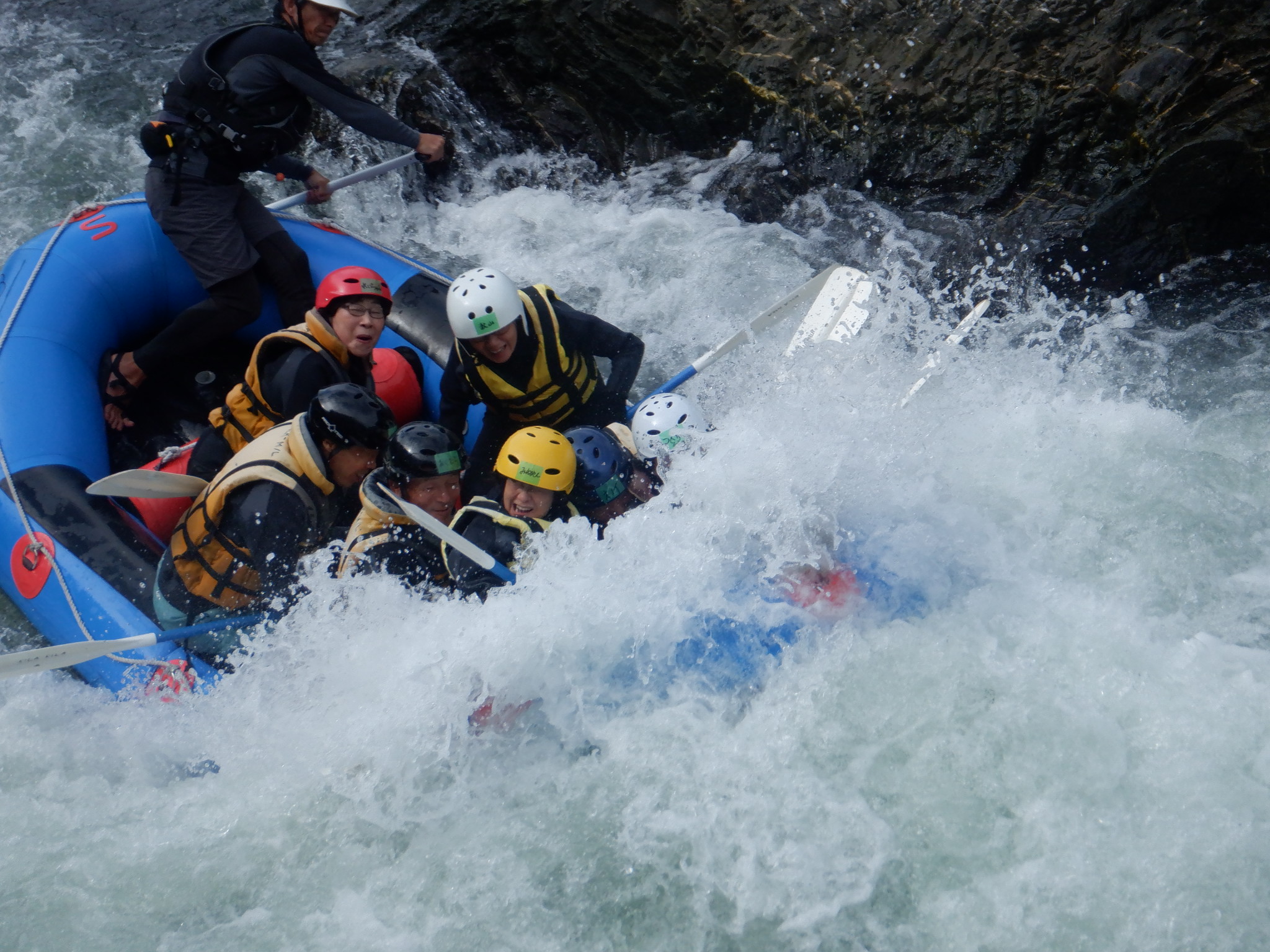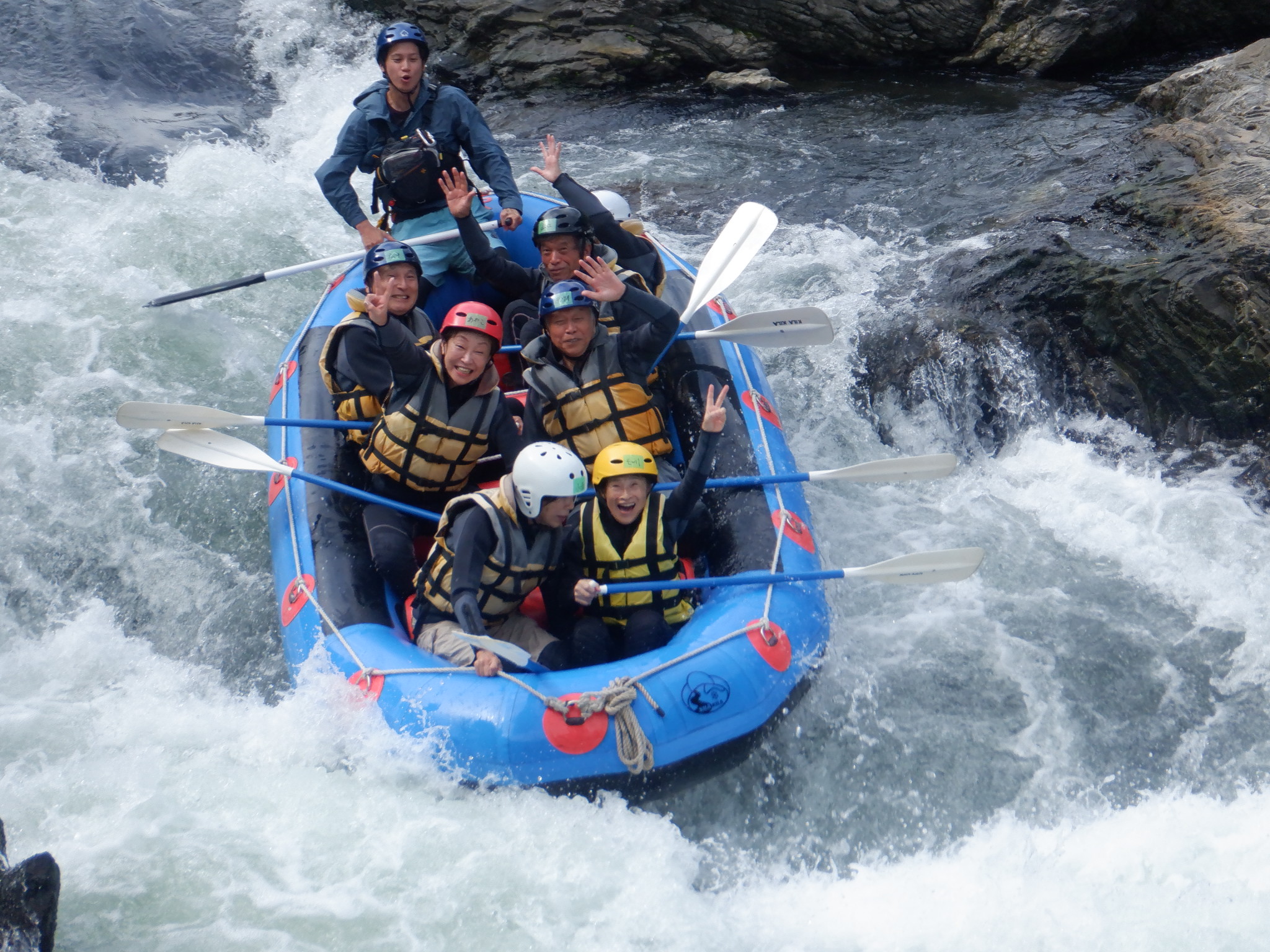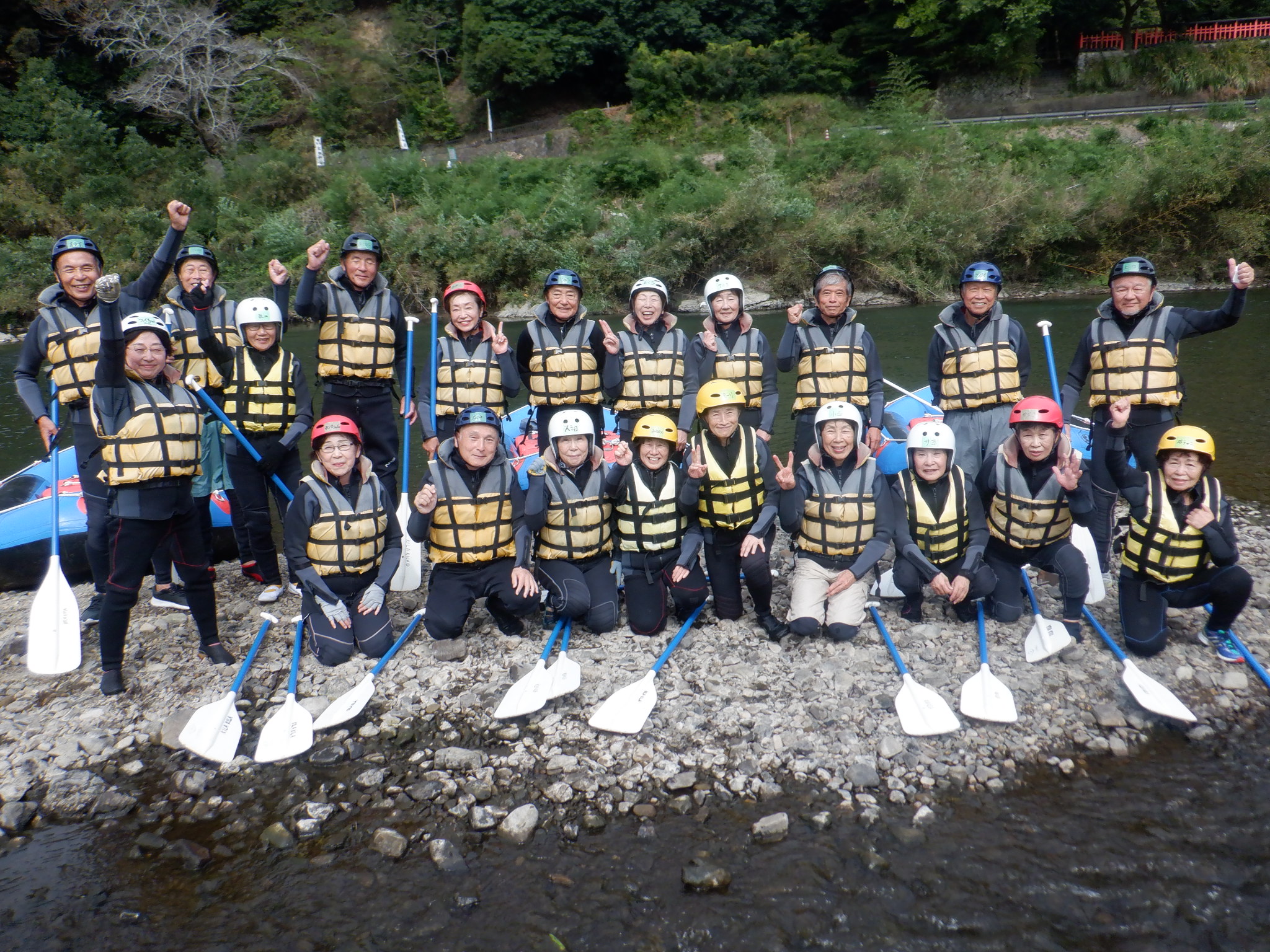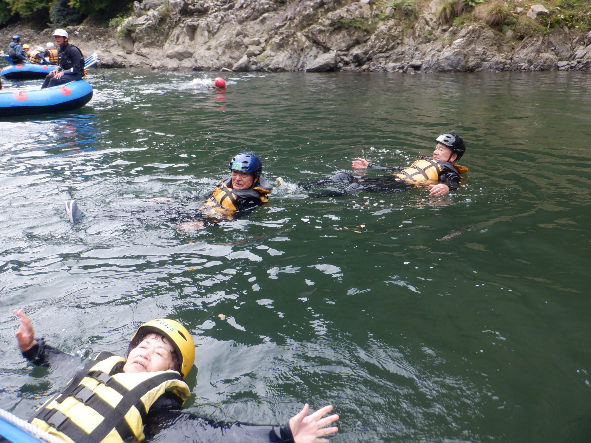 お天気を心配しましたが、幸いくもりの天気でそんなに寒くなかったが、JRが遅れて皆ばらばらの状態で京都駅に着き、嵯峨野線に乗り換えてなんとか馬堀駅までたどり着いた。イベント会社で着替えは、水着の上にウレタンウエットスーツ、ジャケット、風除けナイロンジャケット、ヘルメットで完全な安全装備です。危険予防の説明後、各自パドルを持って徒歩で保津川へ向かった。道中アウトバウンドの人たちの目を気にしつつ早速に着いた。幸い風も無く、3隻のゴムボートに分かれて出発し、約5キロ、2時間半のコースにある約20か所の激流に向かった。皆さん興味充分で最初の激流に突入にはワイワイキャアキャでしたが最後は余裕も出てきて、水しぶきで頭からずぶ濡れとなっても全く動じない、行程の半分を過ぎたところのゆるやかな所で川へ飛び込み泳げない人も、ラッコさん状態で浮かんだり泳いだり。途中では川下りの観光船とエールを交換しながら余裕も出てきたところで3メートルぐらいの岩場へ上がり、ほとんどの方が経験したことがないため決死の覚悟飛び込み、いい経験でした。帰り道は濡れた状態でそのままJRに一駅間乗るのも面白い体験です。その後の昼食はバイキングで盛り上がり、怪我無く、満足の1日でした。(S.H)