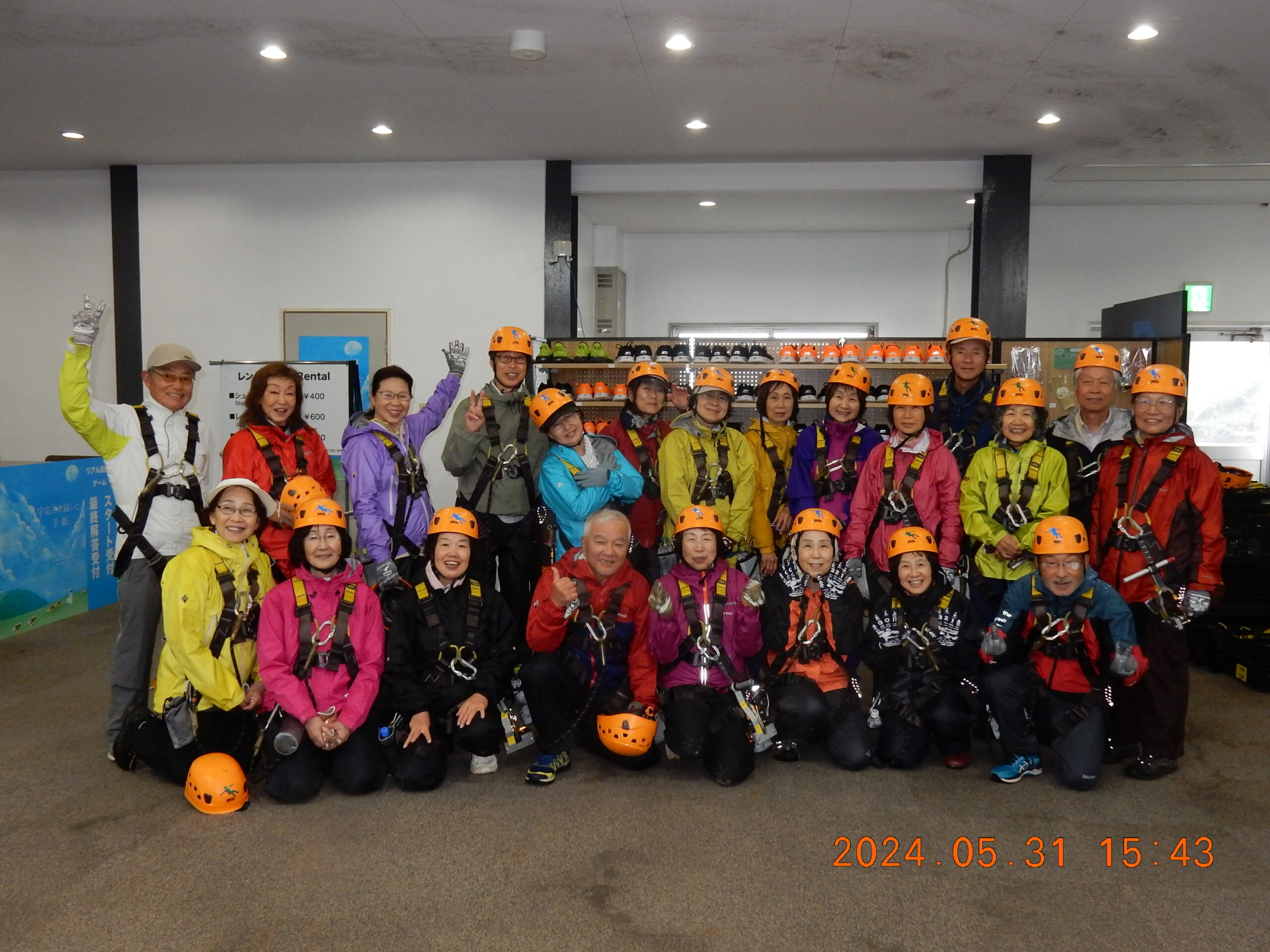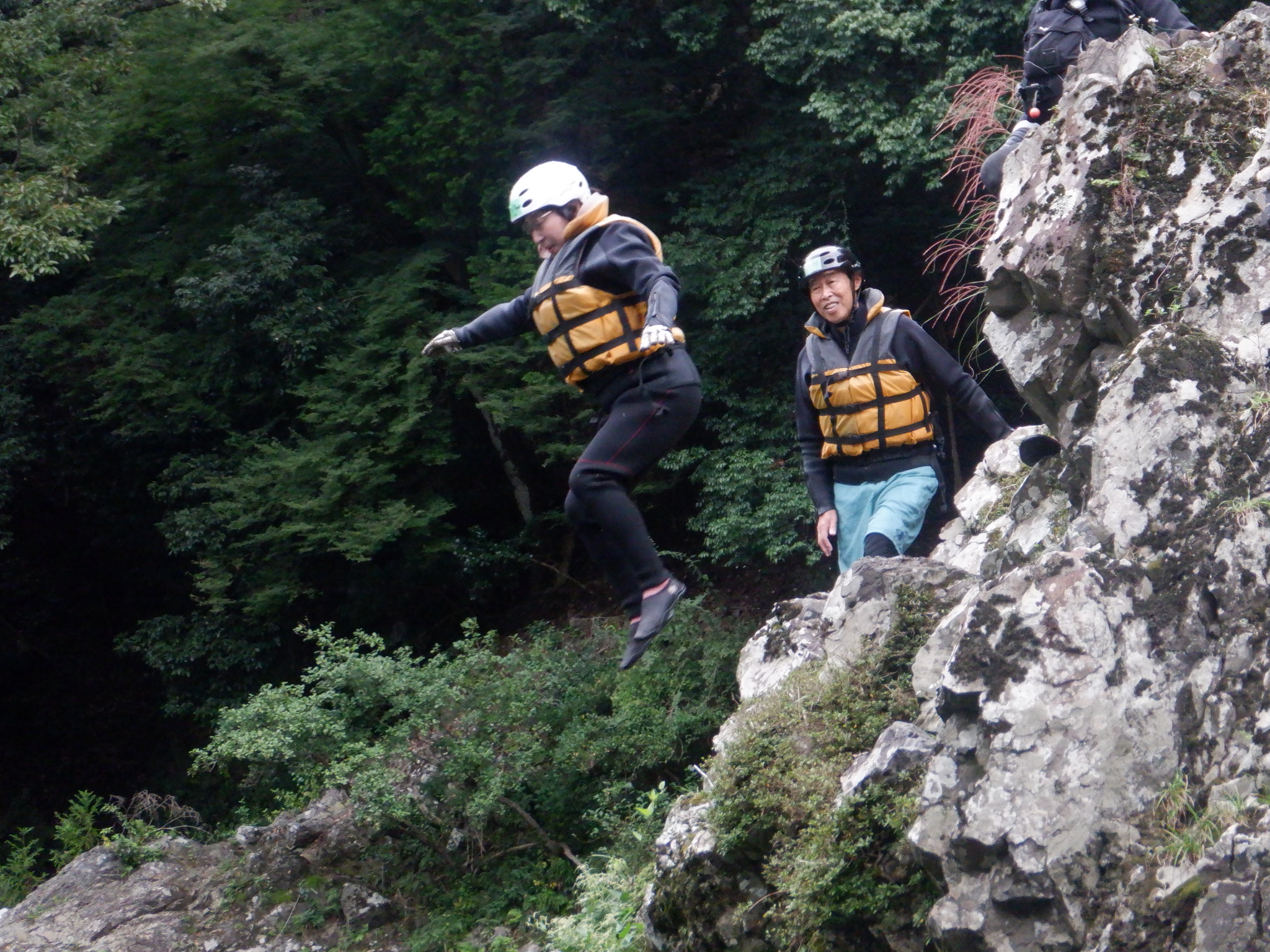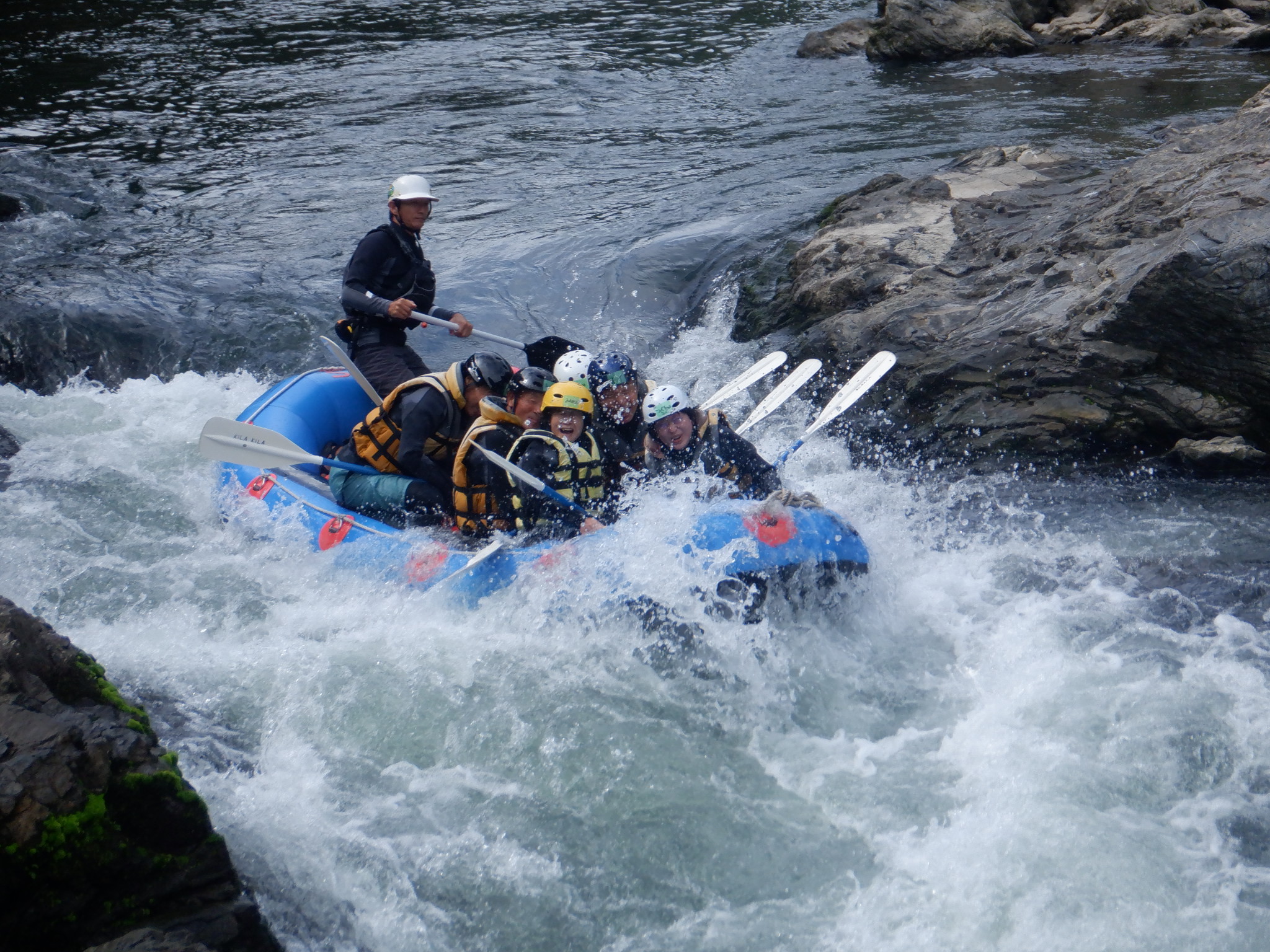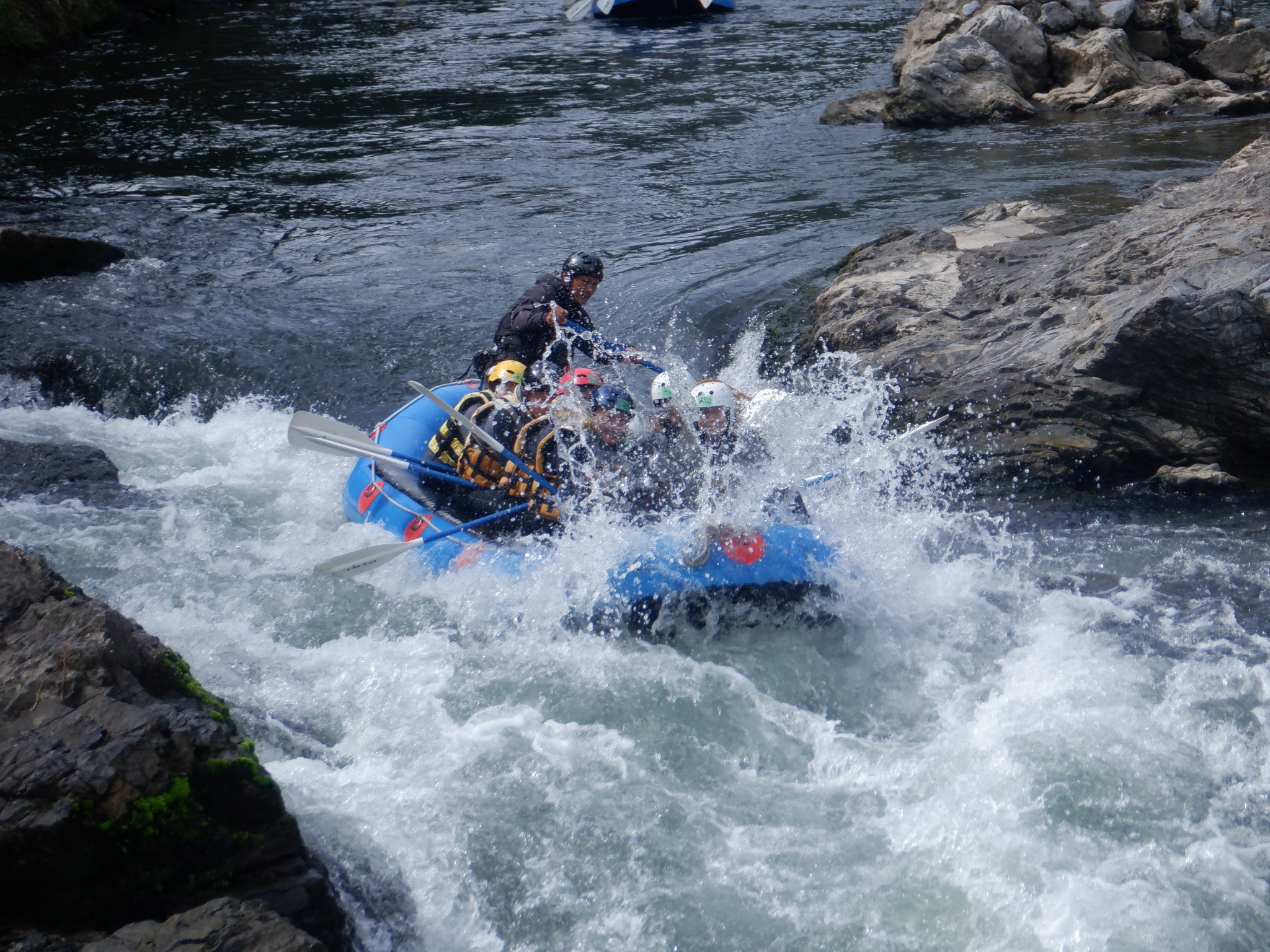 お天気を心配しましたが、幸いくもりの天気でそんなに寒くなかったが、JRが遅れて皆ばらばらの状態で京都駅に着き、嵯峨野線に乗り換えてなんとか馬堀駅までたどり着いた。イベント会社で着替えは、水着の上にウレタンウエットスーツ、ジャケット、風除けナイロンジャケット、ヘルメットで完全な安全装備です。危険予防の説明後、各自パドルを持って徒歩で保津川へ向かった。道中アウトバウンドの人たちの目を気にしつつ早速に着いた。幸い風も無く、3隻のゴムボートに分かれて出発し、約5キロ、2時間半のコースにある約20か所の激流に向かった。皆さん興味充分で最初の激流に突入にはワイワイキャアキャでしたが最後は余裕も出てきて、水しぶきで頭からずぶ濡れとなっても全く動じない、行程の半分を過ぎたところのゆるやかな所で川へ飛び込み泳げない人も、ラッコさん状態で浮かんだり泳いだり。途中では川下りの観光船とエールを交換しながら余裕も出てきたところで3メートルぐらいの岩場へ上がり、ほとんどの方が経験したことがないため決死の覚悟飛び込み、いい経験でした。帰り道は濡れた状態でそのままJRに一駅間乗るのも面白い体験です。その後の昼食はバイキングで盛り上がり、怪我無く、満足の1日でした。(S.H)