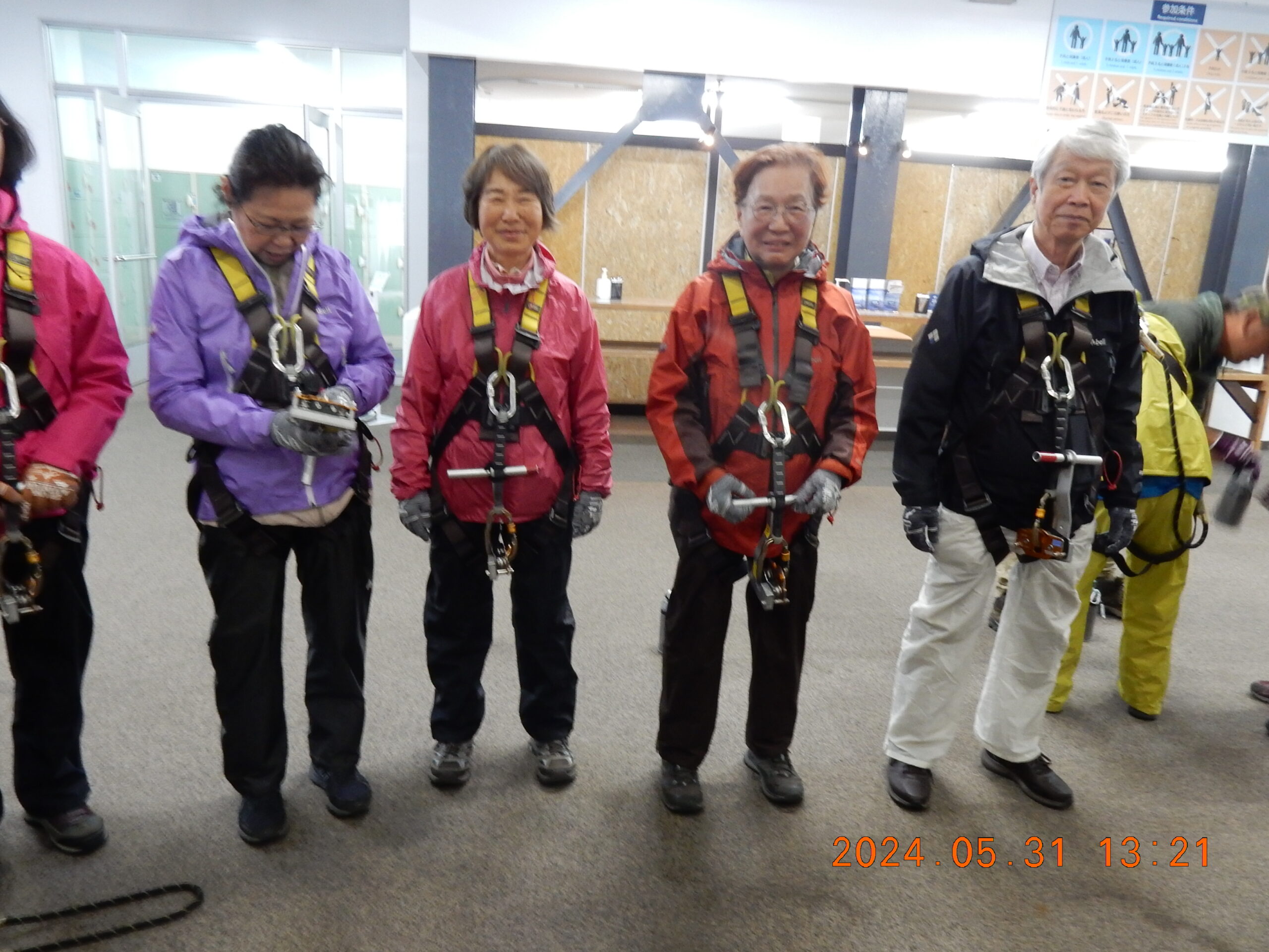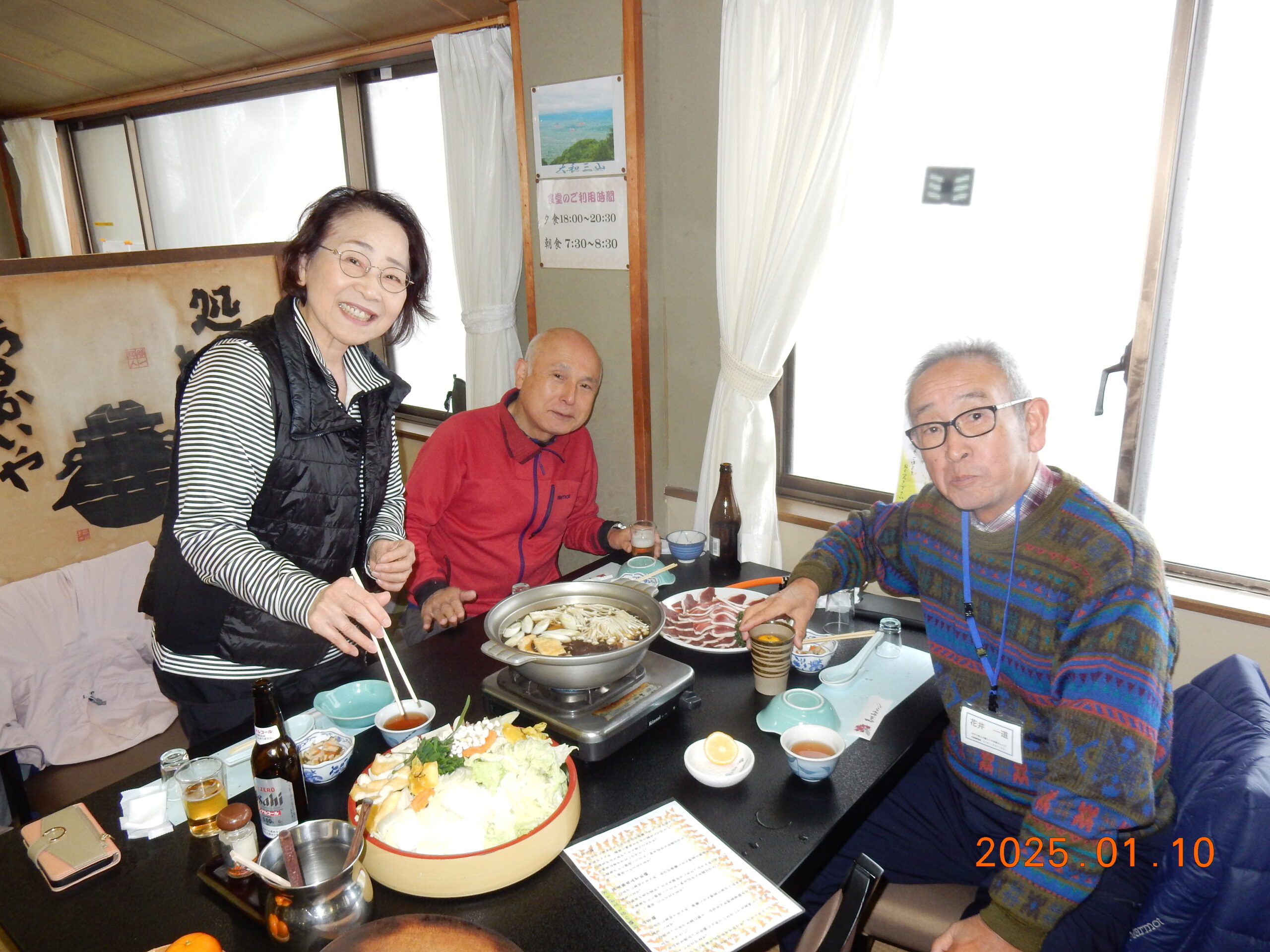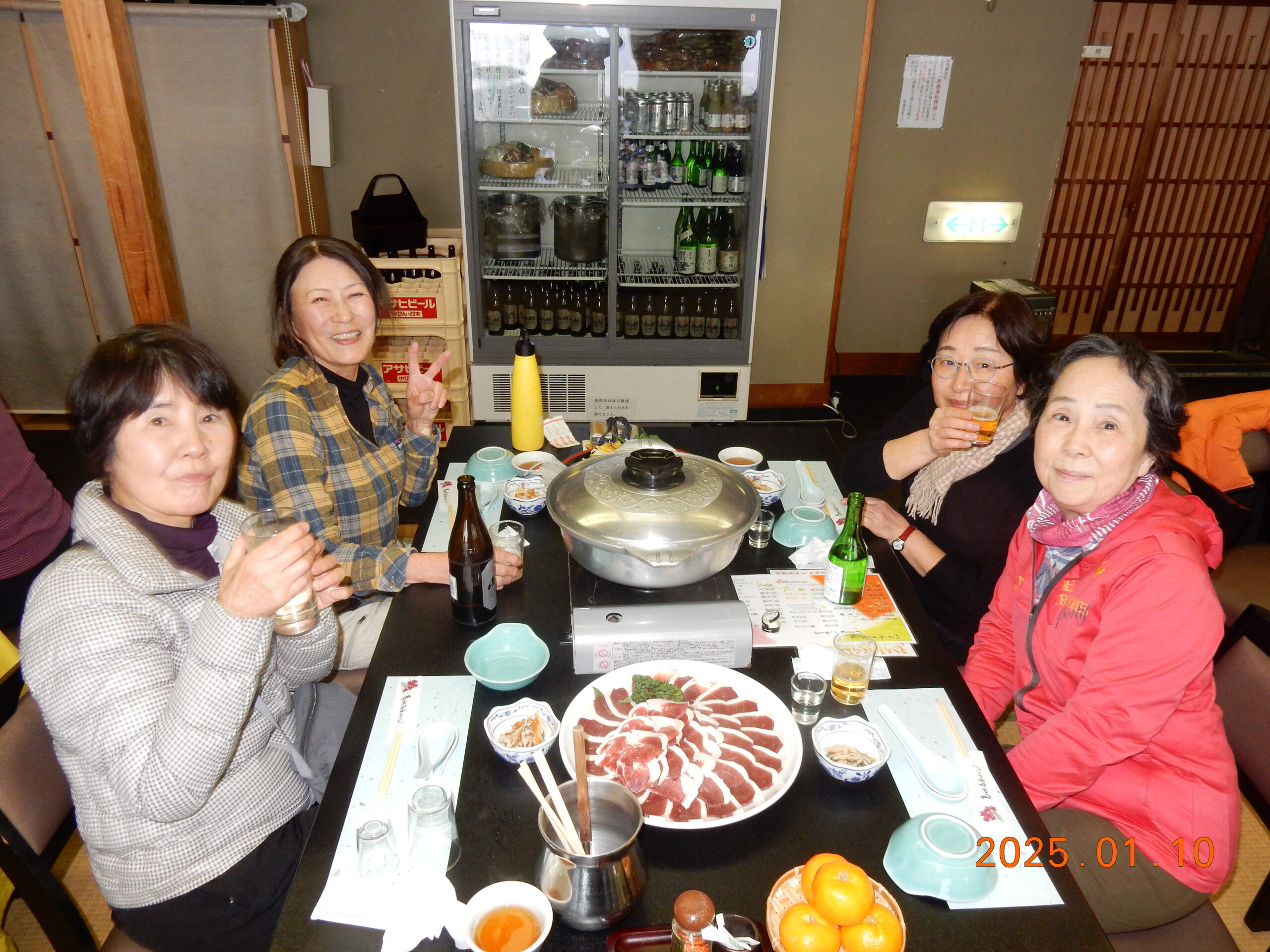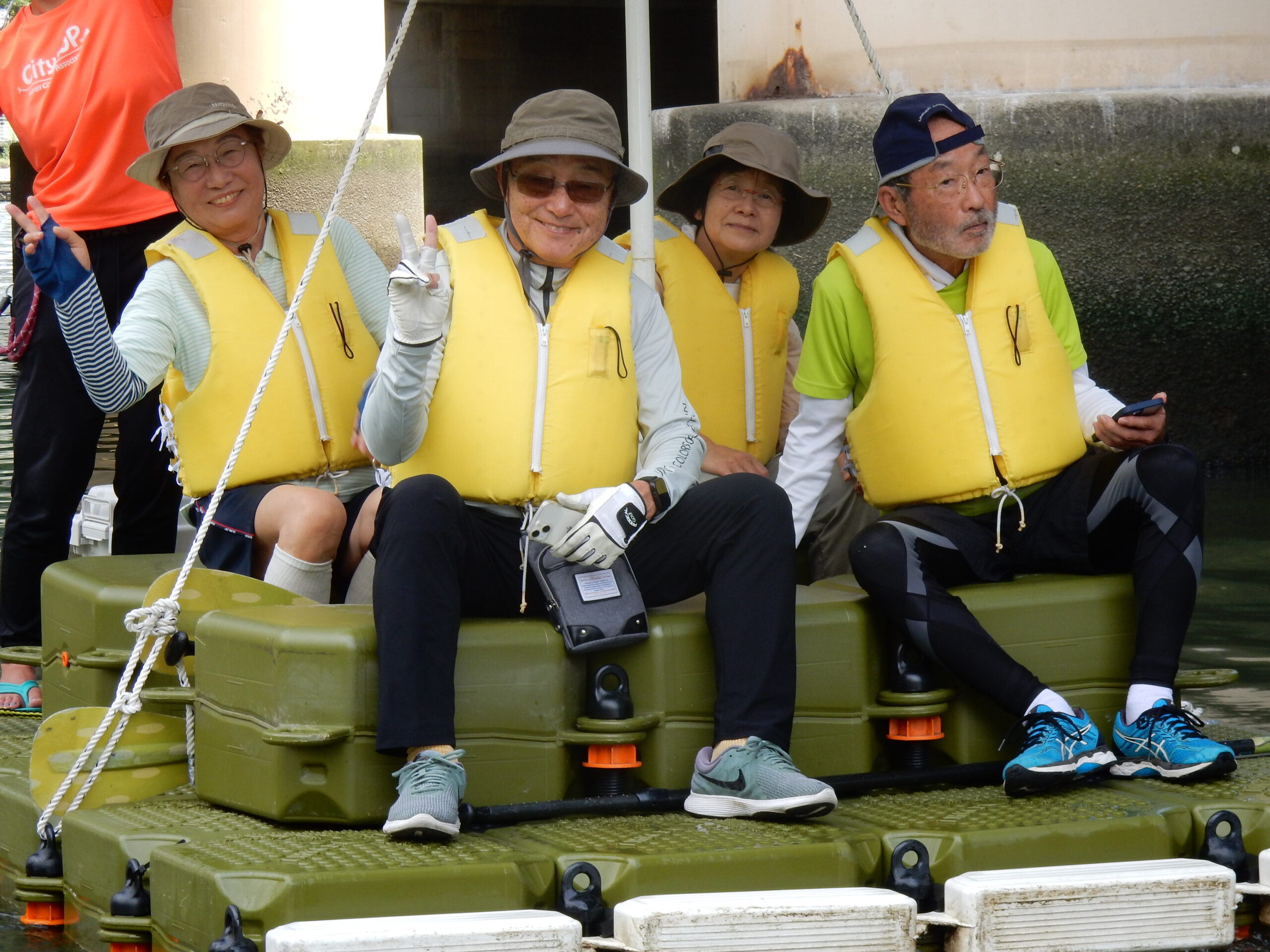 お天気を心配しましたが、幸いくもりの天気でそんなに寒くなかったが、JRが遅れて皆ばらばらの状態で京都駅に着き、嵯峨野線に乗り換えてなんとか馬堀駅までたどり着いた。イベント会社で着替えは、水着の上にウレタンウエットスーツ、ジャケット、風除けナイロンジャケット、ヘルメットで完全な安全装備です。危険予防の説明後、各自パドルを持って徒歩で保津川へ向かった。道中アウトバウンドの人たちの目を気にしつつ早速に着いた。幸い風も無く、3隻のゴムボートに分かれて出発し、約5キロ、2時間半のコースにある約20か所の激流に向かった。皆さん興味充分で最初の激流に突入にはワイワイキャアキャでしたが最後は余裕も出てきて、水しぶきで頭からずぶ濡れとなっても全く動じない、行程の半分を過ぎたところのゆるやかな所で川へ飛び込み泳げない人も、ラッコさん状態で浮かんだり泳いだり。途中では川下りの観光船とエールを交換しながら余裕も出てきたところで3メートルぐらいの岩場へ上がり、ほとんどの方が経験したことがないため決死の覚悟飛び込み、いい経験でした。帰り道は濡れた状態でそのままJRに一駅間乗るのも面白い体験です。その後の昼食はバイキングで盛り上がり、怪我無く、満足の1日でした。(S.H)