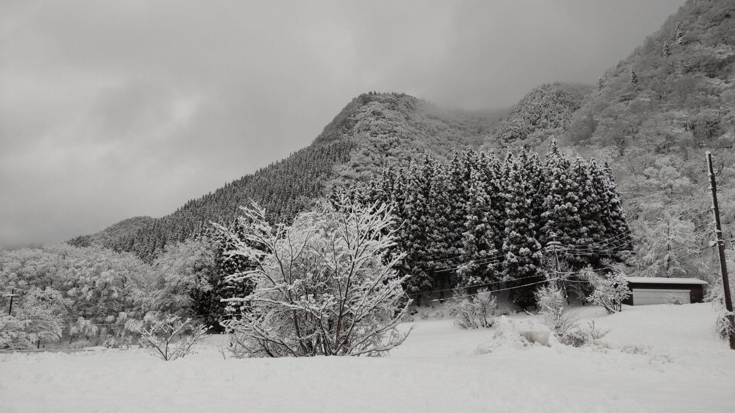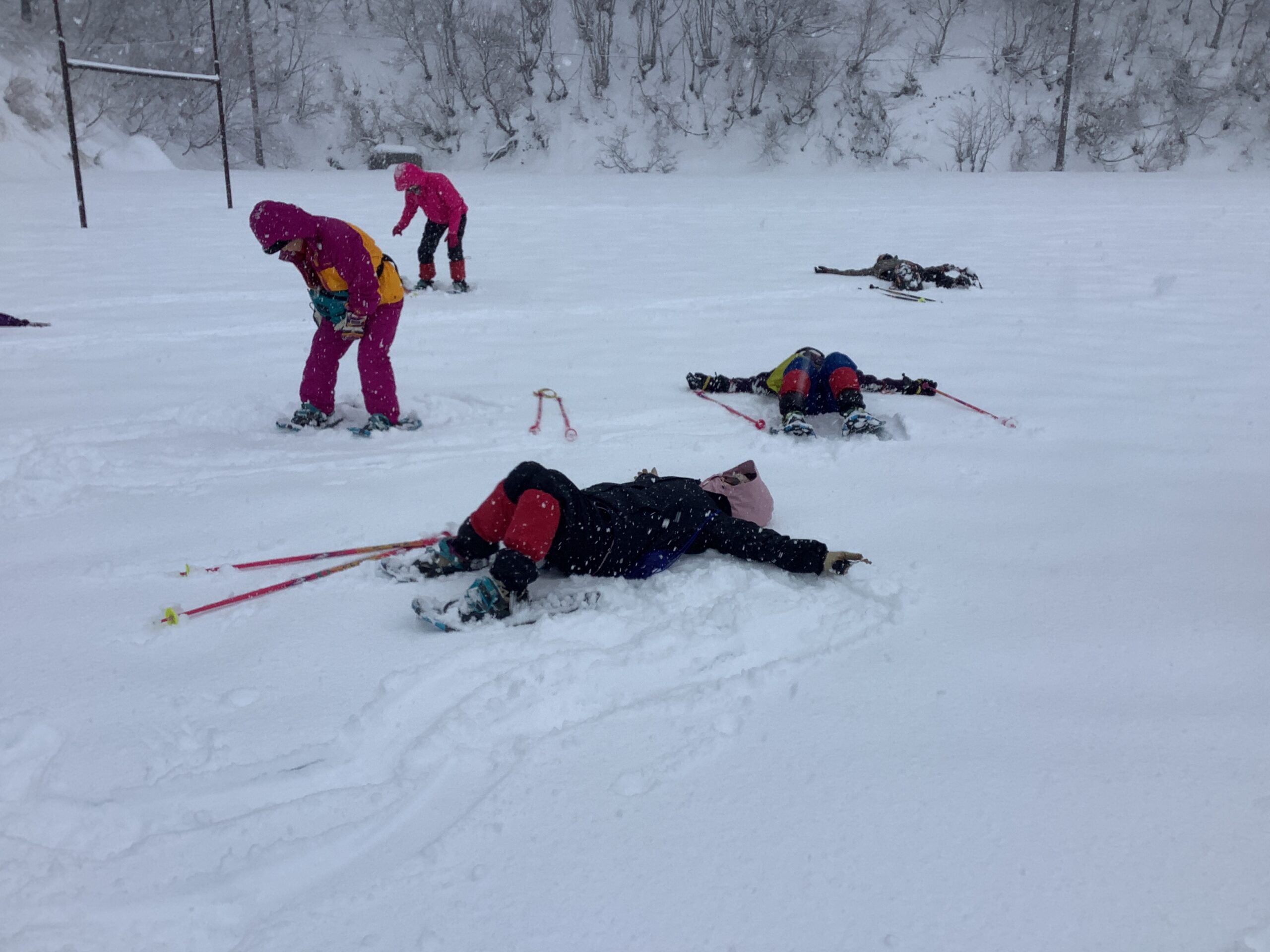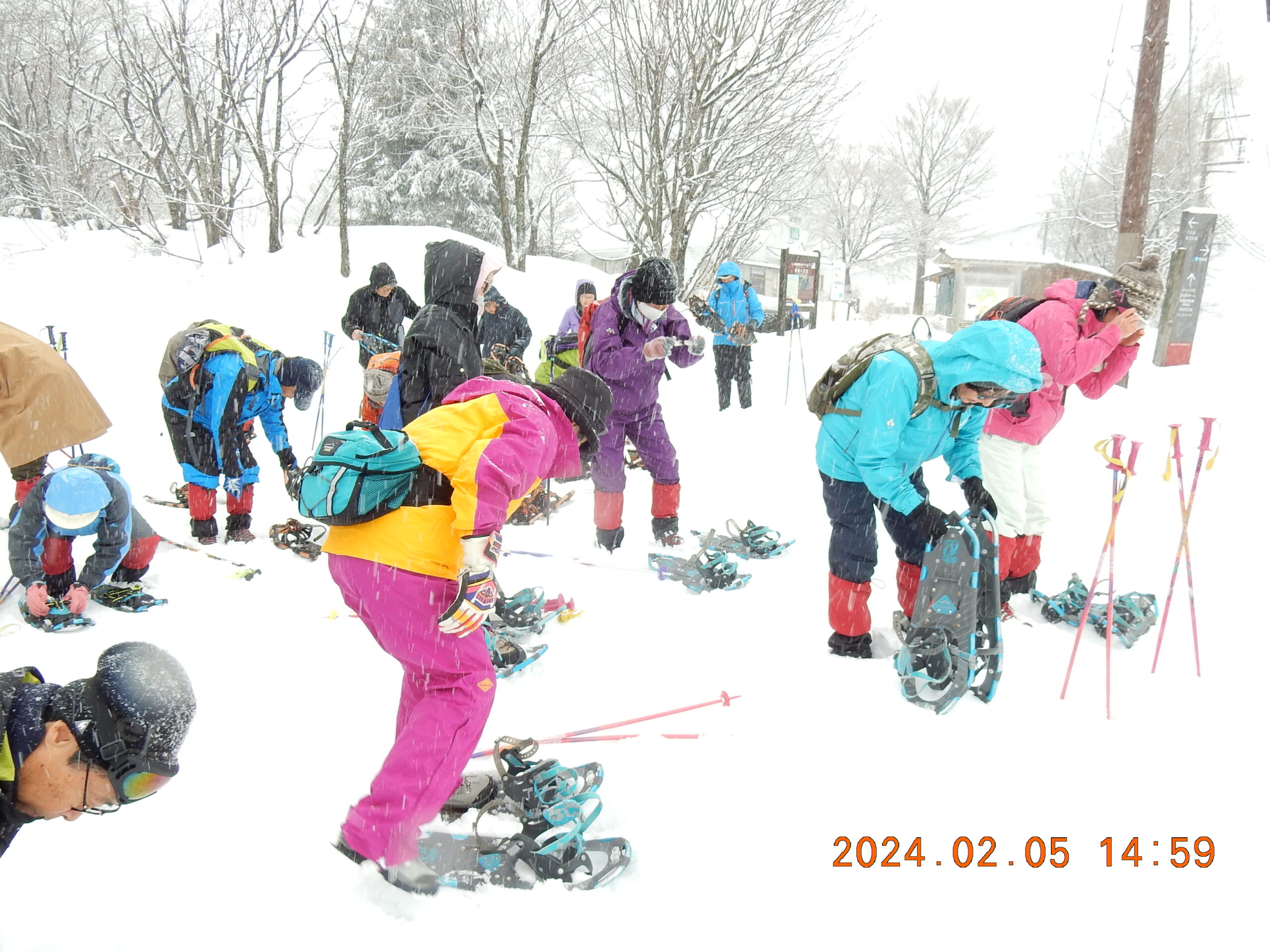 今回初めて1泊での冬のアクティビティ体験を計画しました。早朝から雨模様になりちょっと心配しながら三国ヶ丘から貸し切りバスでスタートです。車中でクイズやゲームでリラックスしながら途中の「道の駅よう但馬蔵」で昼食をとり、美方高原を目指します。ハチ北あたりから雪模様に代わってくれ、山道に入った所でチェーンを巻き雪道を登り現地に到着時には雪となり期待が高まってきましたね。