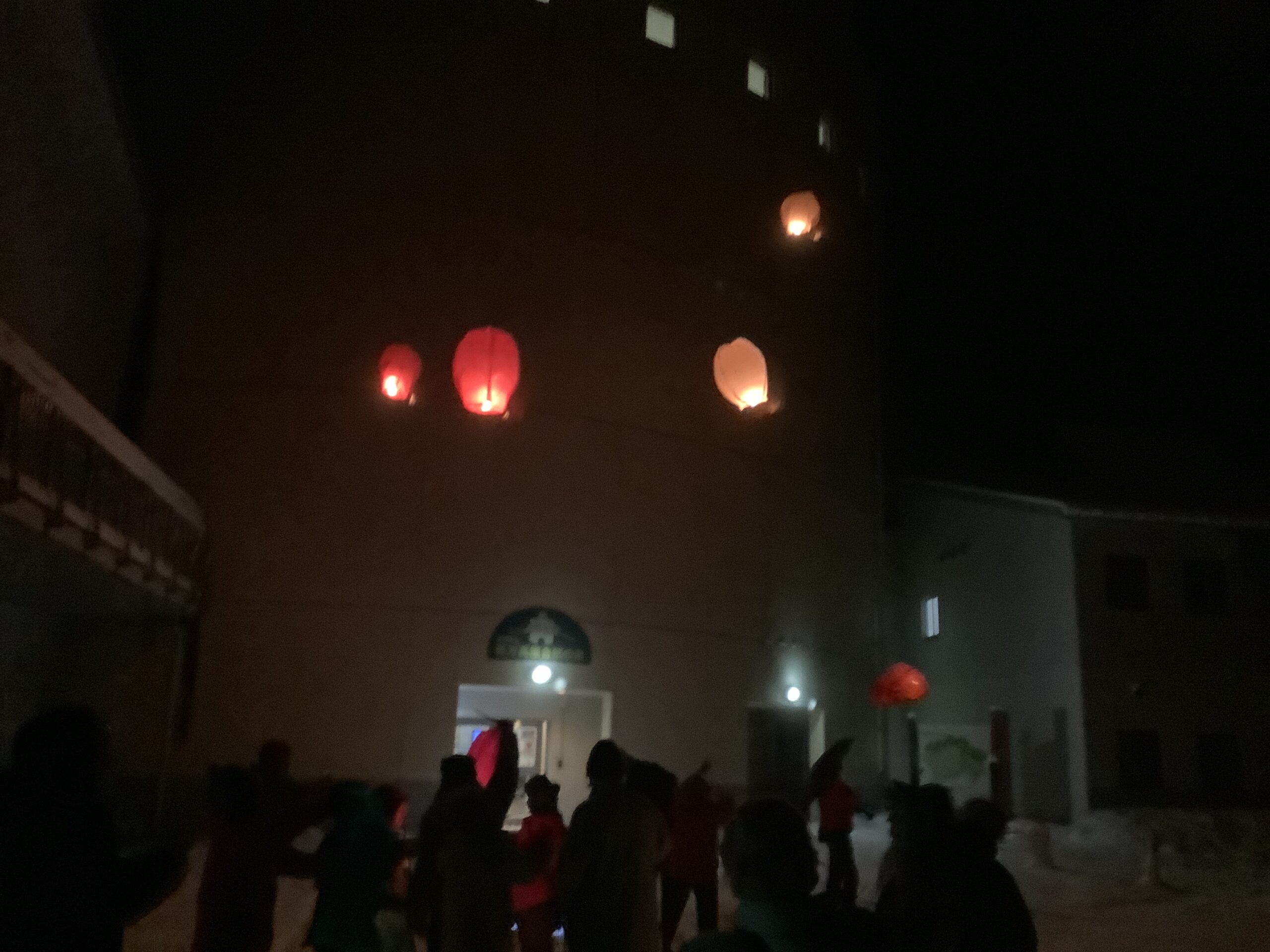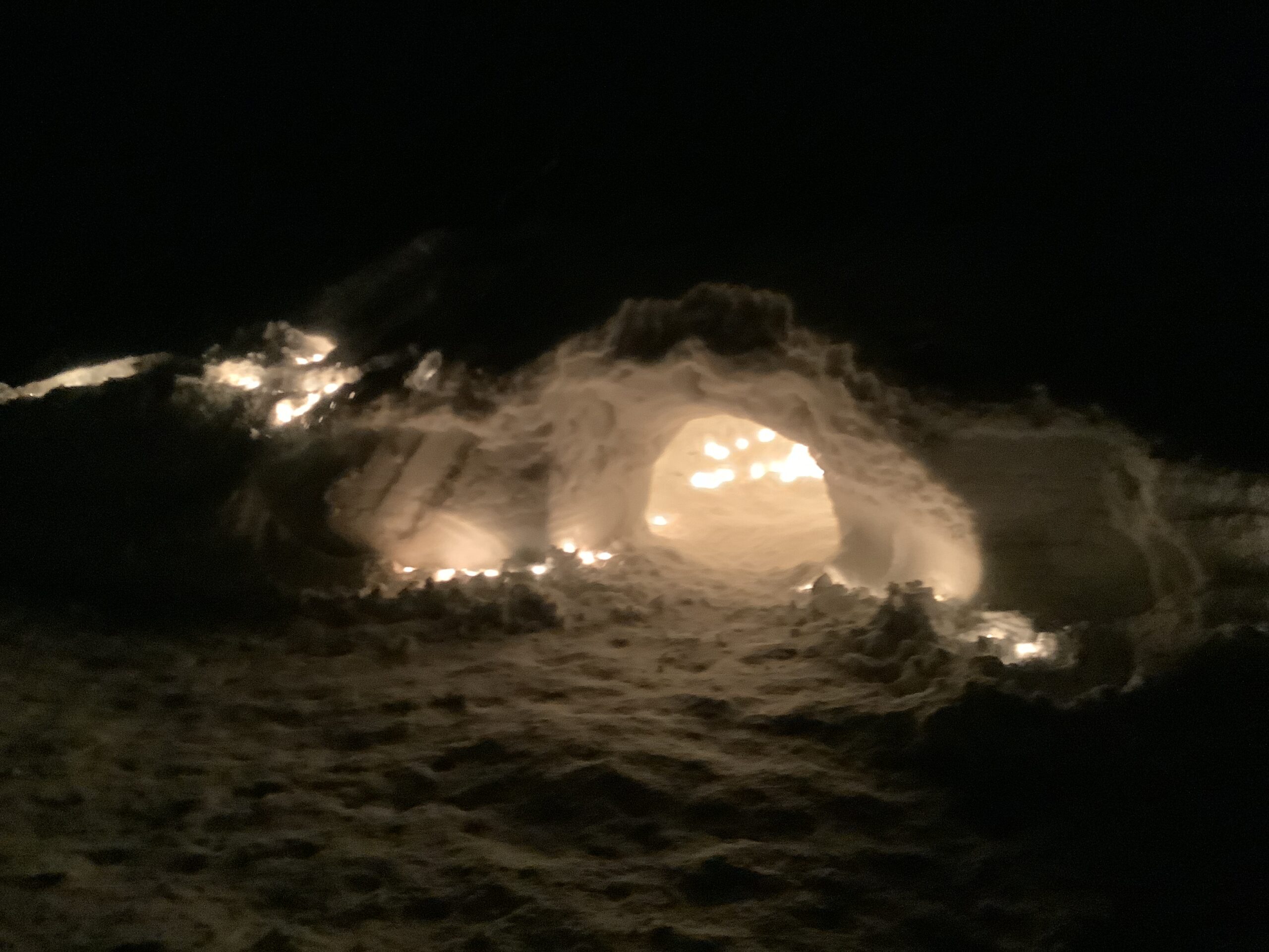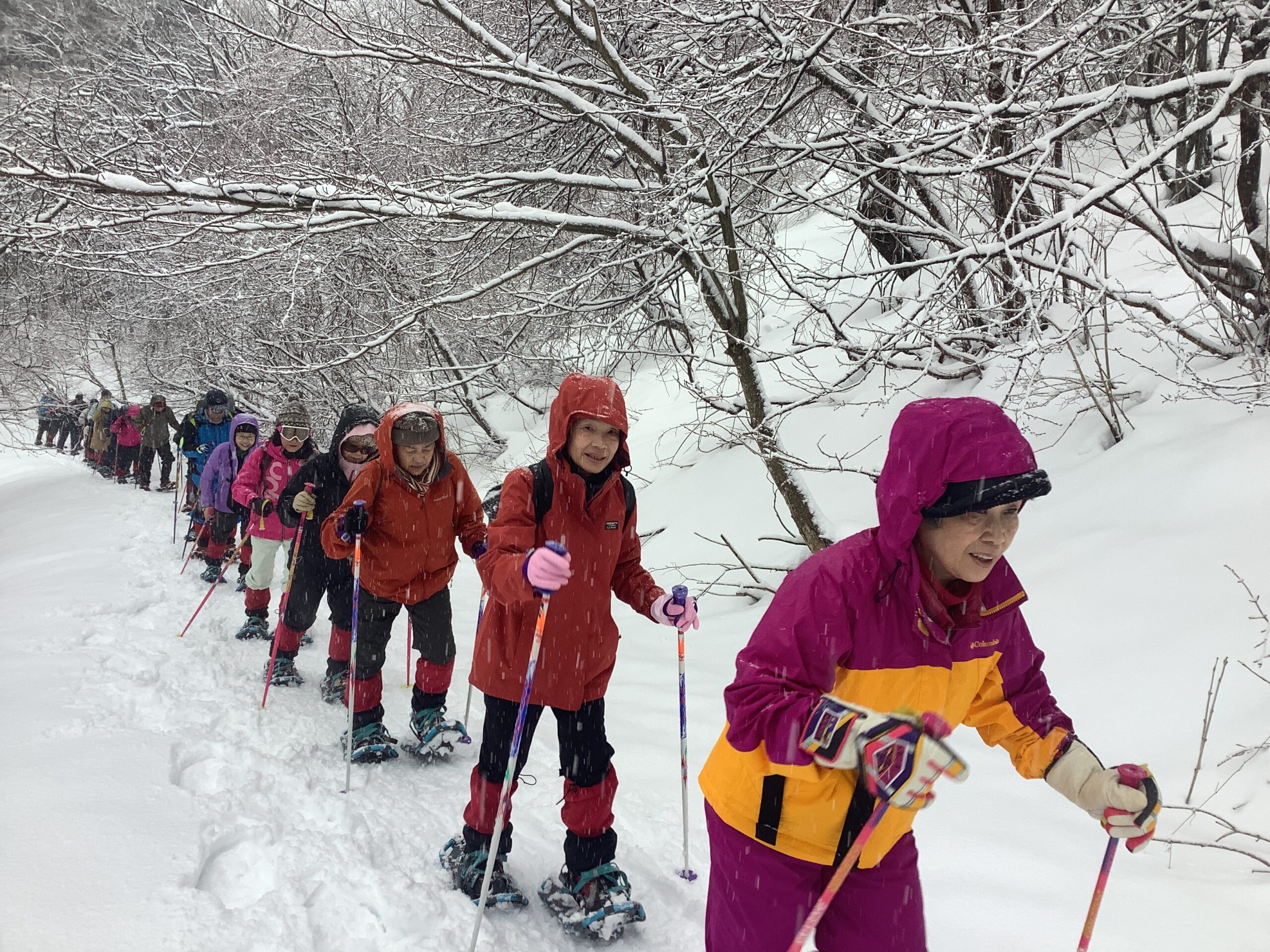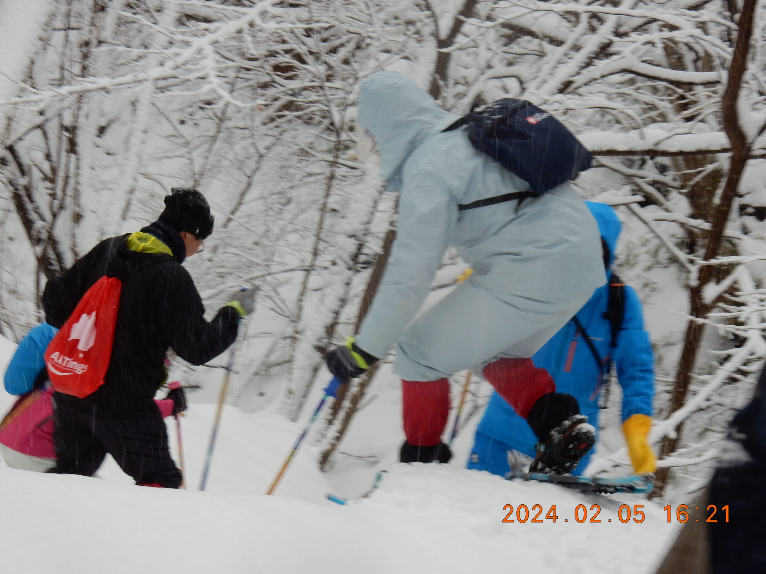 村長さんにオリエンテーションを受けてスノーシューは、なにしろ初めてのメンバーがほとんどですので準備に戸惑いながらも早速に準備運動してスタート。先導のリーダーに続いて一列でゆっくり進むのですが慣れるまでなかなか難しい。皆さんやる気満々でおしゃべりする余裕も出てきたようです。途中でコーヒータイムした後、新雪の中、ラッセルする箇所や雪の中に仰向けになる経験もしながら面白いスノーシュー体験が出来ました。季節のお鍋の夕食で盛り上がった後は屋外でキャンドルに照らされた【かまくら=雪ドーム】を経験し、各々が作った【紙のランタン】で固形燃料に火をつけてスカイランタンを夜空に飛ばしました、雪が舞う中幻想的なムードに浸りました事にしときましょう。