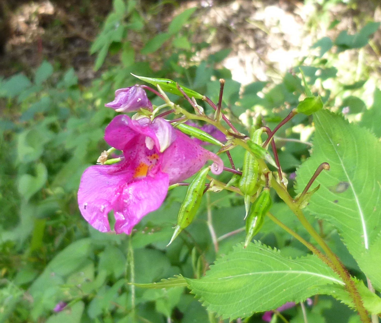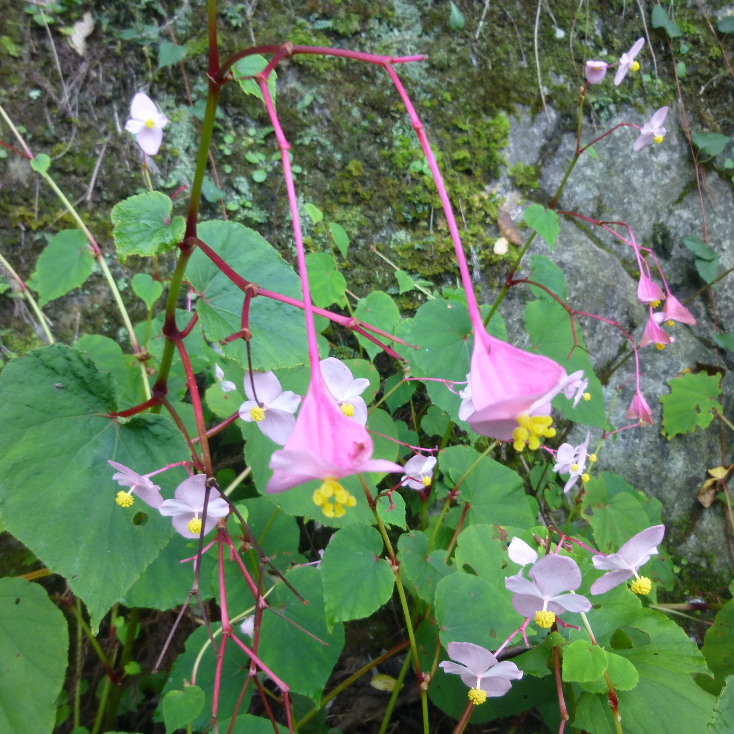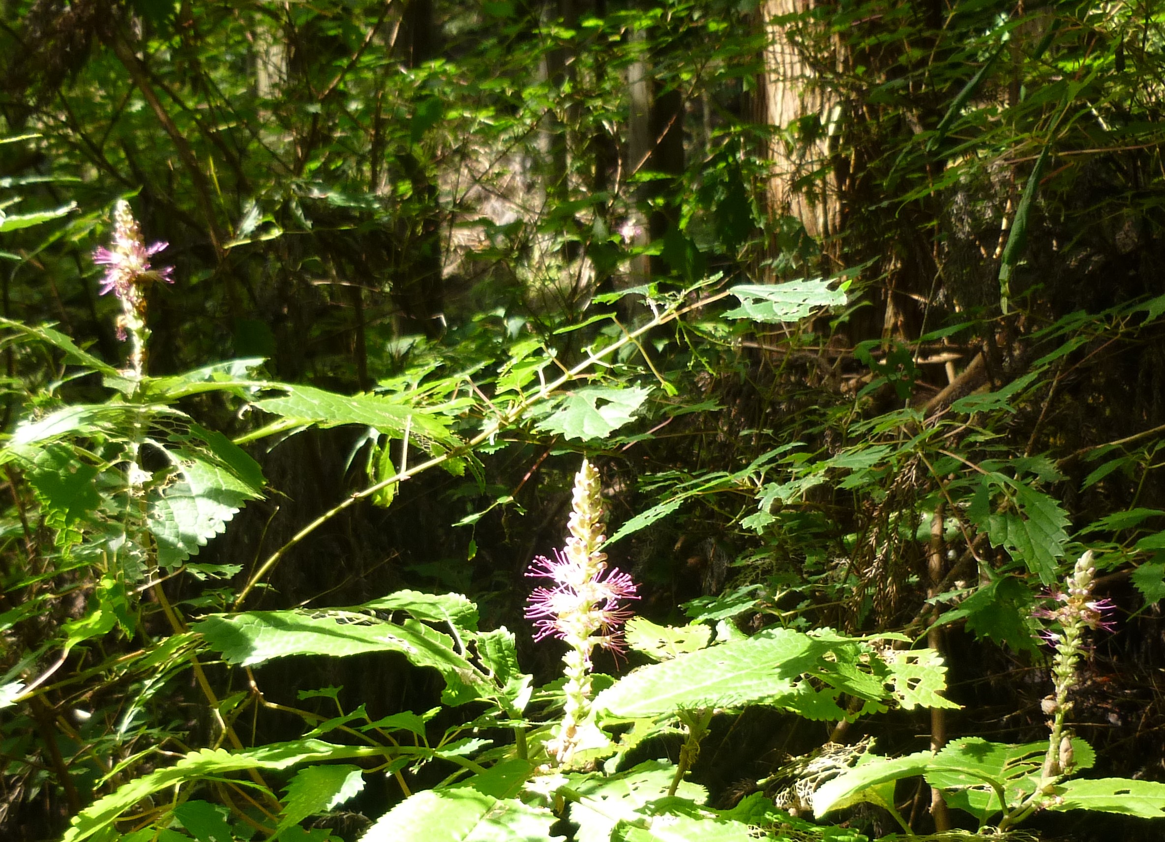 10月に入っても気温30度の残暑の中、金剛登山口に集合しました。 自家用車組が、バス組の到着を待って出席確認後、黒栂谷へ出発。早速シュウカイドウが坂道の両側に咲き誇っています。混生のミズヒキ・キンミズヒキ・ハキダメギク・ヨシノアザミ・ゲンノショウコ(民間薬の代表的植物)・イヌタデ(アカマンマ)=⁂同じくタデ科のヤナギタデは葉に辛みがあり刺身のつま等に使われますが、イヌタデは辛みがなく役立たずを意味するイヌがついたそうです。イヌショウマ=⁂同様にサラシナショウマは根茎を漢方で解熱・解毒薬として薬効が認められますが、イヌショウマは薬効がないのでイヌの名を冠せられたそうです。ツリフネソウ(帆掛け船を吊り下げたように見えることが名前の由来とされる)は果実が熟して触れると種子が弾けます。よく目立つのは花序が大きく白色の小さな花を多数つけるシシウド、白い米粒のような花を咲かせるオトコエシ、株いっぱいに花をつけているイタドリ(春に出る新芽は山菜として食べられますが、蓚酸を含むので多食は禁物)