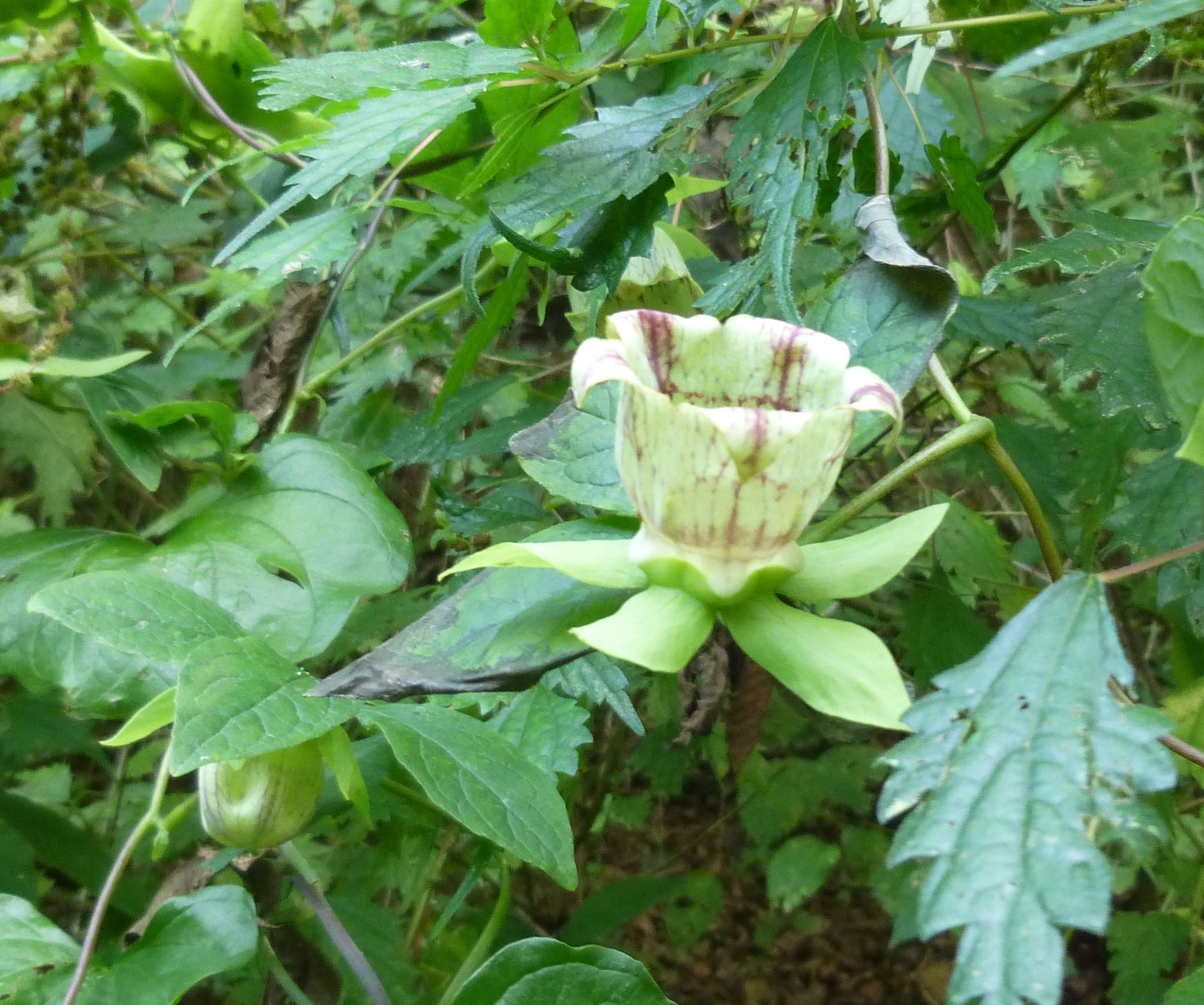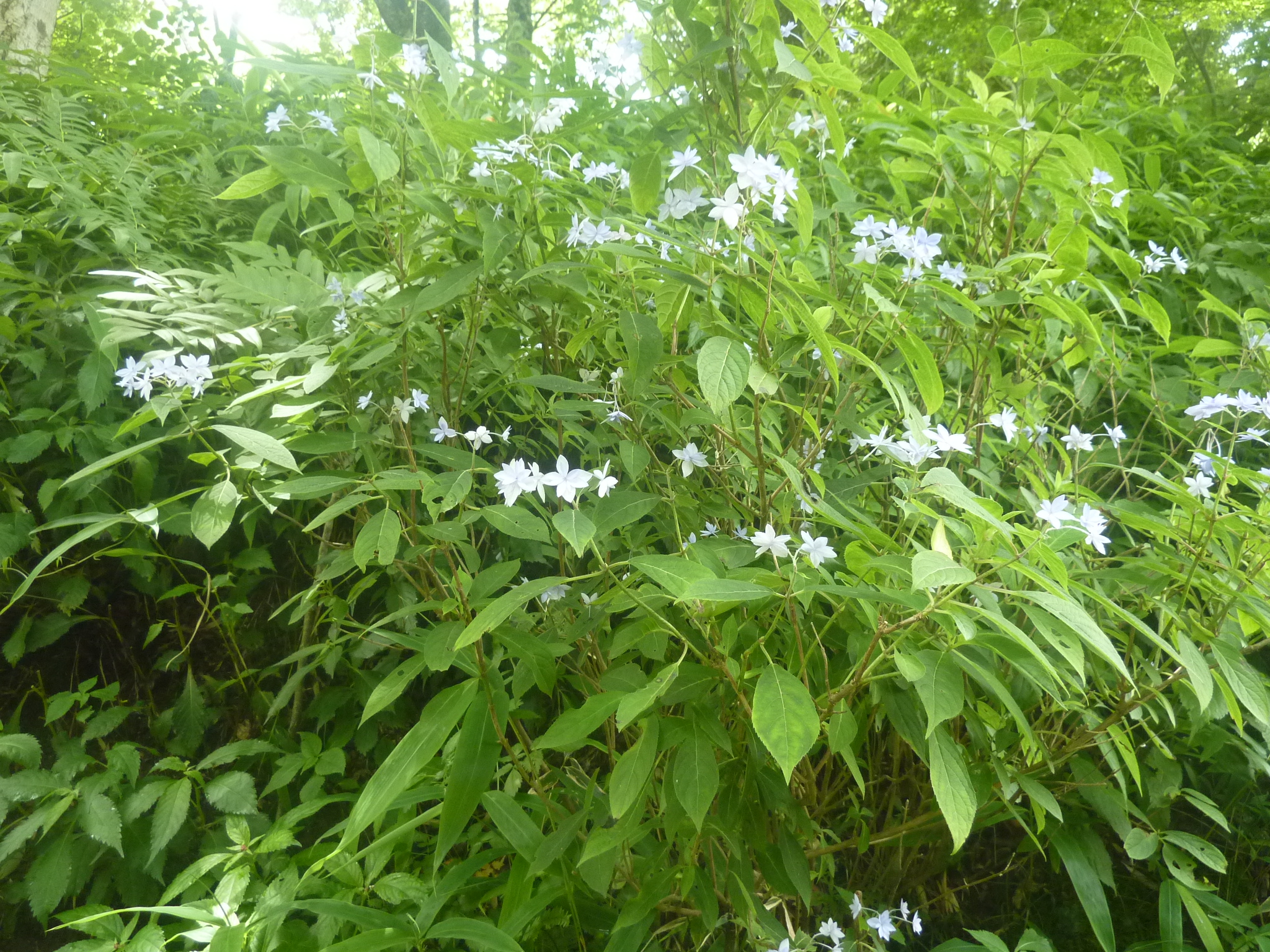 その昼食場所に、今年は特に綺麗で立派に咲いたと高い評価のアケボノソウ、キク科の多年草で約1メートルの茎は直立し黄色い花を総状につけるオタカラコウ(雄宝香)茎が途中で成長が止まり、放射状に枝を広げたヤブタバコ、さらに山道を歩くとコミノサルトリイバラ(実);葉も実もサルトリイバラに酷似しているが、ひと回り位小さい。その美しさに思わず振り向いたといわれるシソ科の落葉低木;ミカエリソウが淡いピンクの花を咲かせている。キキョウ科の蔓性の多年草;ツルニンジンが白緑色で内側に紫褐色の斑点がある鐘形花を咲かせている。