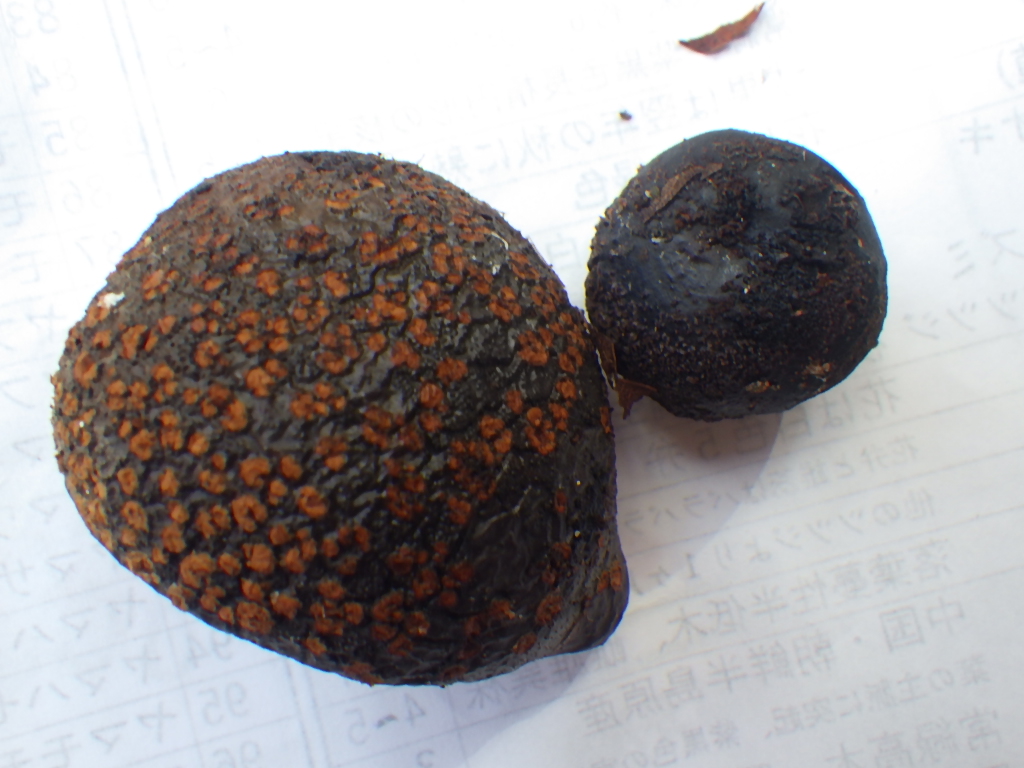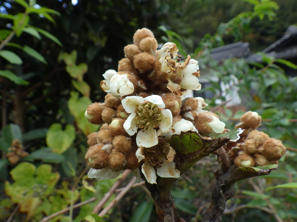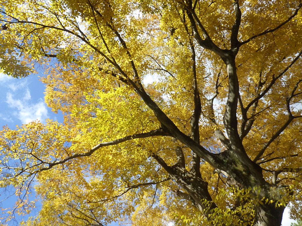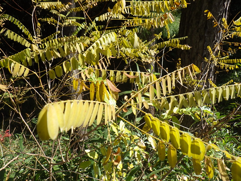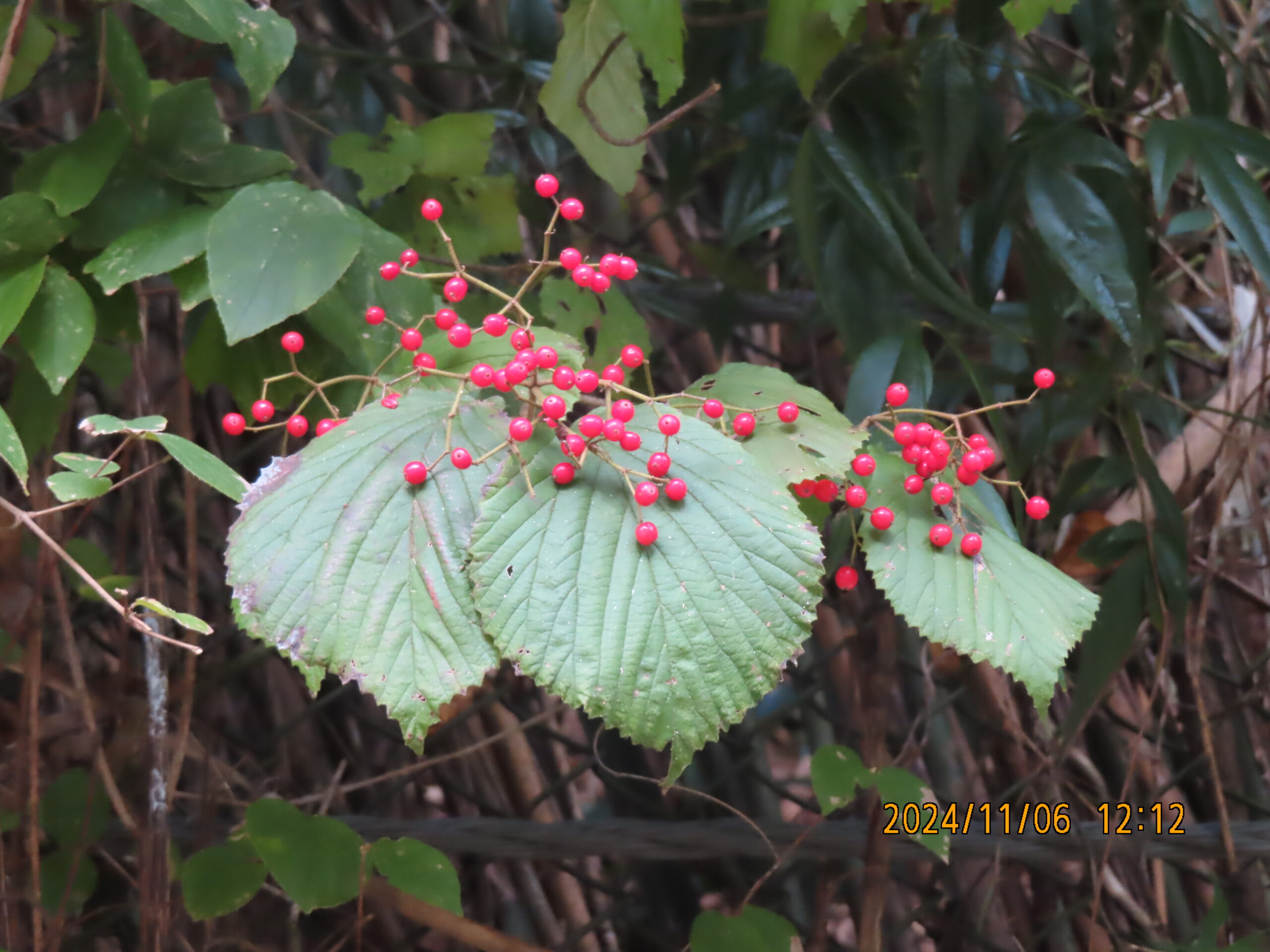 梅の里にはエノキの大木が何本もあり、空に黄葉をひろげていた。聞き慣れないキダチコマツナギ(木立駒繋・マメ科)は花や細長い実はコマツナギとそっくりだが何しろこちらは2mを超す大きさになる。横に枝を伸ばしたカマツカやミズキ、ヤマボウシの紅葉は少し控え目な感じ。モチツツジはまだピンク色の花を付けていたり、葉が濃い紅色に紅葉しているもの緑のままのものなど様々。大きな葉が黄葉していたのはムクロジで枝先には実も残っていた。びっしり黒い実を付けているヒサカキ。モチノキ科のタラヨウは艶のある緑の葉に赤い実が可愛い。トチノキの大きな実も見付けた。クサギは実は無くなっていたが紅色の萼片が残っていて眼を引く。またヌルデに大きな手触りの良い虫こぶ(ヌルデノミミフシ)が付いていたが、これはヌルデシロアブラムシと云う昆虫が寄生したもので「五倍子」の元となる。陽に映えて美しかったのはイロハモミジやモミジバフウの紅葉。ヤブツバキはまだ蕾だったがサザンカが咲き始めていた。