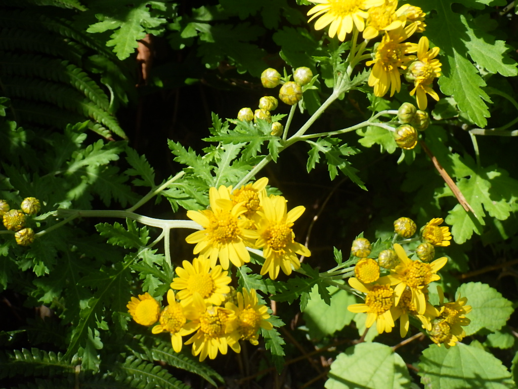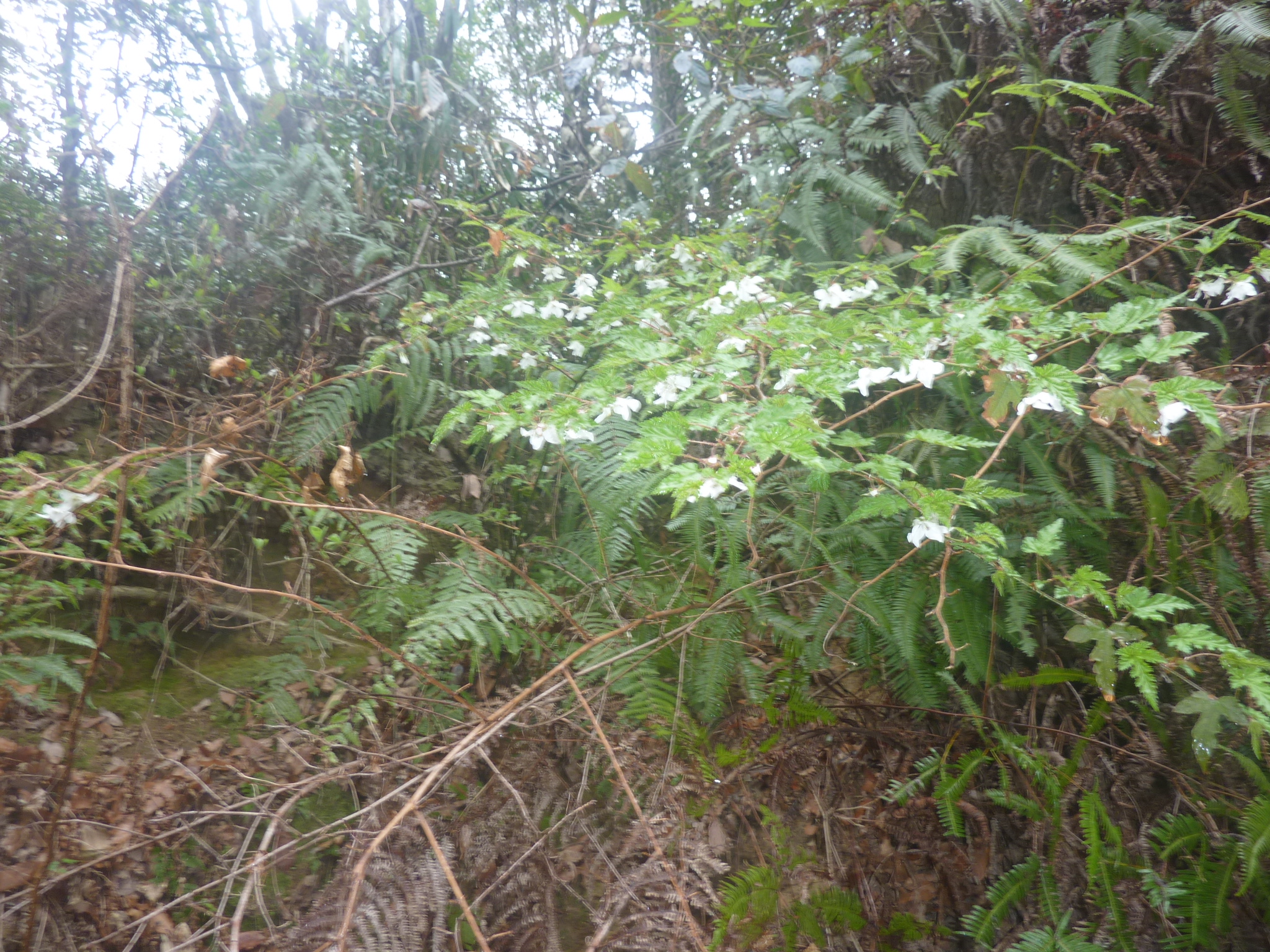 島の谷の入り口でもある蟹井神社に1時間半以上かかりようやく到着。 ここからは緩やかな登り勾配の山道と左側に崖が続く。 崖にはミツデウラボシなどのシダ類や本日お目当ての黄色の野菊アワコガネキクやヤマハッカ、ヨシノアザミの花、イネ科のノガリヤスが続く。樹木のダンコウバイはまだ黄葉には早く、果実も色づいていない。