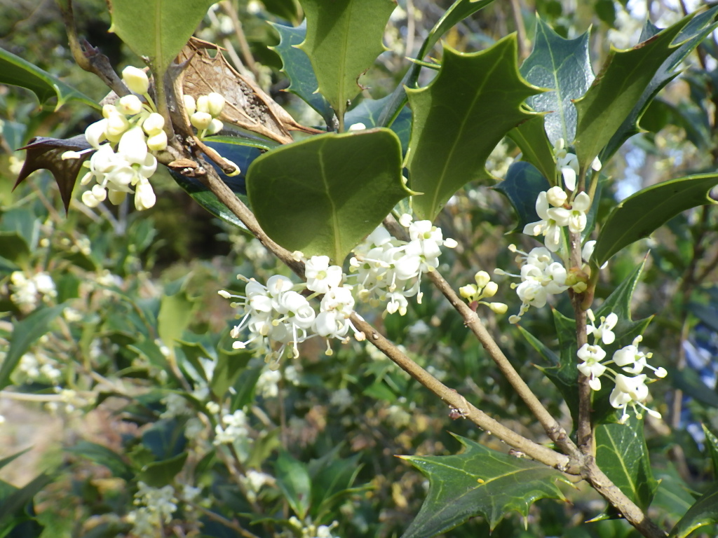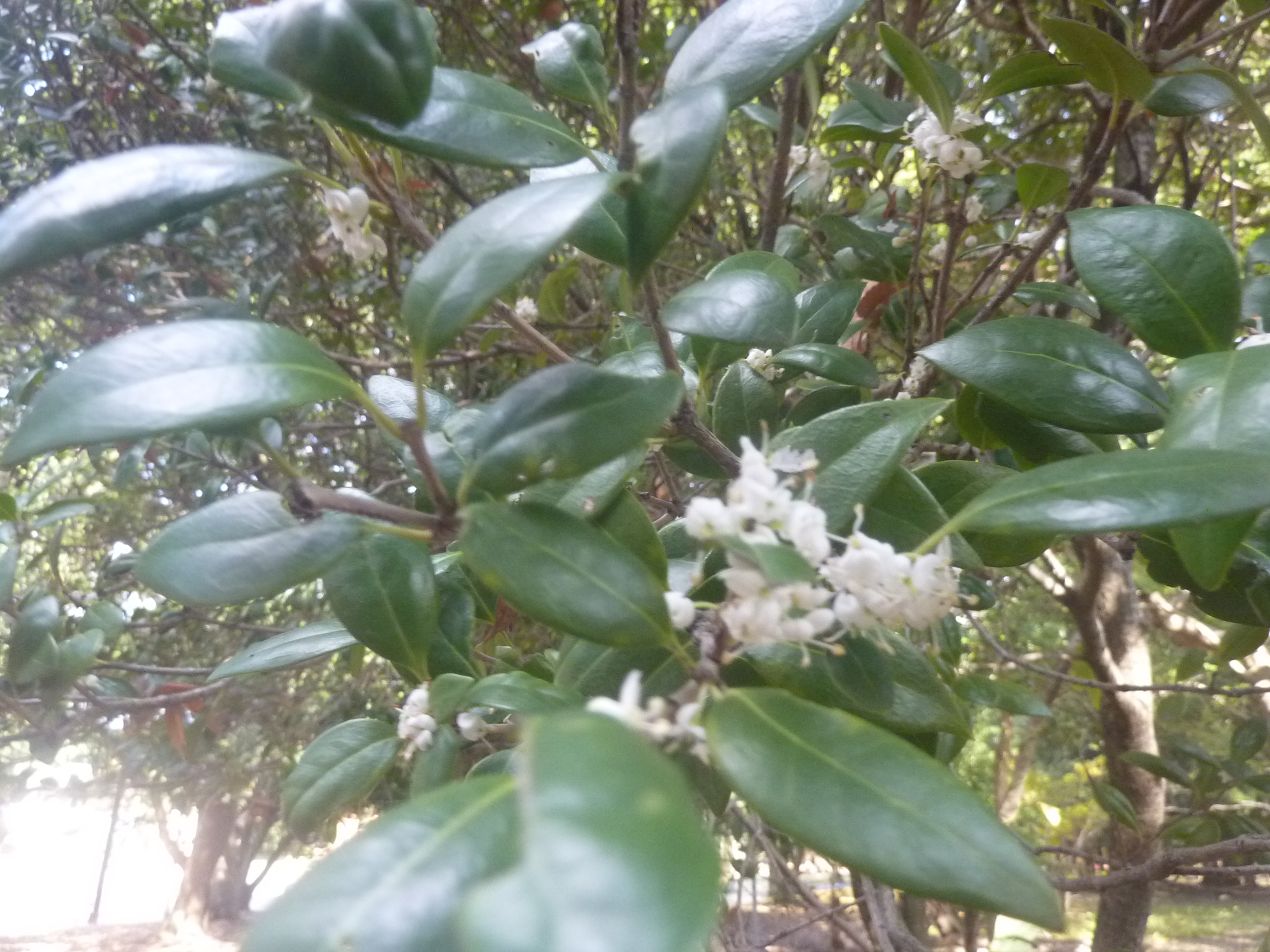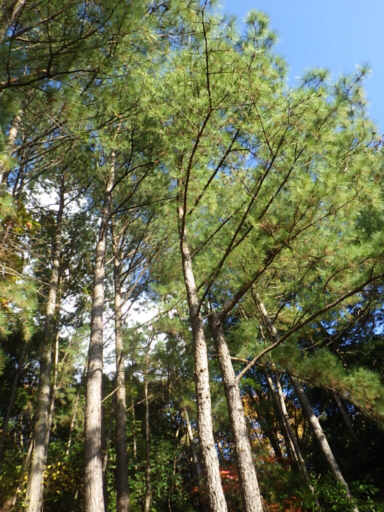 ヒイラギモクセイ(ヒイラギと中国原産のギンモクセイとの雑種)がリストにあったが、ヒイラギとの見分け方が難しそうだ。香りの強さが違うとか、鋭い鋸歯がヒイラギの方が少ないとか皆さん色々教えて下さる。果実は付かないとあるが、庭木や生け垣などにも使われていて案外身近な植物のようである。関心が高かったのはテーダマツ。北米原産で成長が早いとあり35mにもなる巨大松。長さ10~20㎝の葉は日本では珍しい3針葉なので皆さん落ち葉を拾って確かめていた。また10㎝ほどの球果は鋭い棘があり触ると痛い。ここにはかなりの本数があるようだ。同じく北米原産で3針葉のダイオウショウ(ダイオウマツ・大王松)は葉の長さが20~50㎝と長いのでしなだれ、密に付いた様はフワフワした感じになる。成長はテーダマツよりも遅く、錦織公園では見られなかったように思う。