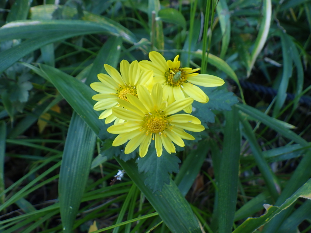 午後は天野川に沿って進むと彼方此方にノコンギク、ヨシノアザミの花や赤いカラスウリの実が目立ち始める。この先には余り民家が無い様に思えるが、車の往来が頻りで注意しながらの観察。路肩にはチジミザサ、ササガヤ、アシボソ、ノガリヤス、アブラススキ等のイネ科やイヌタデなどのタデ科の秋の植物が埋め尽くし、ビワやチャの花が所々に。ノアズキ、ヤブマメは花が残っており、ヌスビトハギやハゼラン、ガマズミは実だけに。川から離れて山道に入った所で、ようやく目的のアワコガネギクの花を見つける。帰り道ではさらに、コウゾリナやセンニンソウの花、フユノハナワラビを見つけ解散となった。