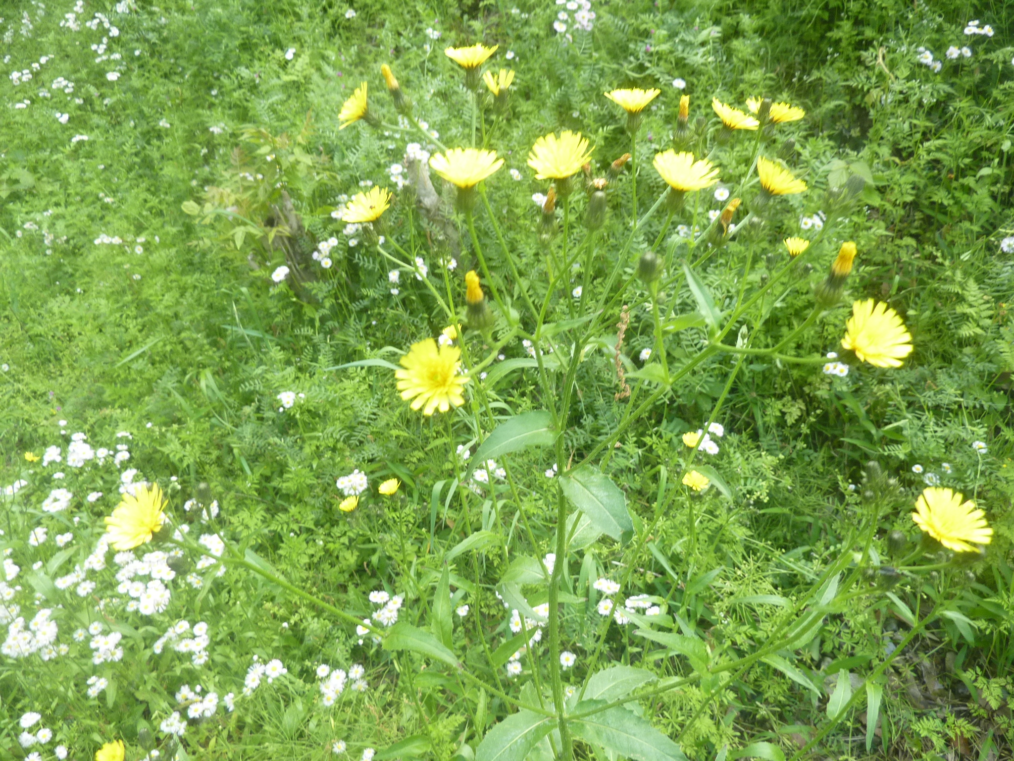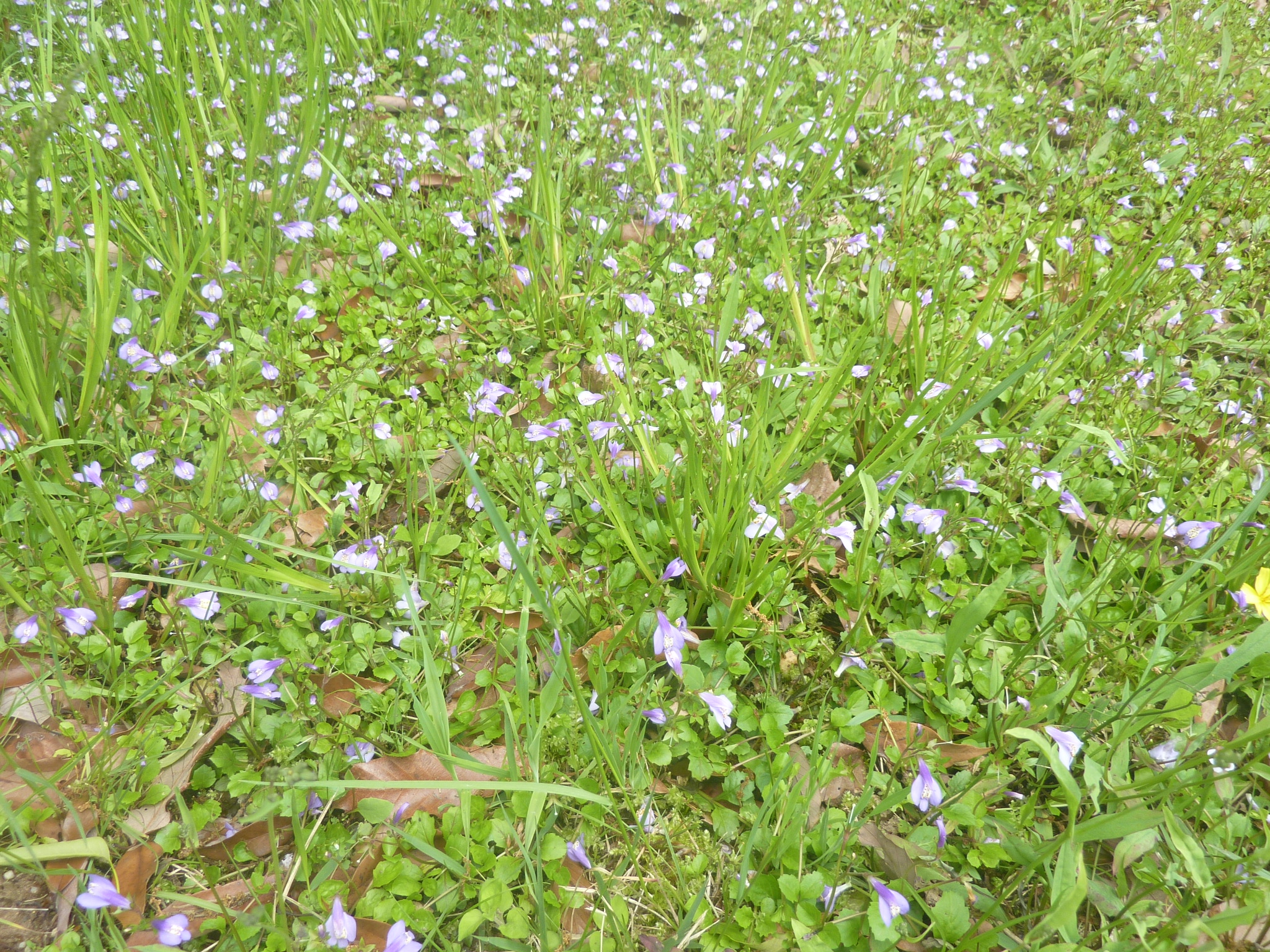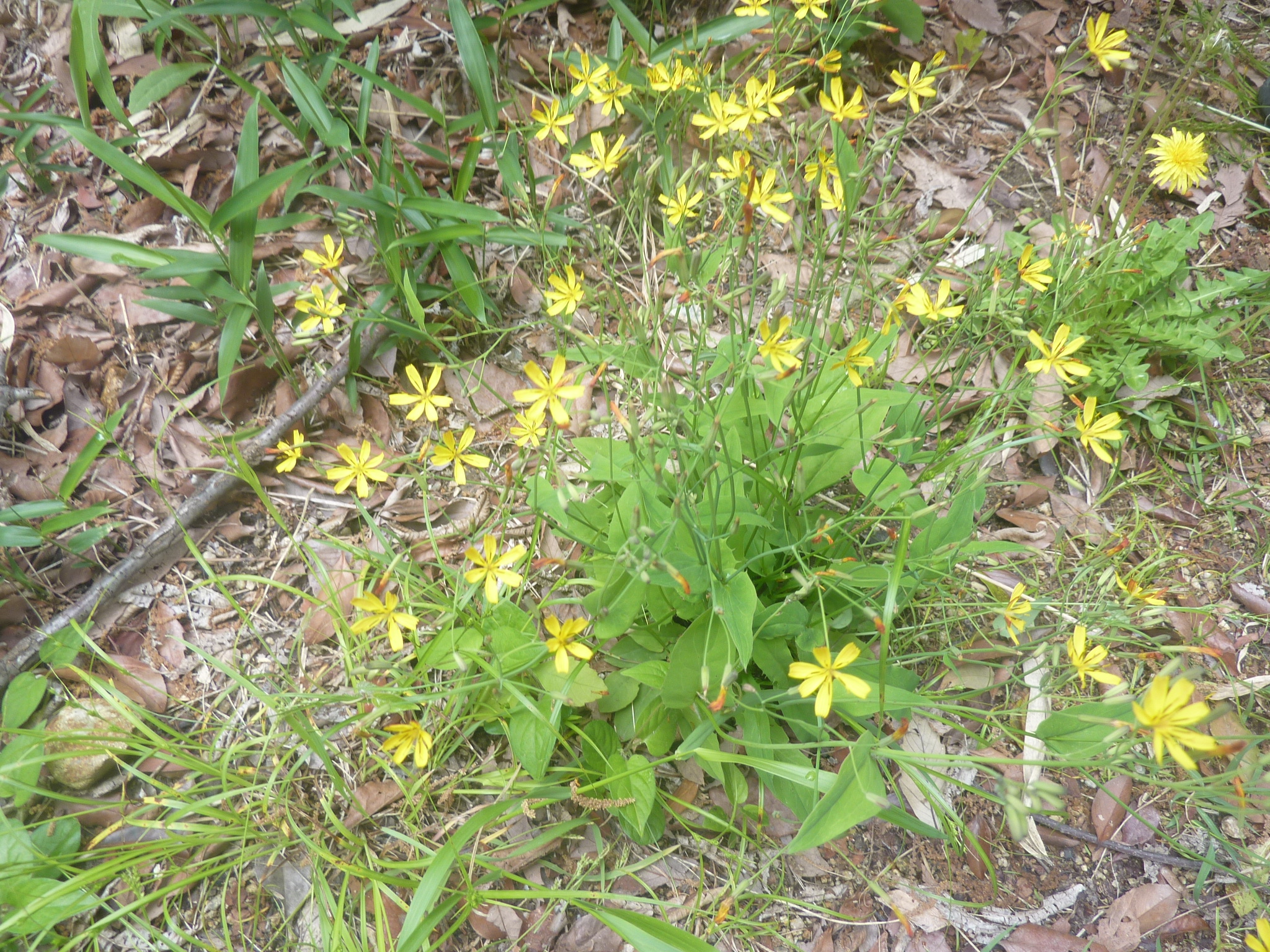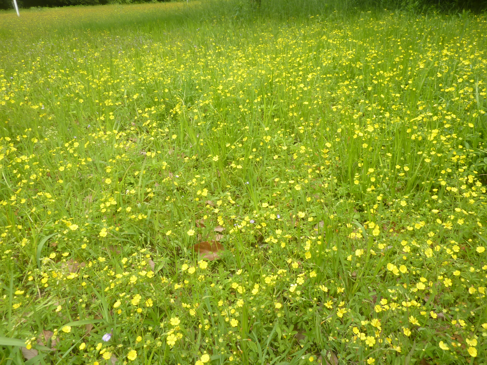 午後は、陶器山を降りて、桃山学院教育大学沿いに南へ、道沿いでは先の草花に加えて、ウマノアシガタ、オッタチカタバミ、オヘビイチゴやユウゲショウ、チチコグサ、トウバナ、ハルジオンなどが群生して咲いている。その先には今日の第二の目的とした花の広場だ。一面にハナニガナ、オヘビイチゴ、ムラサキサギゴケ、ミツバツチグリ、ニワゼキショウなどの花が咲くお花畑が広がる。まるで黄色の絨毯、これだけ一面に咲くと草花でも見事というほかない。その隅では、ヘビイチゴやニョイスミレ、イヌガラシ、ヤブタビラコ、クスダマツメクサの花も・・・。