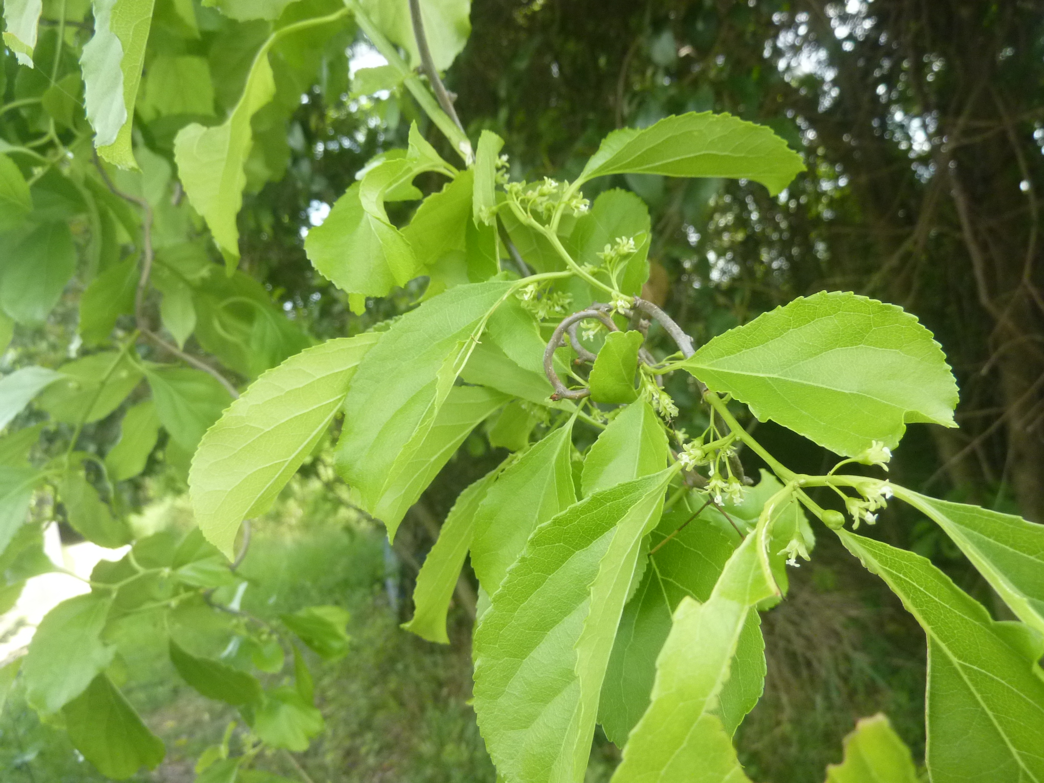 再び尾根道に戻り、ガンピ、カナメモチ、ノイバラの花とコウゾリナの群生を観察。コウゾリナの茎などに触って「それほど痛くないね」との感想。刺の先が二股に別れクッションのような働きをするため見た目よりは痛くはない構造になっていることを後で知る。タカノツメ、ウメモドキ、ツルウメモドキ、ネジキはまだ蕾状態であった。