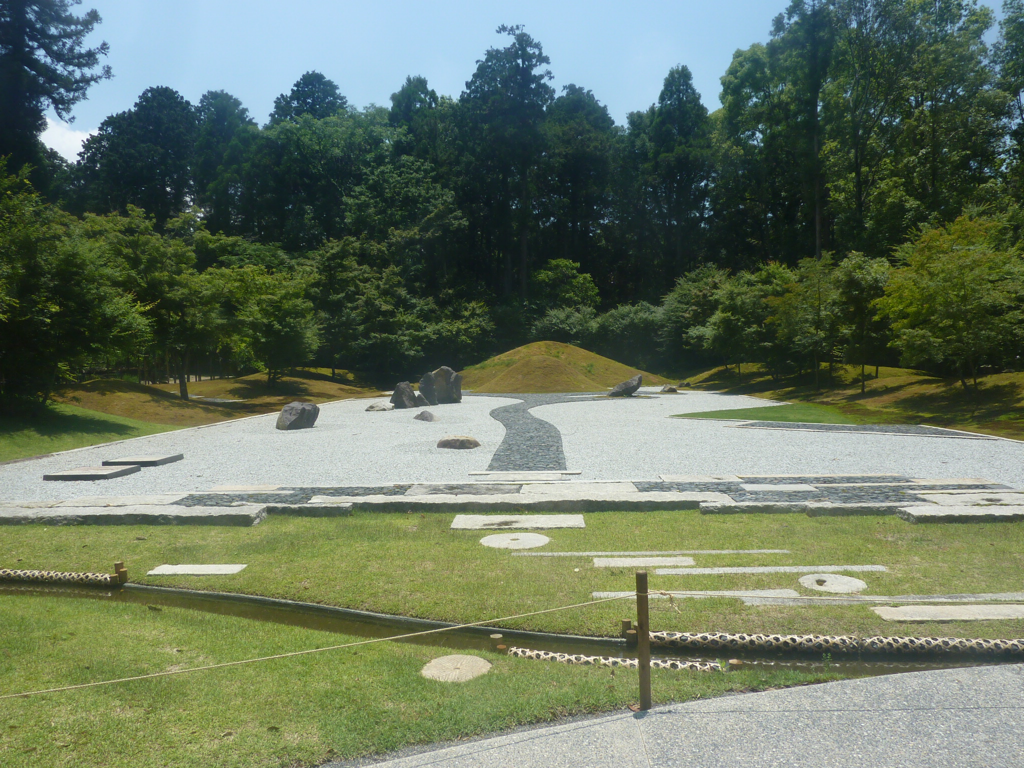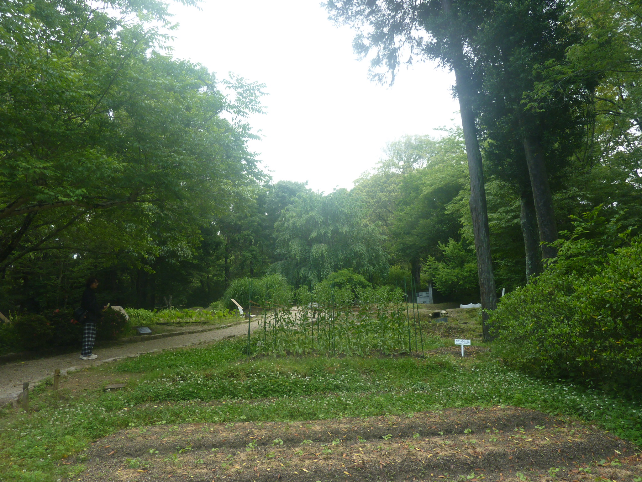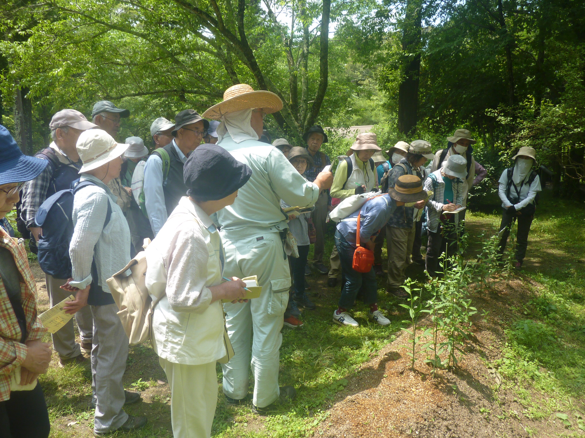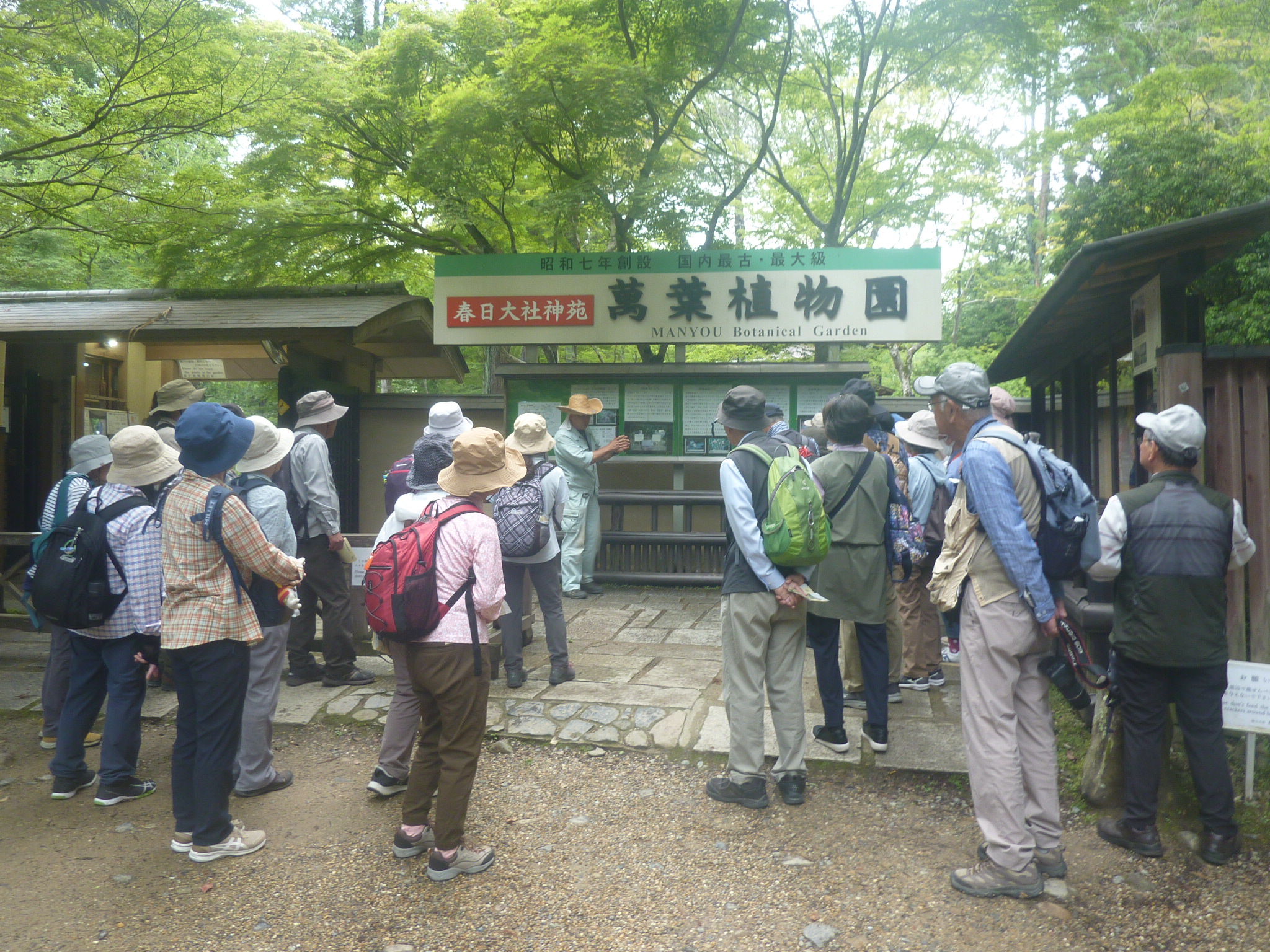 「萬葉集には約180種の万葉名で詠まれた植物が登場し、現代の植物名とは異なるものも多く、多数の植物説があるものが含まれていますので、園内には約300種が万葉植物とされ植栽、育成されています。植物園とありますので、花が見られると思って入ってくる外国の観光客の方もいらっしゃいますが、フジの花が終わった今頃は花が少なく・・・」と園内に入る門の前から本植物園の管理を任されている春日大社職員のKさんの説明から植物解説は始まった。万葉集の中で詠われる全ての植物が順次園内集回路の両側に植えられ、植物毎に万葉植物名、現代植物名、植物名を詠んだ万葉歌とその数、植物の解説板がその前に立っている。園内に入っても、Kさんの饒舌な解説は留まる所を知らない。70種を超える植物を次から次へと休むことなく説明していく。聞き入る我々も、時にはユーモアを混じえた解説ぶりについつい引き込まれ喉の渇きを忘れるほど、あっという間に予定の1時間半を過ぎていました。最後はつい最近一般公開された園内の「神庭」と呼ばれる石庭を案内され、午前の部を終了。部員の皆さんも、疲れも忘れ充分満足したとの声でした。