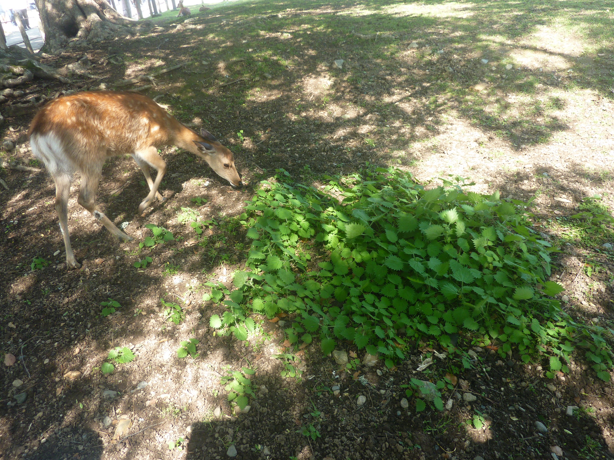 午後は奈良博物館へ行く人たちと離れて、春日大社の境内林と奈良公園の巨樹巡り。大社の南に位置する幹回り5mの巨樹のイチイガシの近くでようやく昼食。食後はスギの巨樹とナギ林を見ながら飛火野へ、林下は鹿の食べないイワヒメワラビやナチシダ、アセビが所々に生えているだけで、ずうっと先まで見通せる。飛火野ではここ春日山原生林で多く生えているイヌガシと野原に孤立するクスノキの巨樹を遠目に見ながら浅茅ヶ原を抜け奈良博物館の南へ、幹から竹が突き出しているムクロジの巨木、花が終わったばかりでまだ花柄を残している刺だらけのサイカチの古木とその隣のアキニレを観察。木の周りは柵で囲まれ、その下では鹿が地面から一面に生えている若草を残して周りの僅かな草を採餌している。鹿の食べない草とは何?イラクサ?ここを最後に本日の部会はお開きとなった。